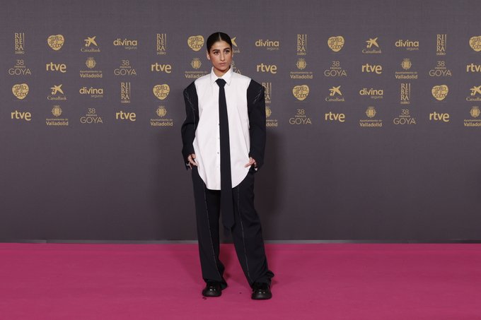 Rompiendo con la tónica, con una propuesta tomboy Carolina Yuste ha paseado con pantalón corbata y chaqueta XXL de la valenciana Sonia Carrasco y sin tacones, una opción que ha secundado Alba Flores, que con el pelo muy corto ha lucido un diseño de Made By Kös, con cuerpo de encaje y botas militares.