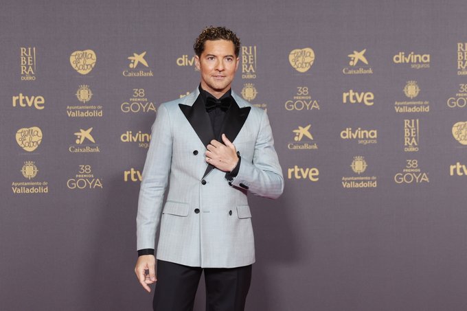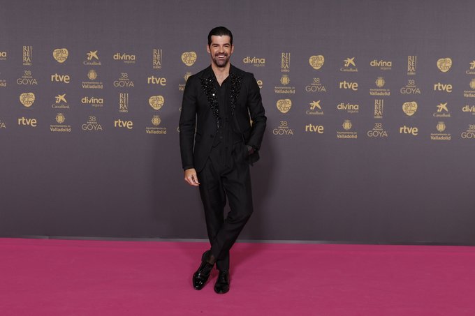 Hugo Silva afronta su primera nominación con un impecable esmoquin de terciopelo negro, camisa estampada con geométricos en gris y negro de Lander Urquijo, quien también ha vestido a Alfonso Bassave, muy estilo años 80.