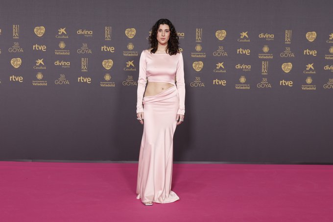 Sybilla ha diseñado para Anna Castillo un vestido negro de tres piezas unidas con hilo invisible. De negro también Belén Cuesta con un vestido-abrigo con cristales.