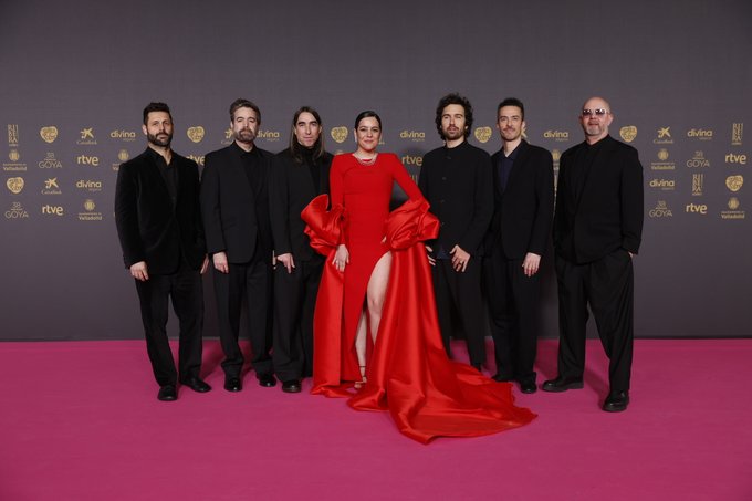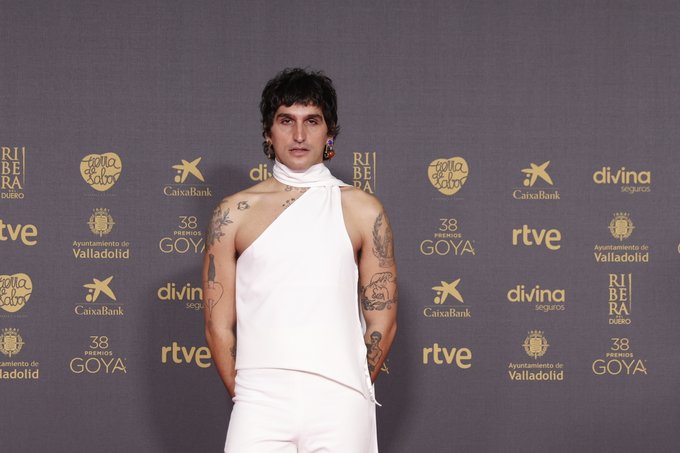 La cantante y actriz ha aparecido junto a Javier Calvo y Javier Ambrossi, ambos de negro con creaciones de Palomo Spain. Calvo con esmoquin negro con detalles en raso y pantalón ancho recubierto en encaje y camisa también con encaje y lazos.
