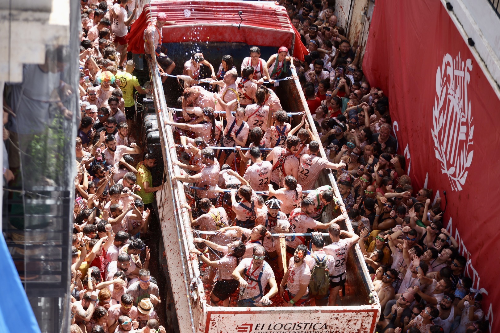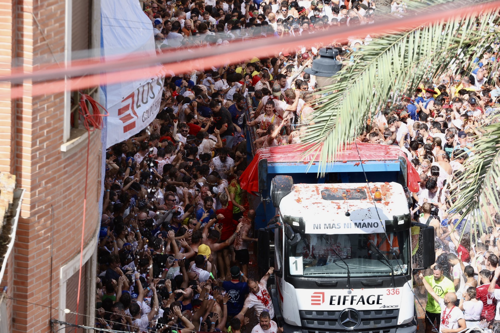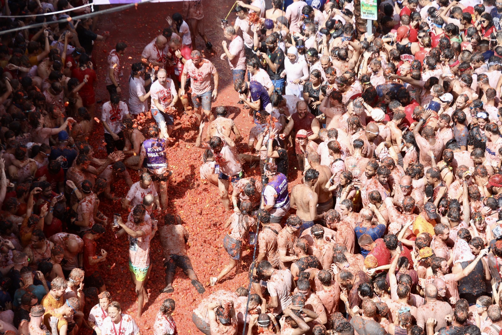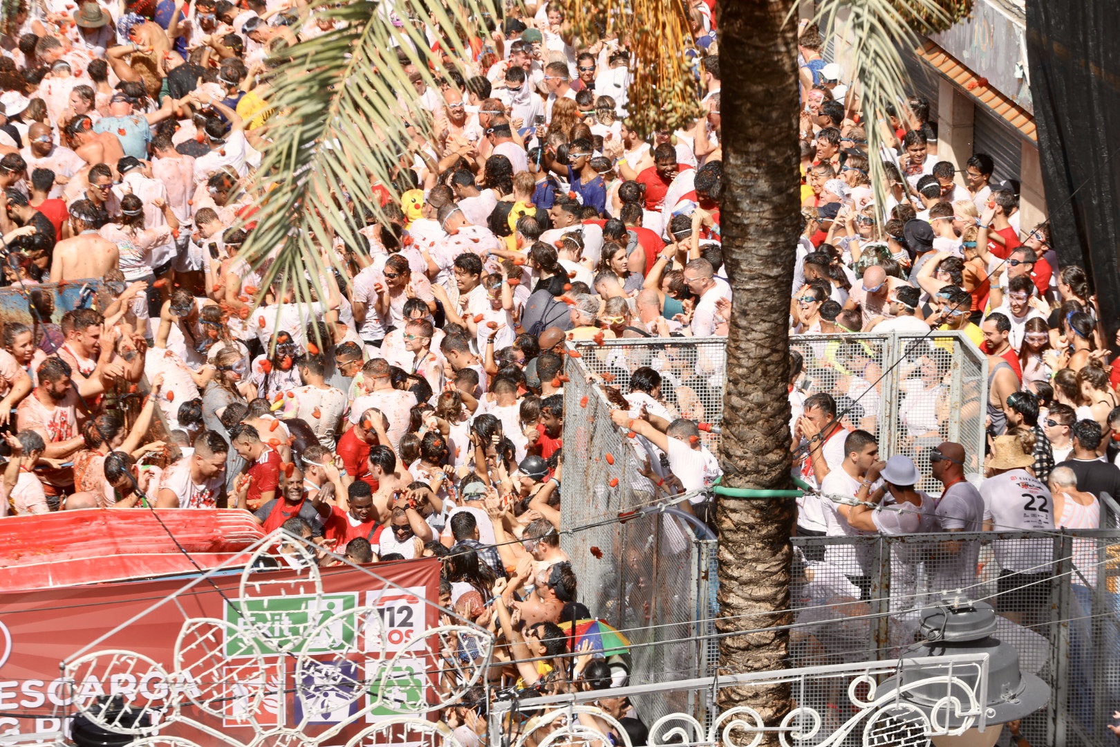 La Tomatina ha empezado a las 12.00 horas y, como es habitual, ha recorrido las calles Santo Luis y Cid hasta el puente de la República. Una hora después ha finalizado con la traca final.