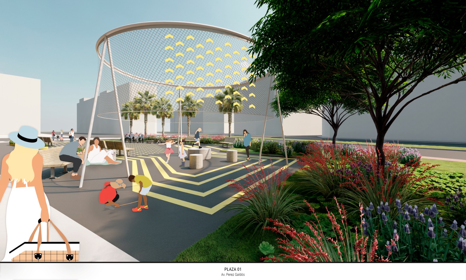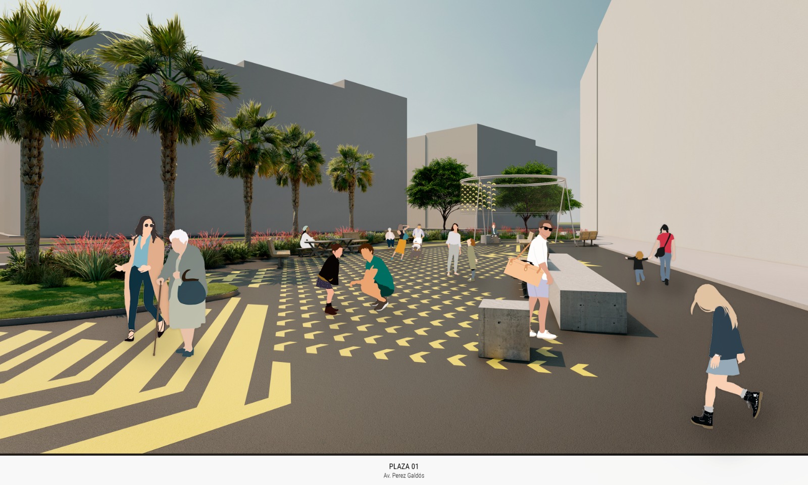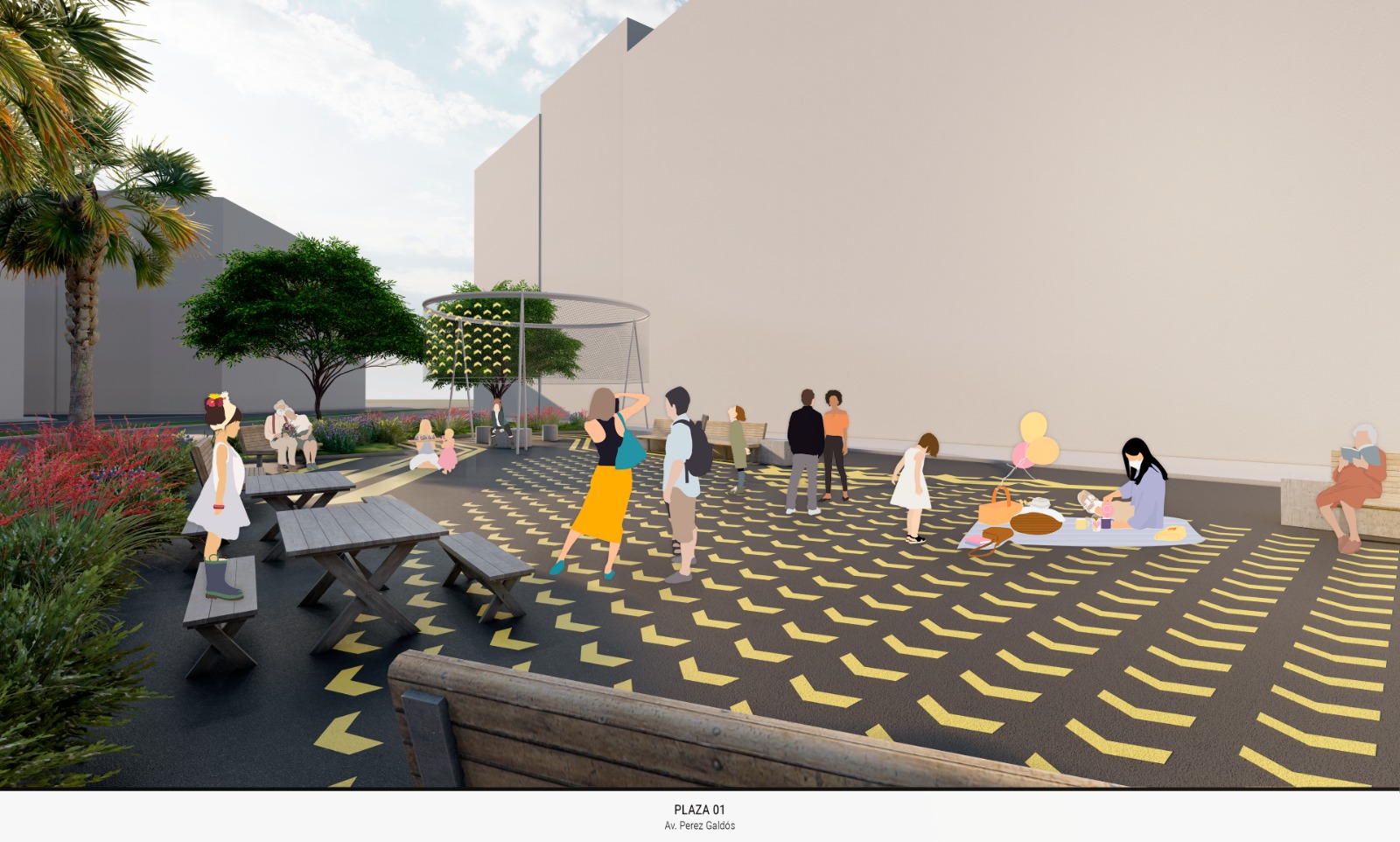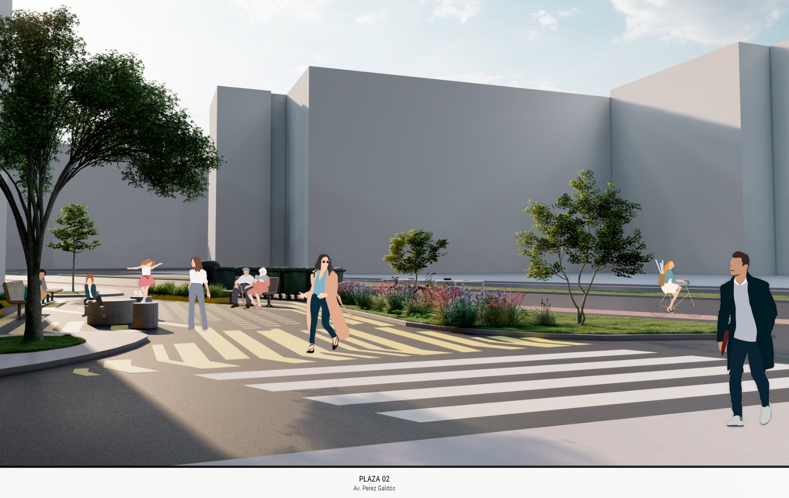 Con este fin, se colocará nuevo mobiliario urbano, como bancos, y mesas de pícnic y se instalará en la plaza de la calle Jesús la estructura de arquitectura efímera que formó parte de la edición de La Valentina del año 2021, reconvirtiéndola en una pérgola que sombreará parte de la plaza y, junto con el pavimento, contribuirá a dotar a este espacio de un diseño e identidad propios. El pavimento de estas plazas distinguirá las zonas peatonales con distintas marcas y grafismos de color ocre. En todo caso, se mantendrá el acceso de vehículos de residentes a los garajes existentes, así como a vehículos de emergencia, separando estas zonas de paso de vehículos y las peatonales con bancos de hormigón, dando así más seguridad a estos nuevos espacios de estancia.