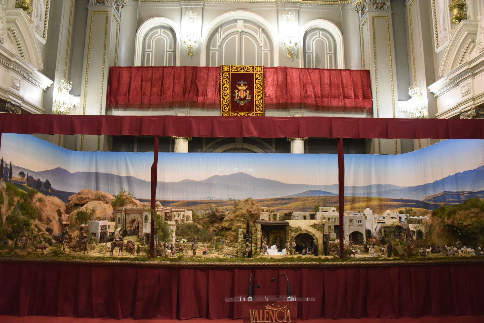 Con casi 40 m² de superficie (4,10 m de fondo y 9,40 m de largo), el Belén del Salón de Cristal ofrecerá una escenografía panorámica diseñada por la Asociación de Belenistas de València, creadora del montaje desde 2016.