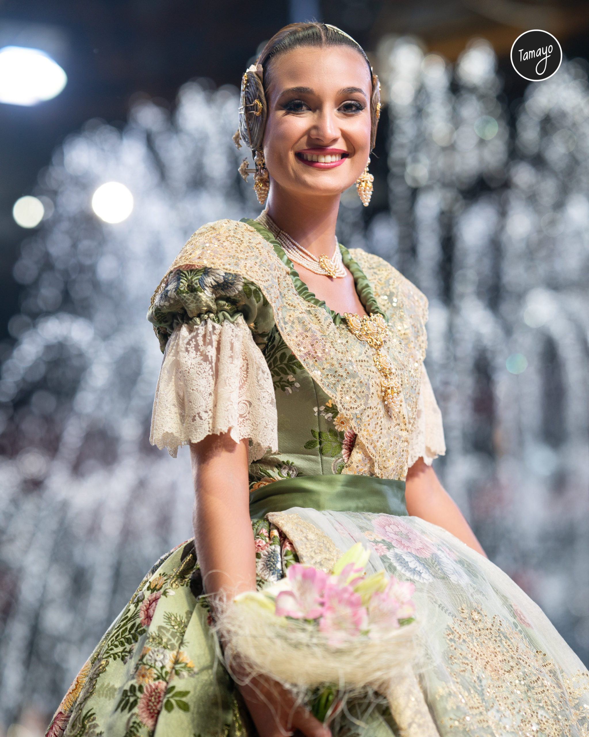El traje que Berta lució en la Fonteta tiene un significado especial para ella. La tela, llamada ‘San Nicolás’, fue confeccionada por la Compañía Valenciana de la Seda, en un tono denominado ‘verde especial’, en homenaje a su comisión en el 150 aniversario. El traje fue elaborado por Ernesto De Sostoa, quien además de ser su indumentarista, es un amigo cercano de la familia y miembro de la misma falla, lo que añade un valor sentimental a la indumentaria.