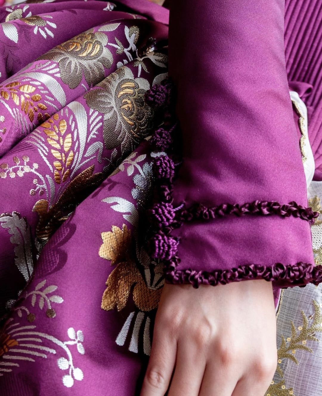 Este traje destaca por su exclusivo tejido Inmaculada en fondo grosella, elaborado con una técnica minuciosa que incluye hasta 12 metales diferentes en la trama, una particularidad que otorga al traje una textura y brillo incomparables. La calidad y la exclusividad del tejido reflejan el trabajo meticuloso y la innovación de Jorge Fabuel en la confección de trajes de valenciana, haciendo de este traje una pieza irrepetible y singular en la colección de la Fallera Mayor.