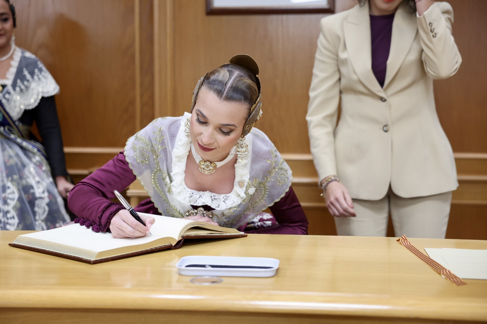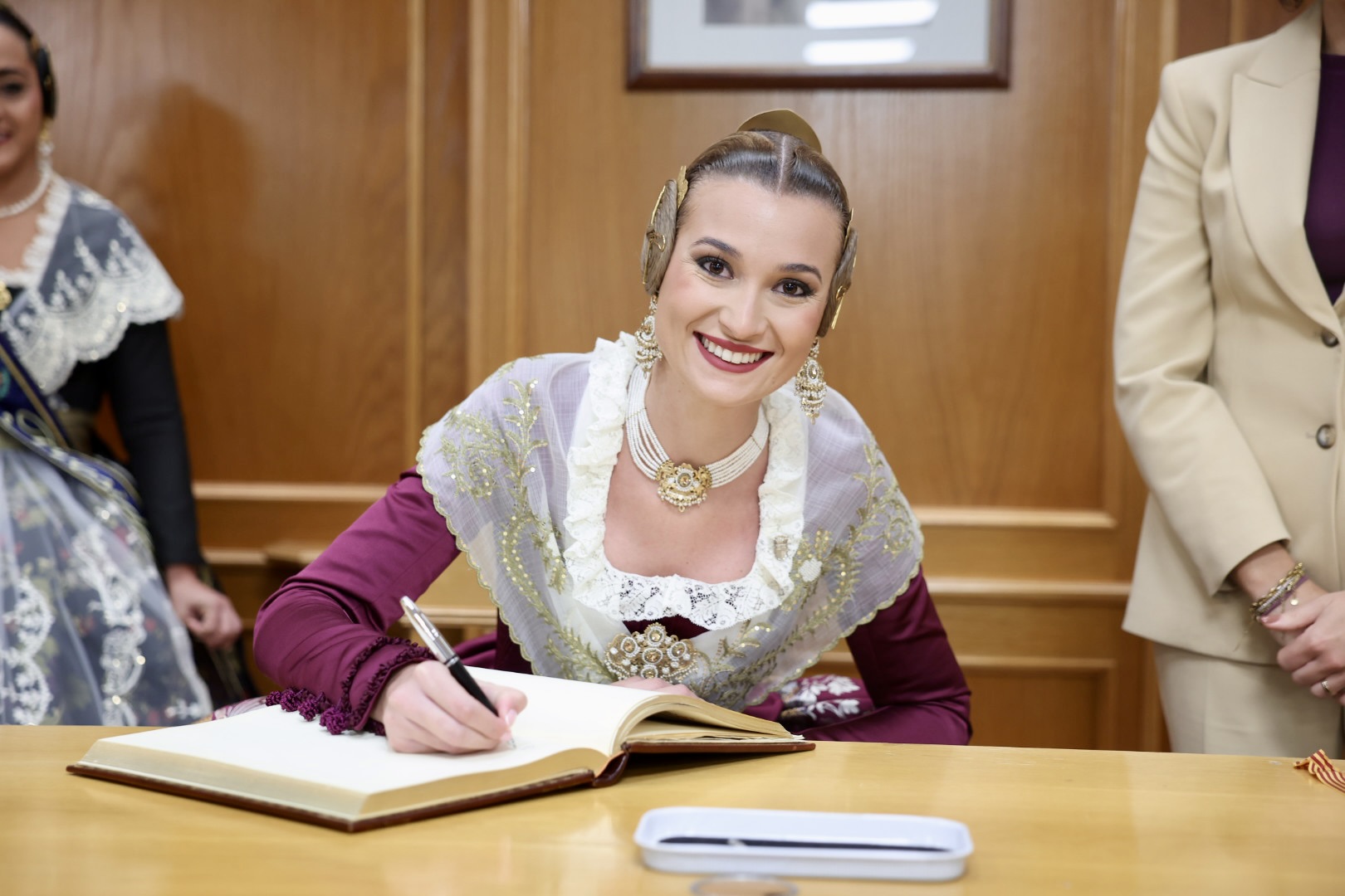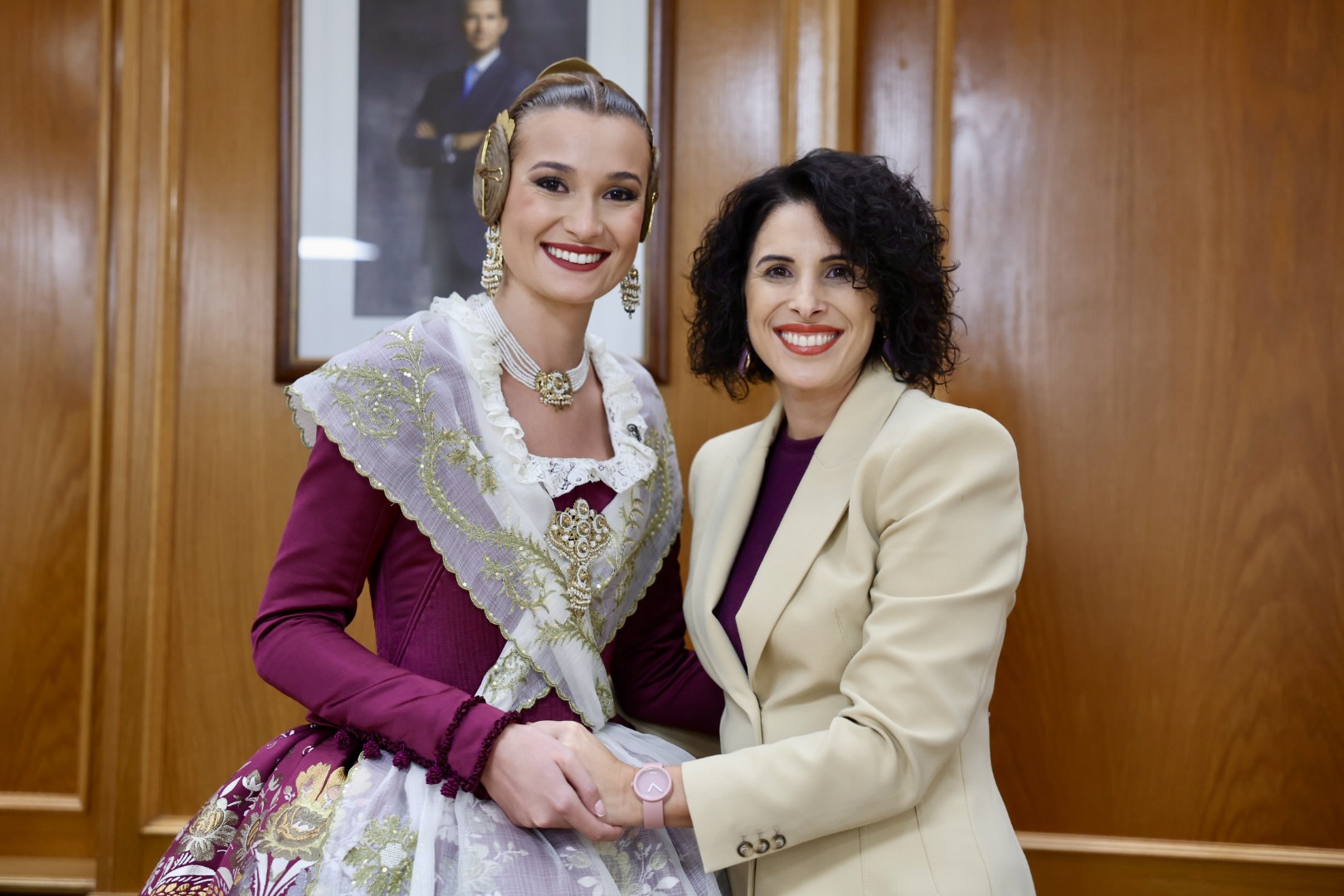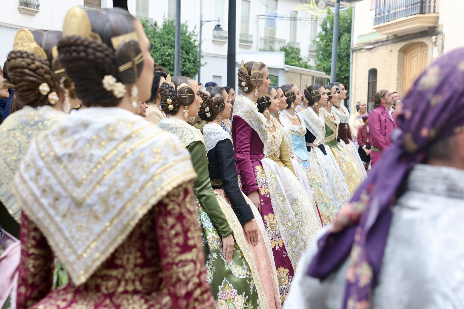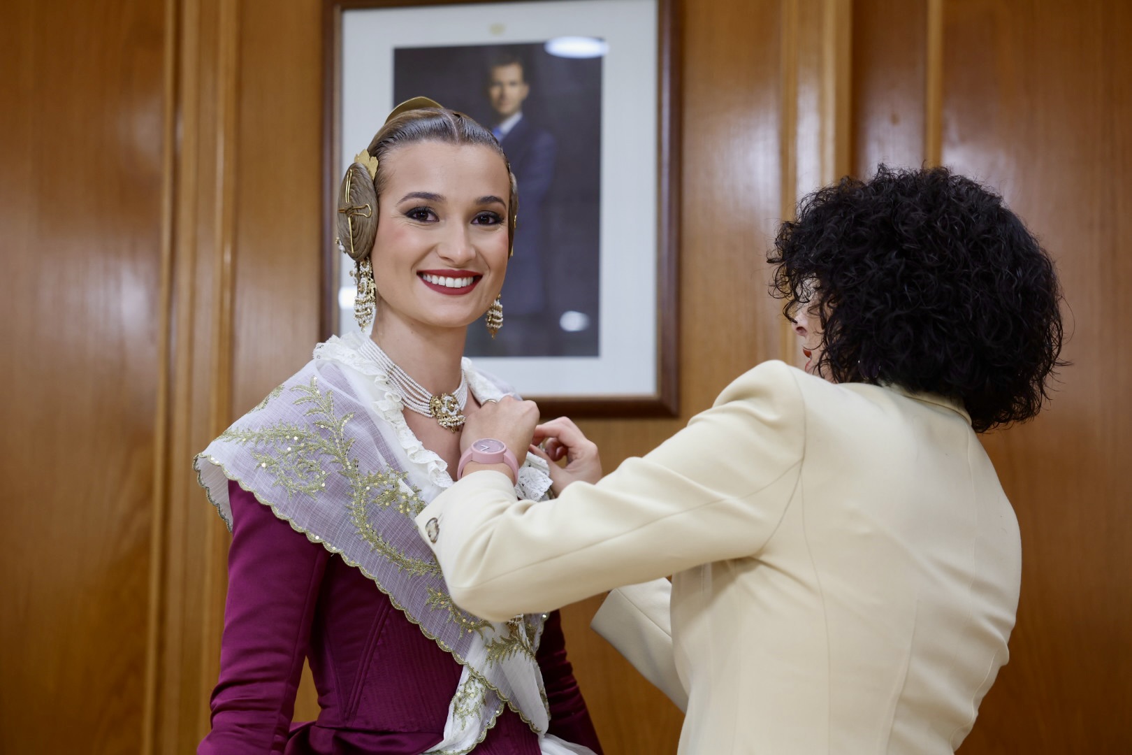 Para complementar el traje, Berta ha lucido unos elegantes zapatos de solepiel que destacan por su comodidad y diseño acorde al conjunto. Además, el aderezo, confeccionado por los expertos orfebres Peris Roca, añade un toque de distinción y elegancia al atuendo. Cada elemento del traje ha sido cuidadosamente seleccionado para crear una combinación armoniosa y espectacular que honra la tradición y la belleza de la moda valenciana.