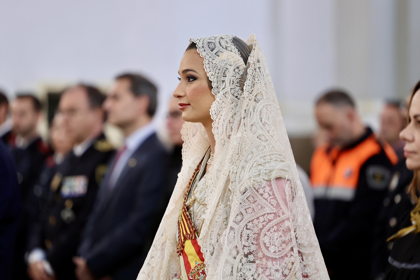 En la mascletà, la Fallera Mayor ha optado por un corpiño de manga farol, realzando su porte y majestuosidad. Las manteletas, elaboradas por Artesanía Valencia, tienen un valor especial, ya que esta firma ha logrado superar la adversidad tras haberlo perdido todo en la DANA. Su esfuerzo y dedicación se reflejan en cada puntada de esta pieza artesanal.