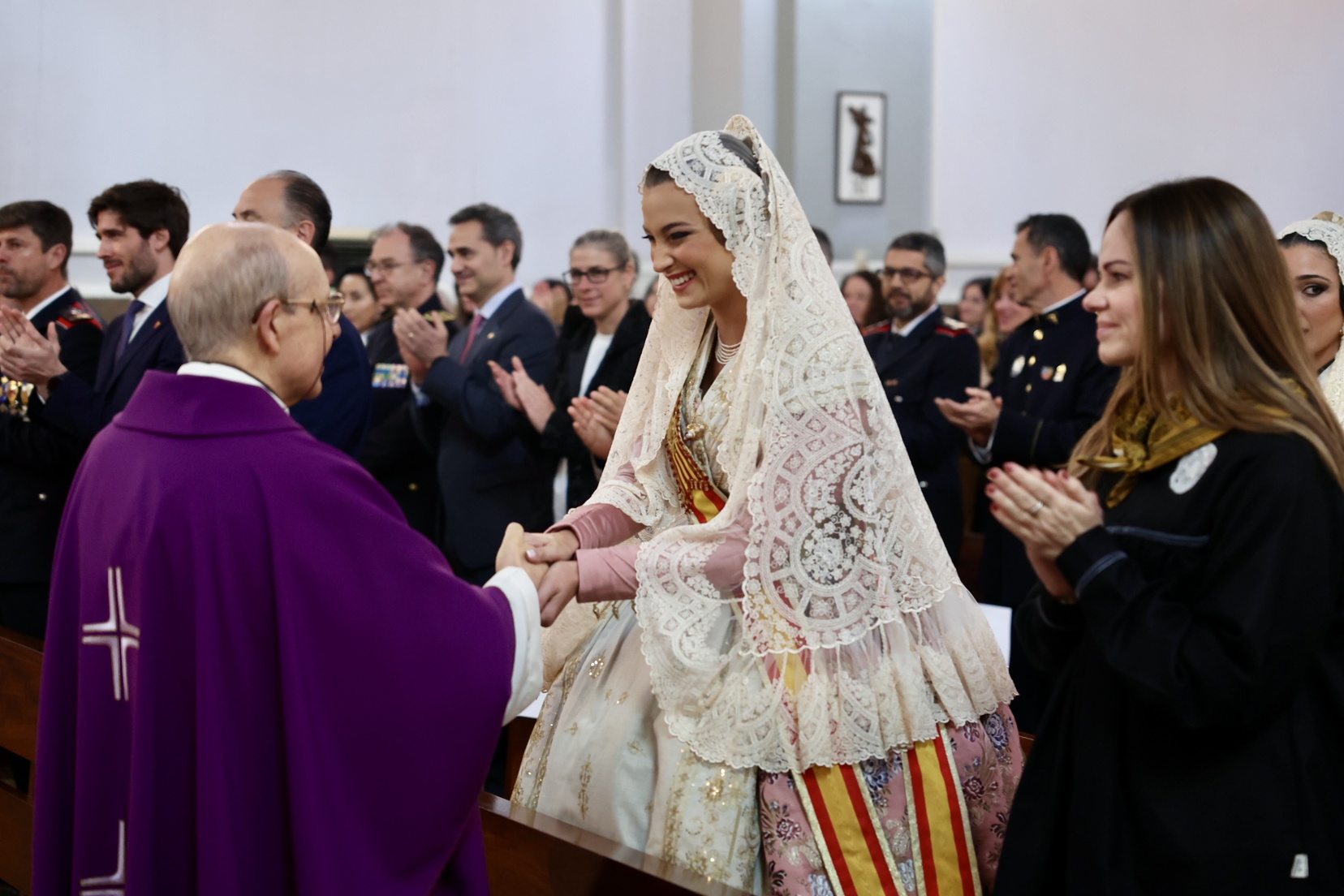 Para el acto de la misa de los bomberos, Berta ha estrenado un jubón de manga larga, una pieza que destaca por su elegancia y sobriedad.