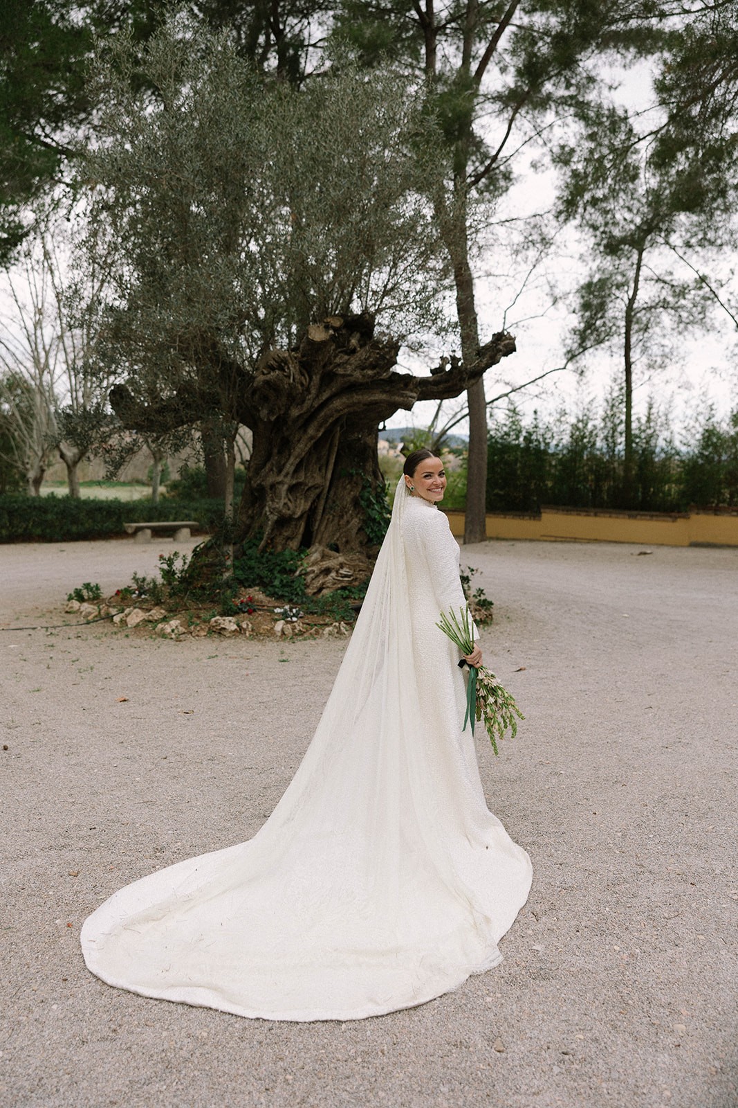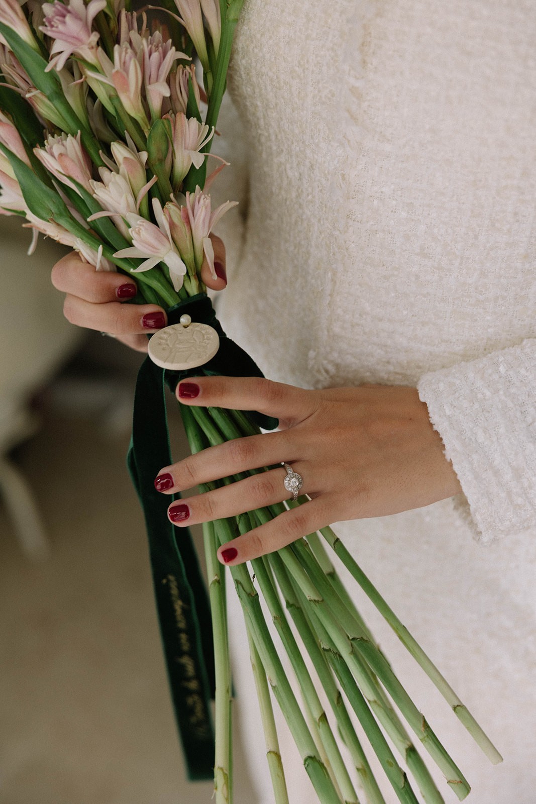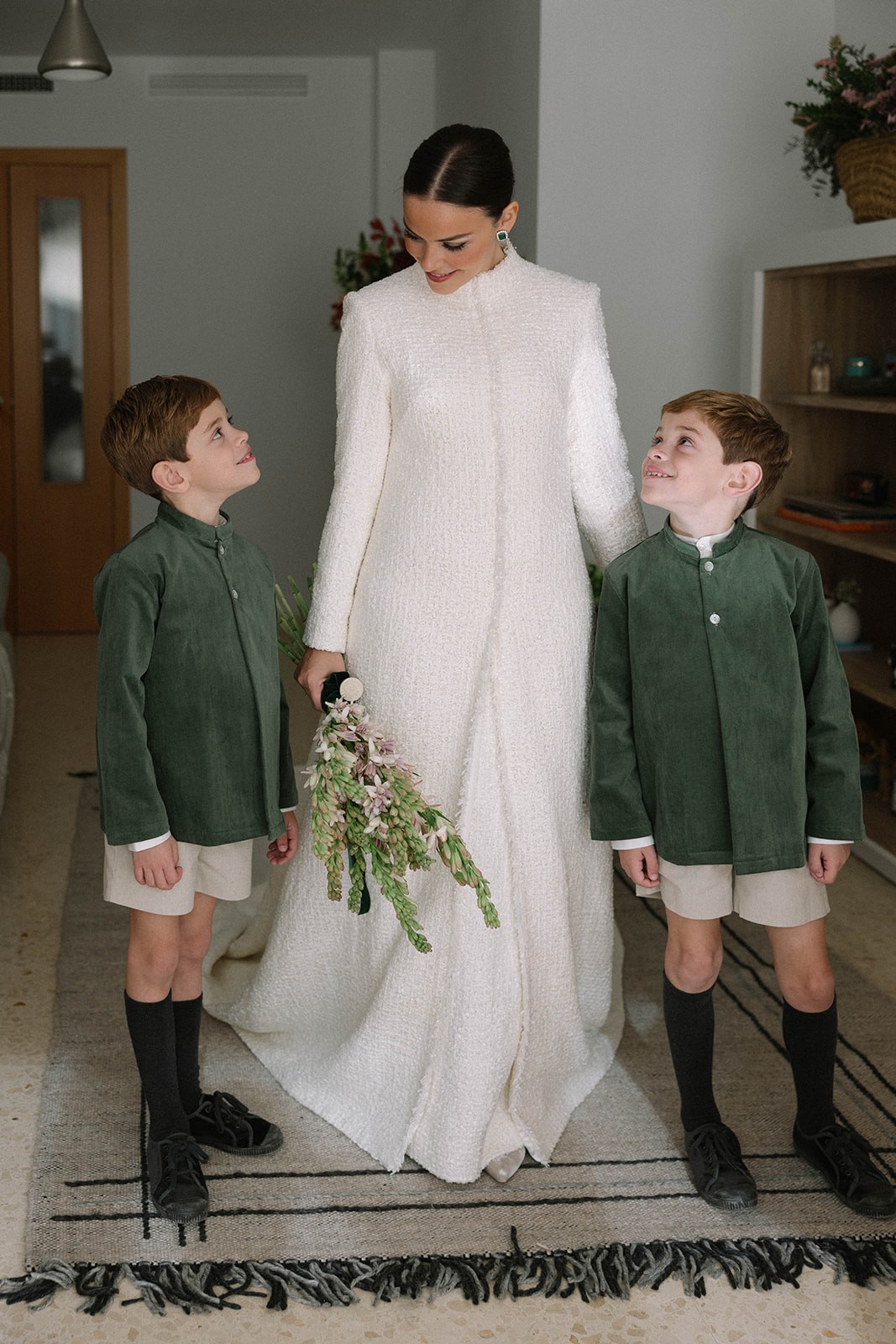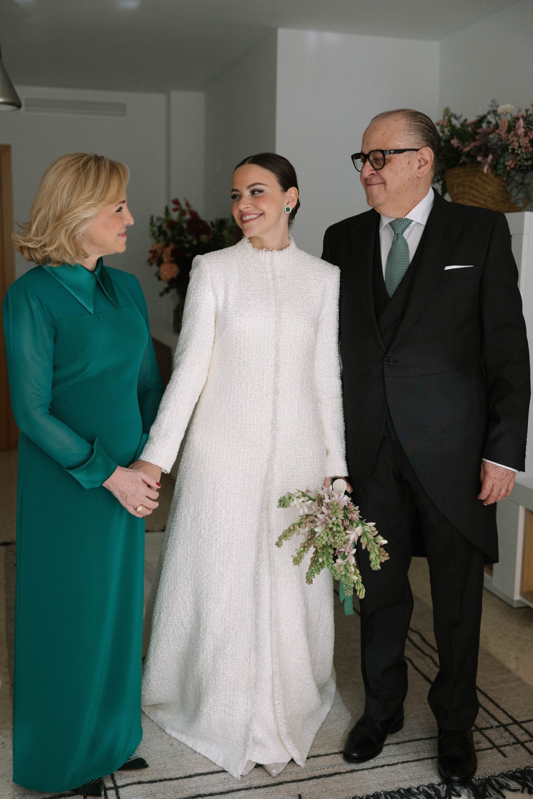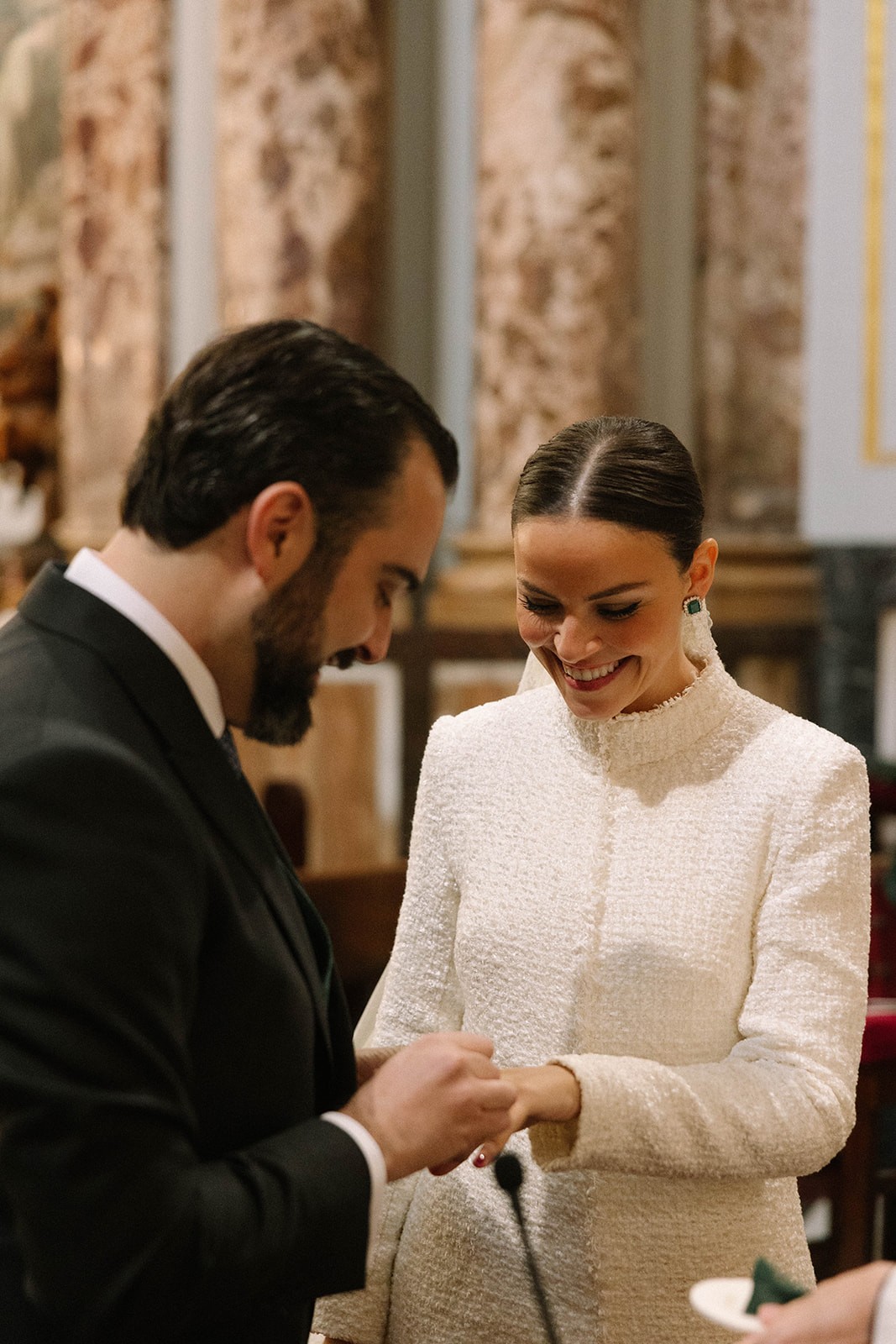 Inma lució un diseño exclusivo de Inuñez por Tousette, compuesto por un elegante abrigo de tweed que cubría un vestido de inspiración invernal. Este vestido presentaba una falda de tweed con corte en la cadera y un cuerpo de satén de seda con escote halter, acompañado de un delicado pañuelo de muselina de seda. Como complemento, llevó un impresionante velo mantillado y unos zapatos de Flor de Asoka.
