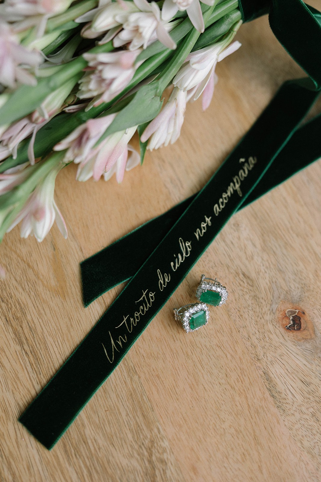 Para su peinado, optó por un moño sencillo, obra de Marieta Hairstyle, mientras que su maquillaje estuvo a cargo de Begoña de Bobbi Brown, resaltando su belleza natural. En cuanto a las joyas, destacaron los pendientes de esmeralda y brillantes heredados de su abuela materna, así como los anillos de pedida.