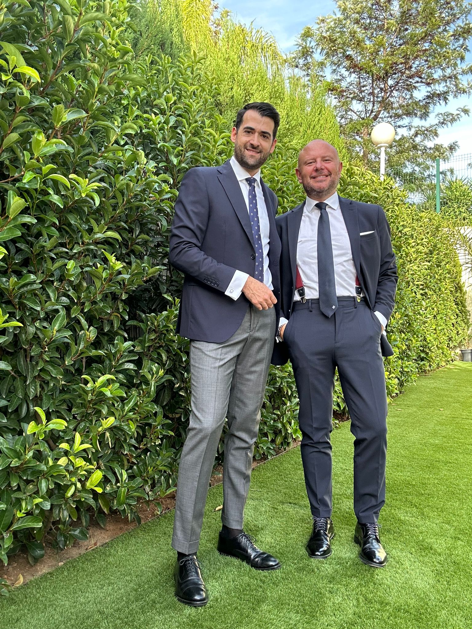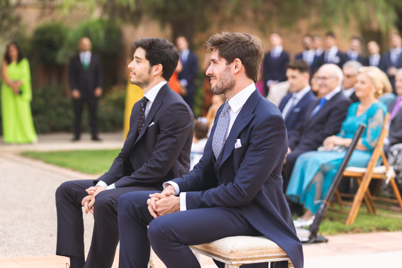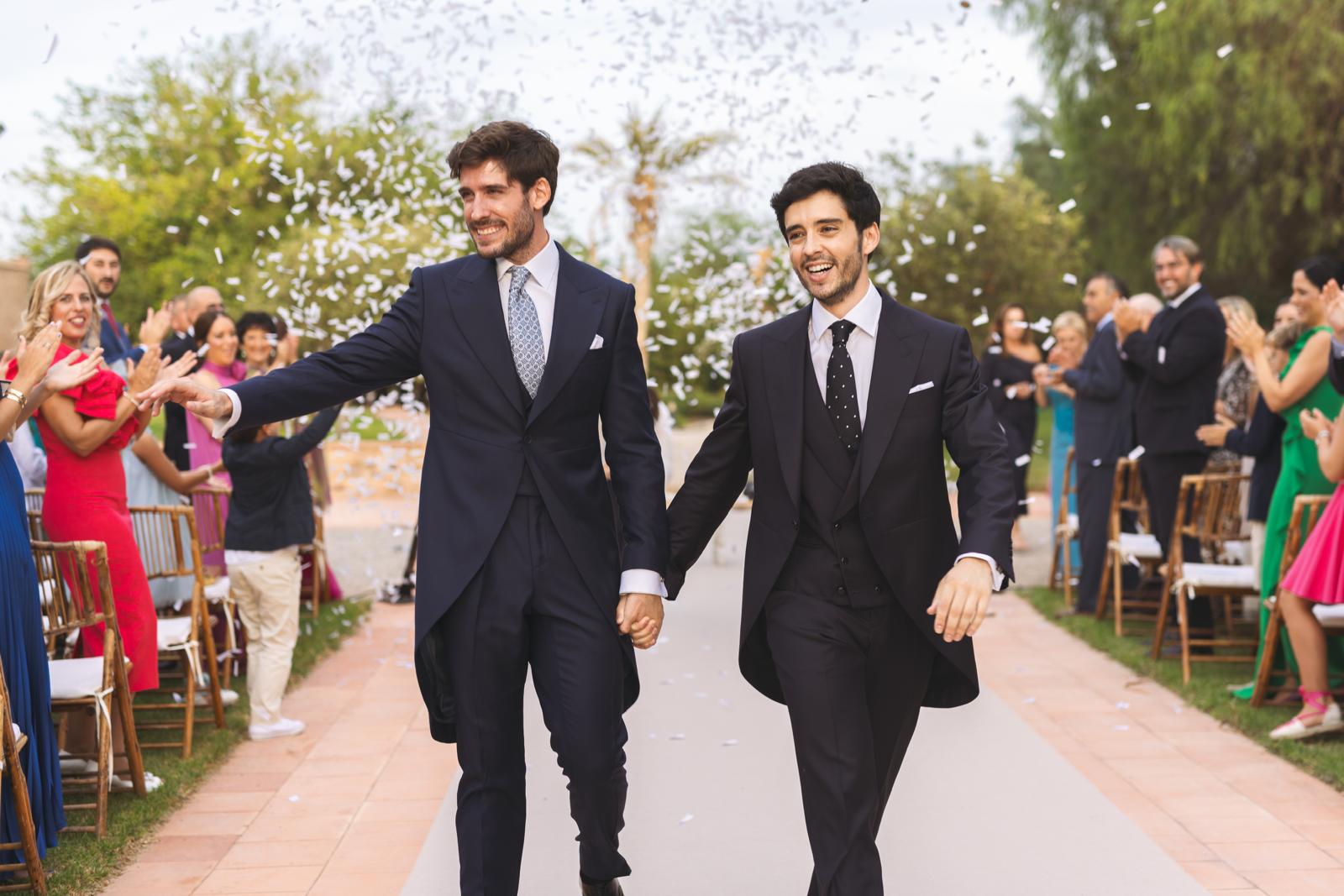 Juan Carlos y Javier lucieron elegantes chaqués confeccionados respectivamente por Adrián Seligra y Blackcape. La celebración tuvo lugar en la Cartuja de Ara Christi, donde se celebraron la ceremonia, el cóctel, la cena y la posterior fiesta, que comenzó alrededor de las 19 horas.