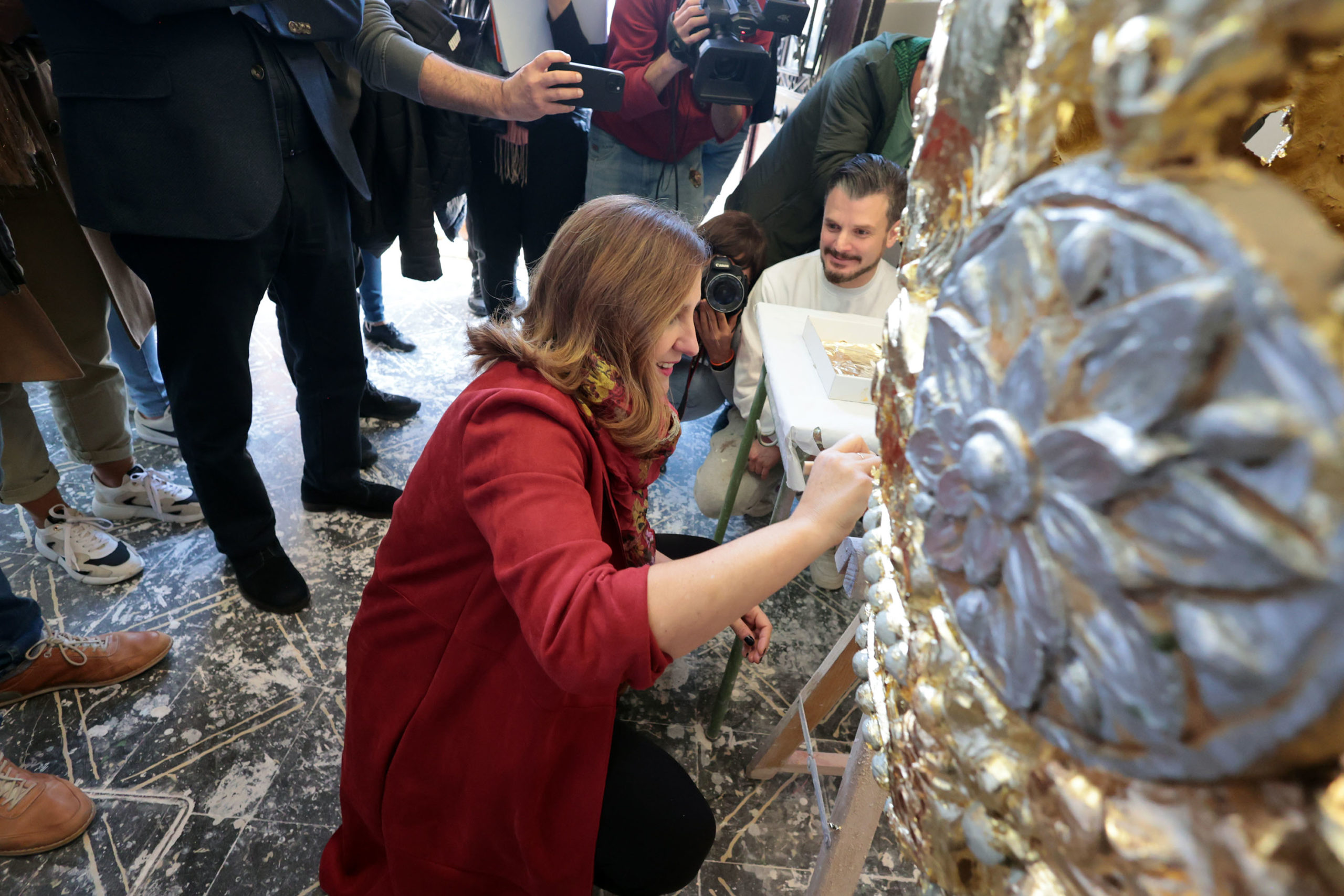 La alcaldesa de València, Maria José Catalá, visita el taller de Ceballos y Sanabria donde se está llevando a cabo la restauración del cadafal de la Virgen de los Desamparados
