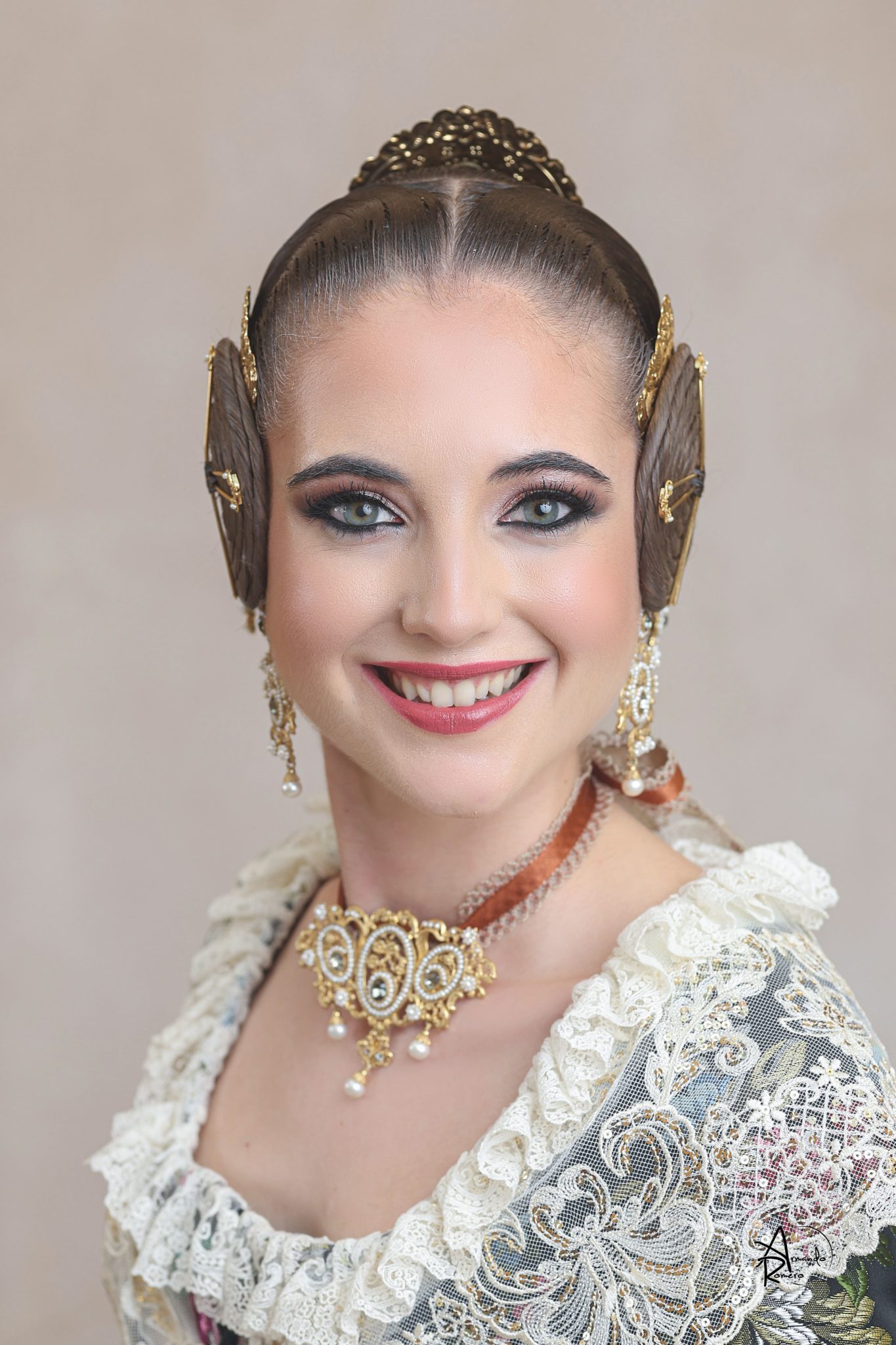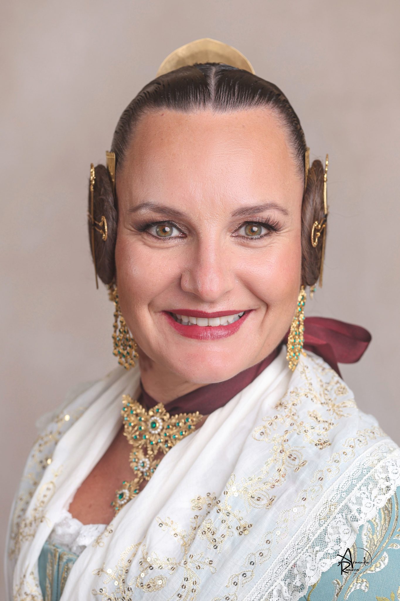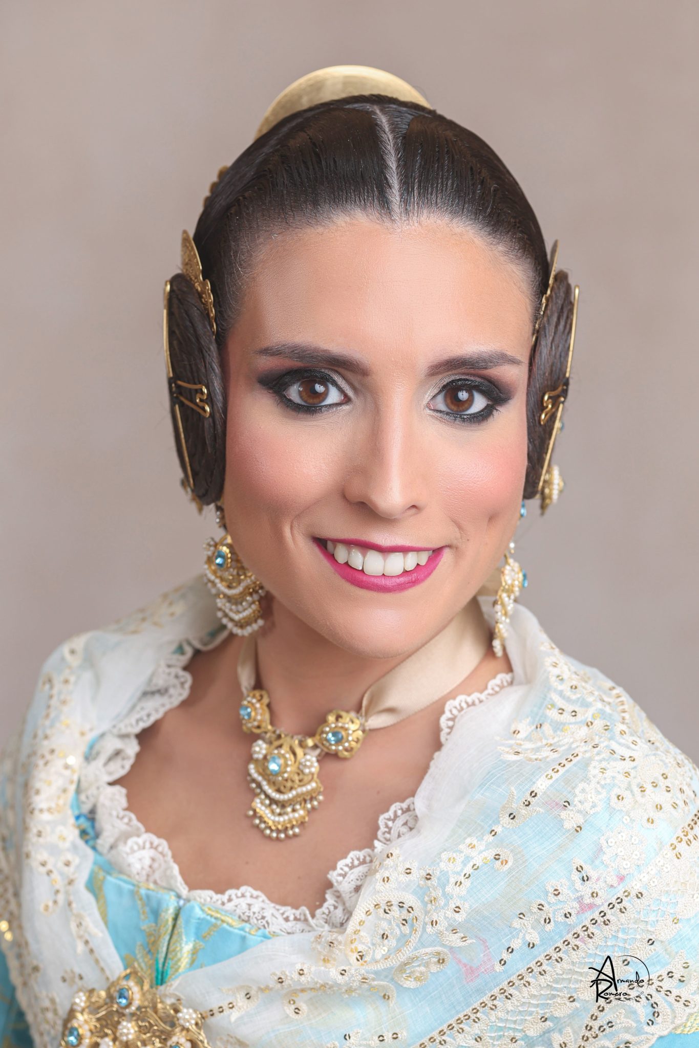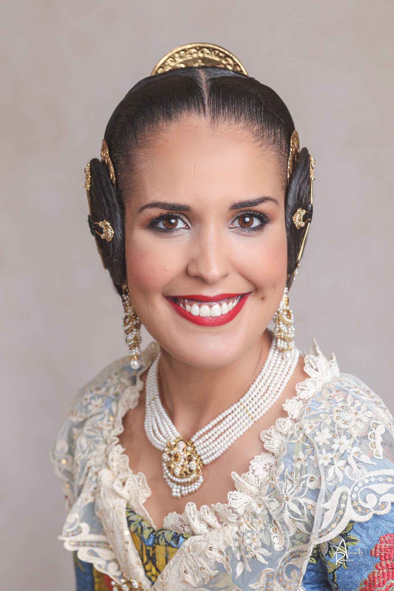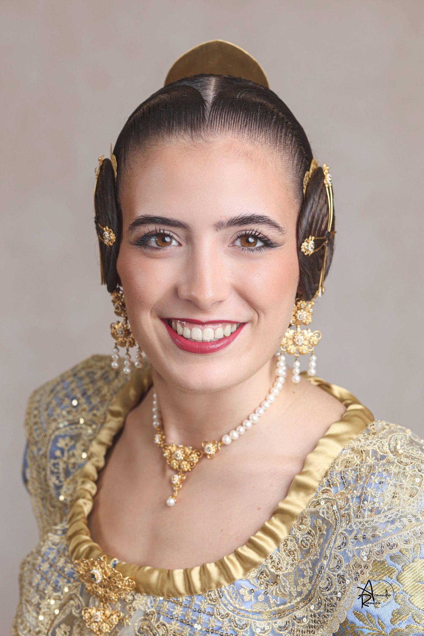 Uno de los momentos más esperados de la noche fue el descubrimiento del traje, que concentró todas las miradas del auditorio. Juana Paula Centeno Roig apareció con un espolín Soto de color azul, una elección cargada de simbolismo en la tradición valenciana, y es que este tono se asocia a la nobleza, la serenidad y la elegancia clásica de la indumentaria histórica. El tejido, confeccionado por Amparo Fabra, destaca por la riqueza del dibujo y la profundidad del color, que aporta sobriedad y presencia escénica.