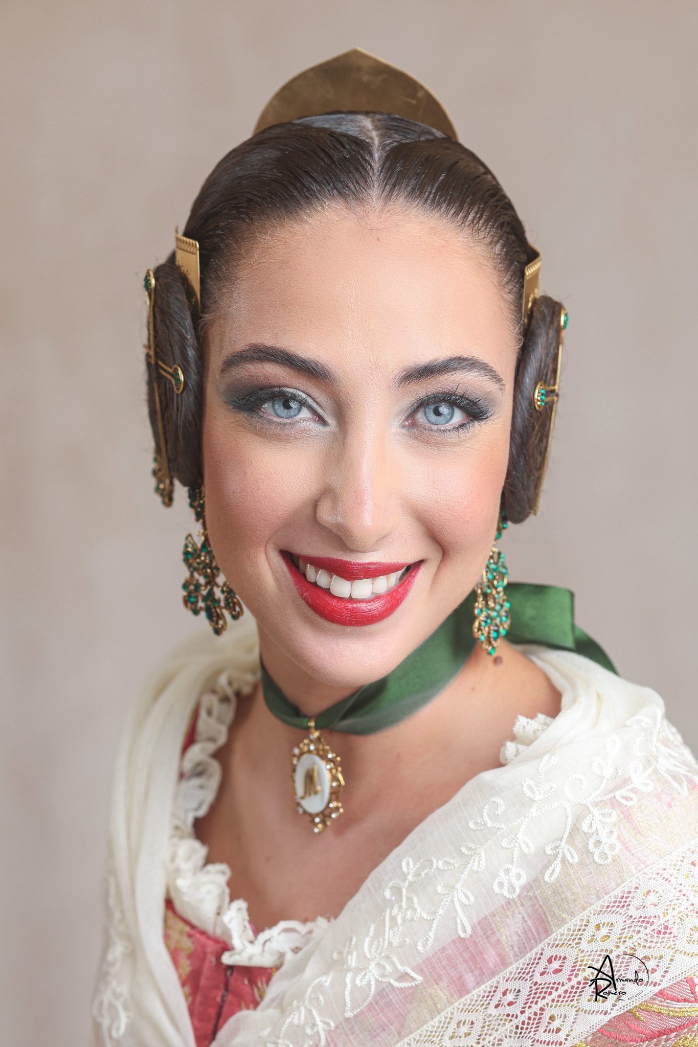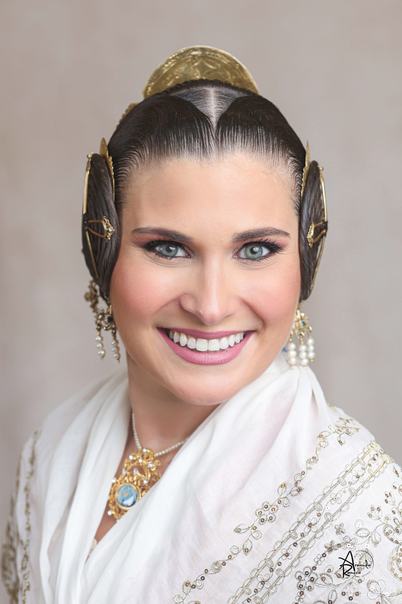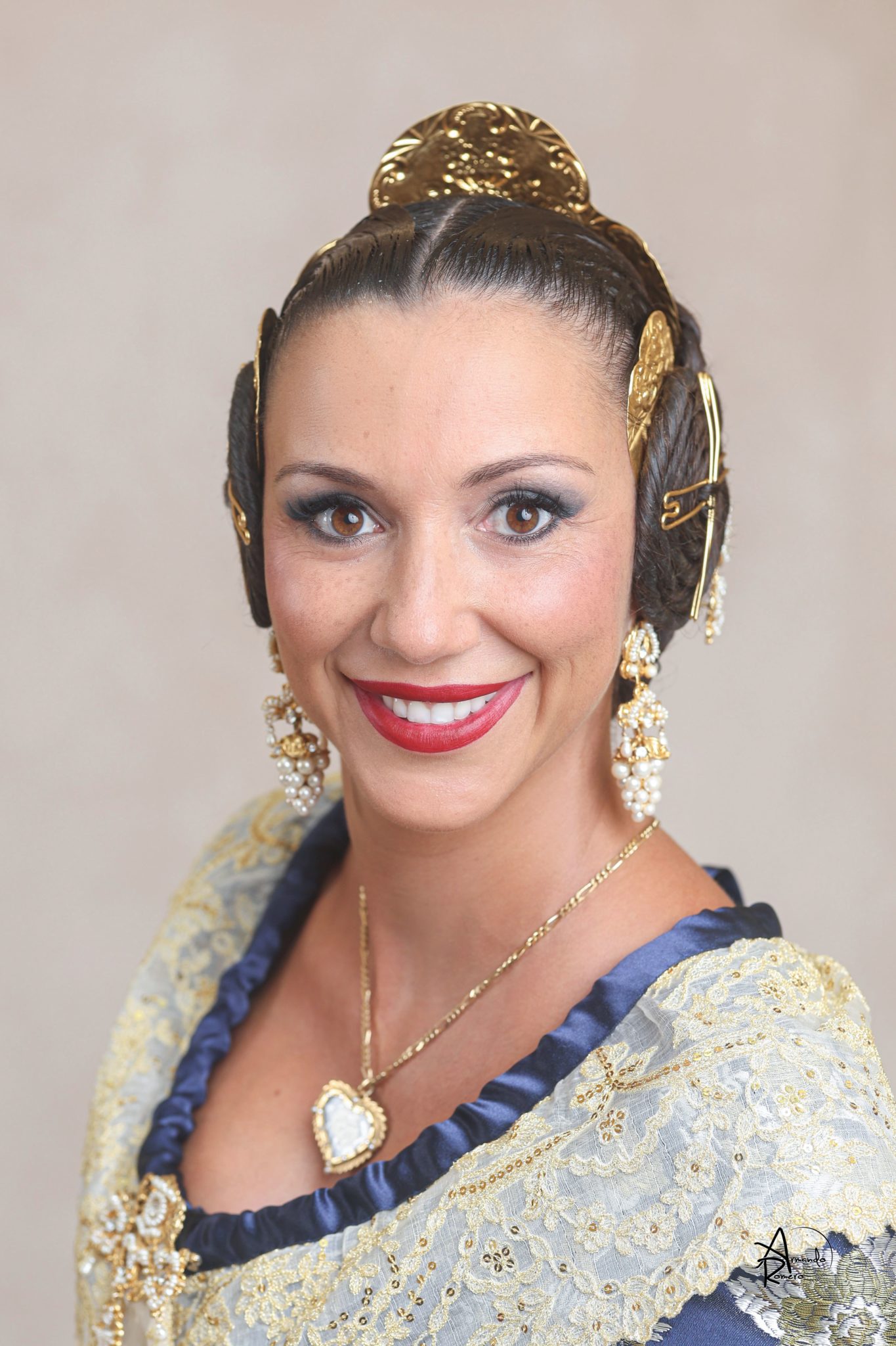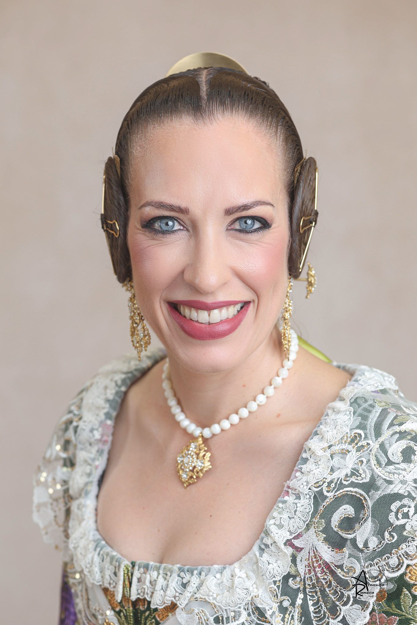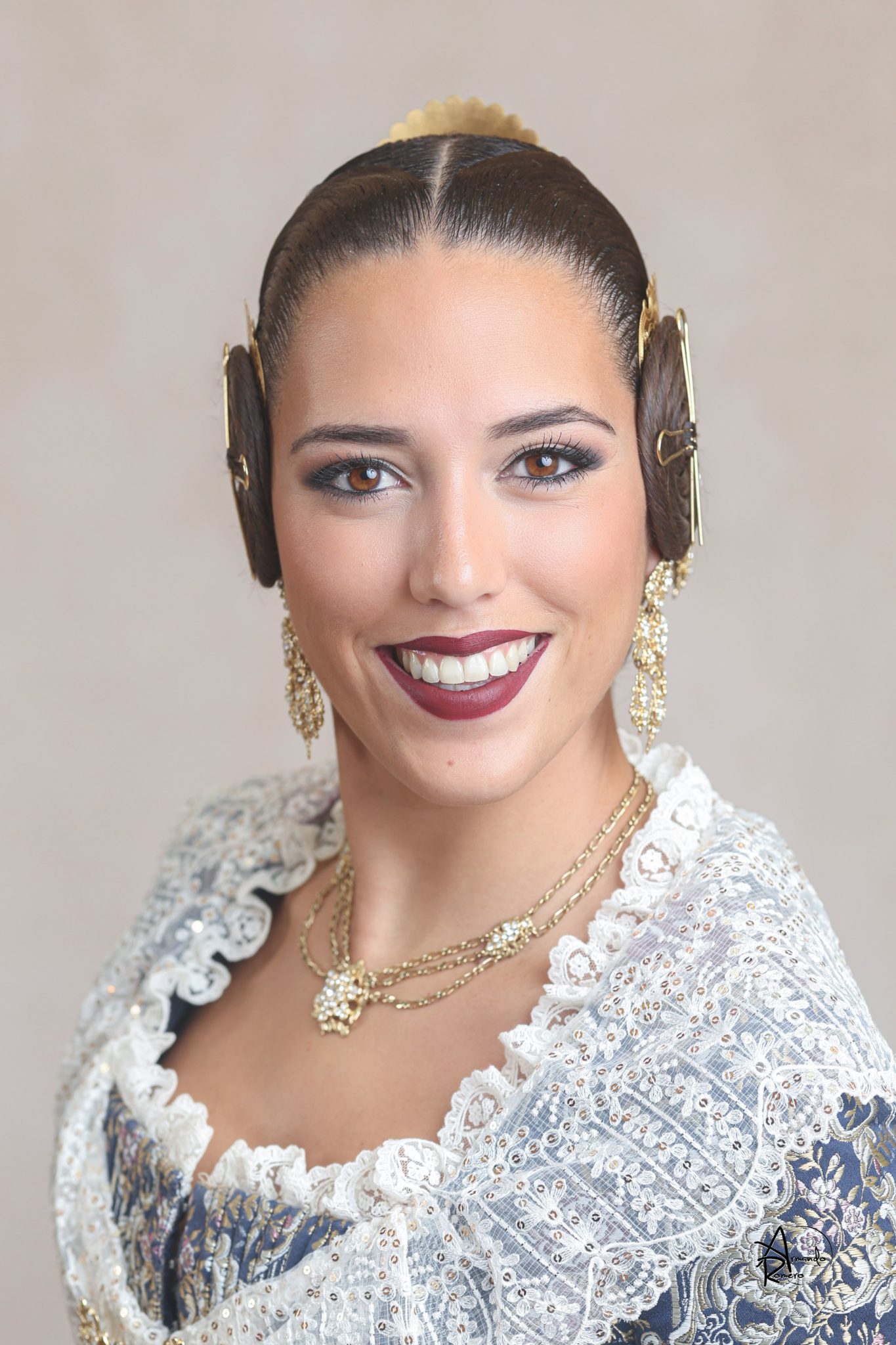 Uno de los momentos más esperados de la noche fue el descubrimiento del traje, que concentró todas las miradas del auditorio. Juana Paula Centeno Roig apareció con un espolín Soto de color azul, una elección cargada de simbolismo en la tradición valenciana, y es que este tono se asocia a la nobleza, la serenidad y la elegancia clásica de la indumentaria histórica. El tejido, confeccionado por Amparo Fabra, destaca por la riqueza del dibujo y la profundidad del color, que aporta sobriedad y presencia escénica.