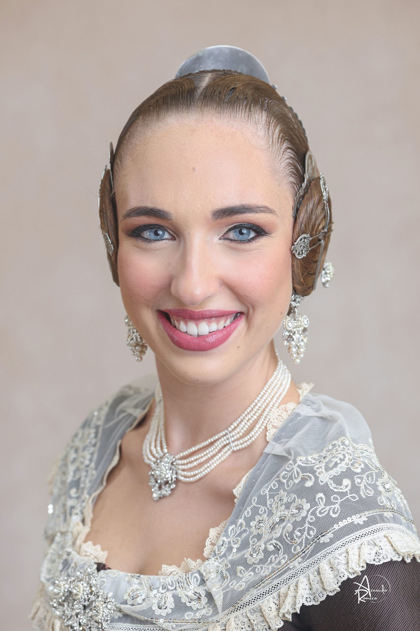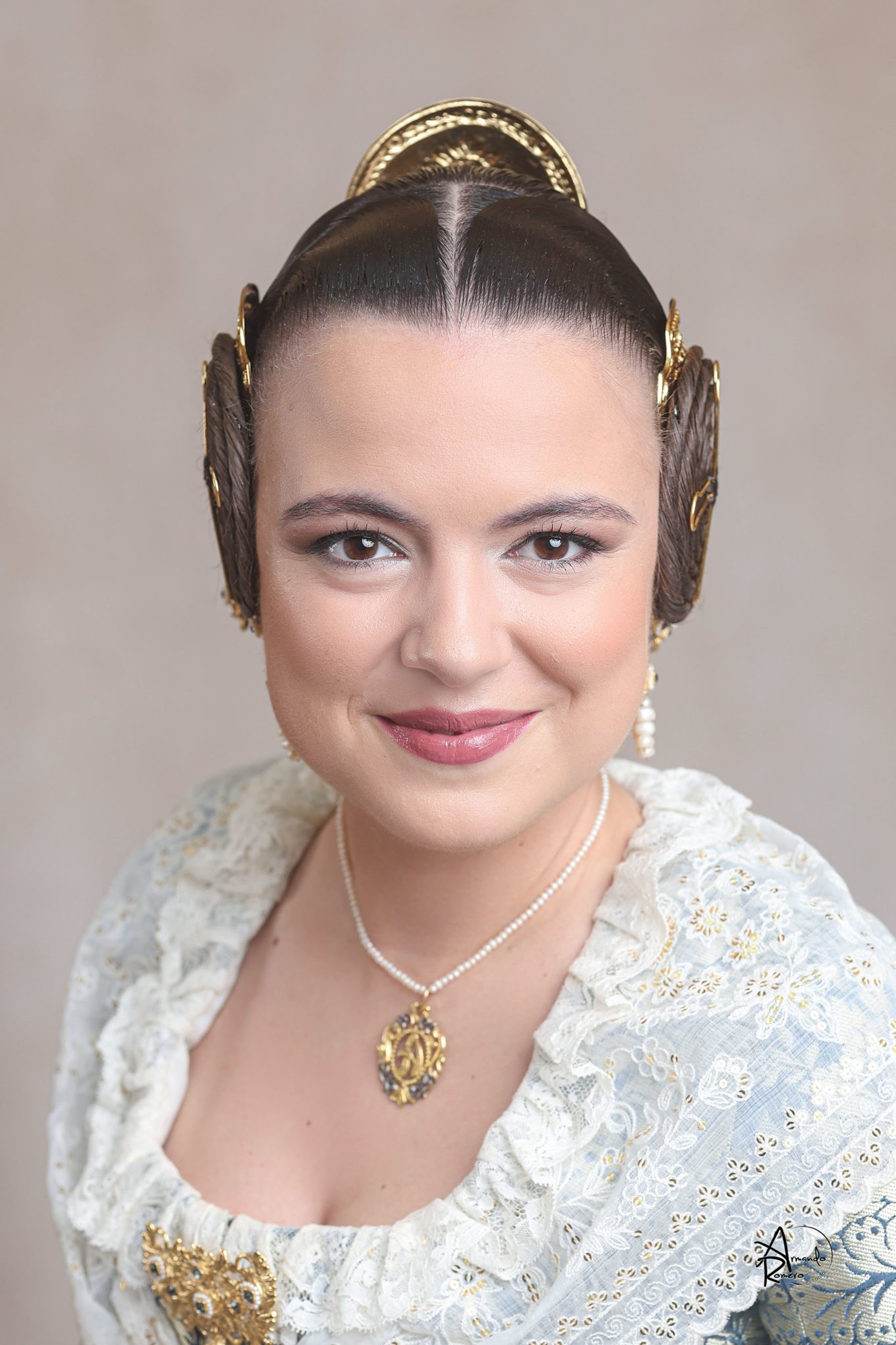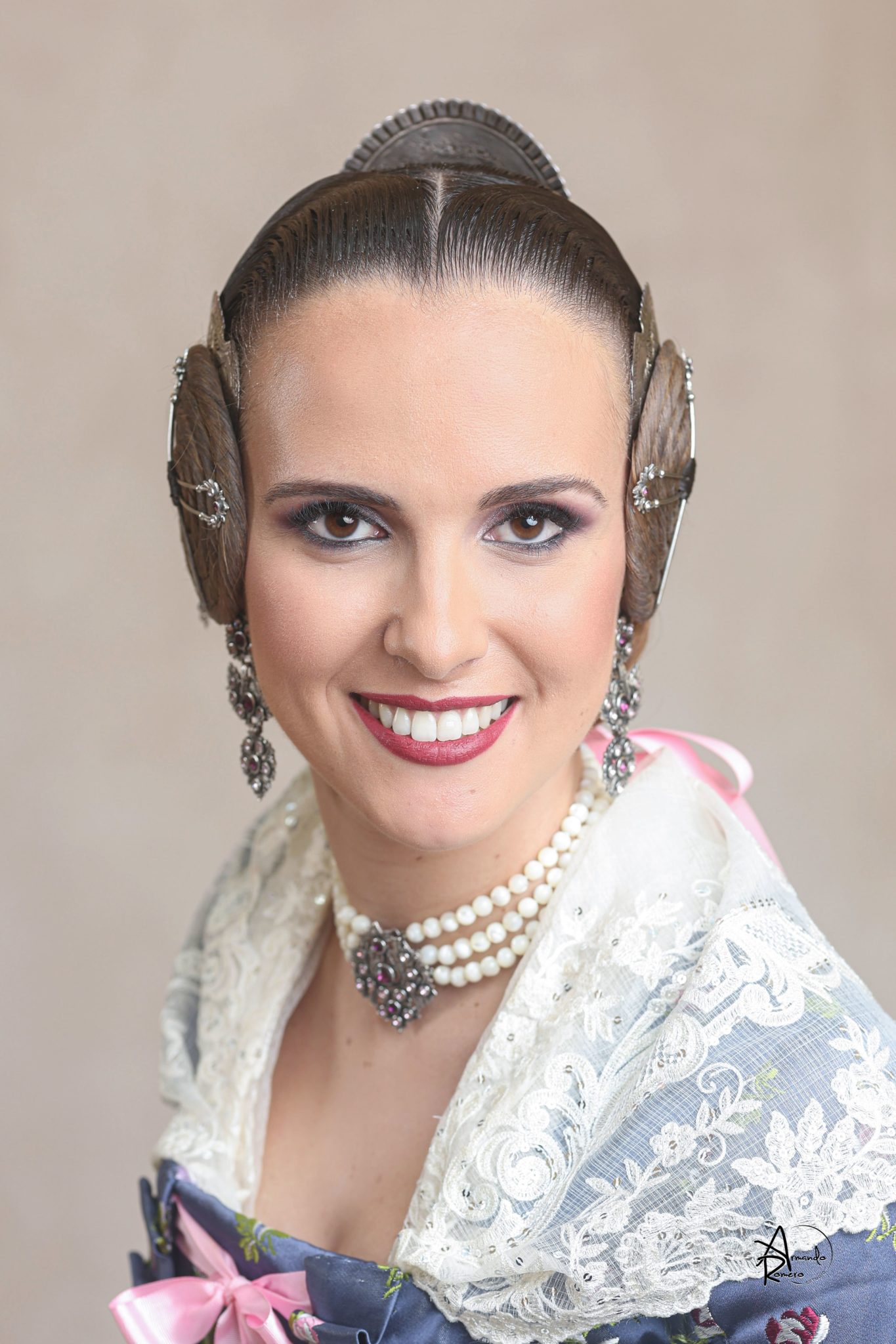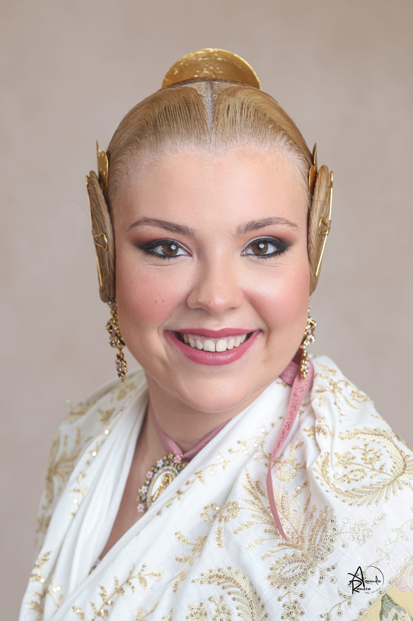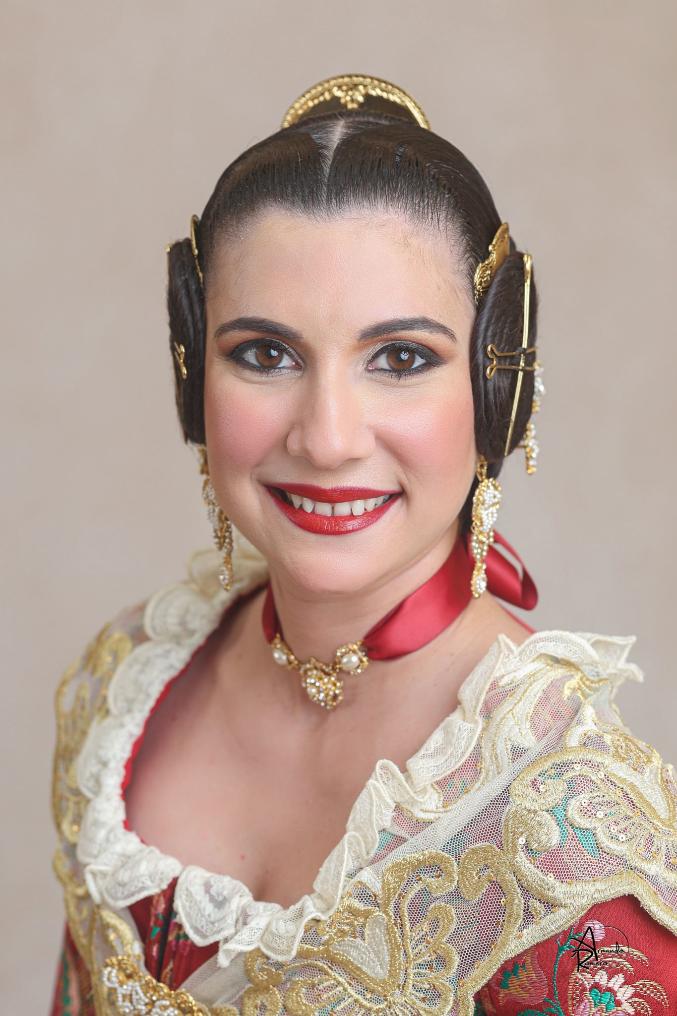 Uno de los momentos más esperados de la noche fue el descubrimiento del traje, que concentró todas las miradas del auditorio. Juana Paula Centeno Roig apareció con un espolín Soto de color azul, una elección cargada de simbolismo en la tradición valenciana, y es que este tono se asocia a la nobleza, la serenidad y la elegancia clásica de la indumentaria histórica. El tejido, confeccionado por Amparo Fabra, destaca por la riqueza del dibujo y la profundidad del color, que aporta sobriedad y presencia escénica.