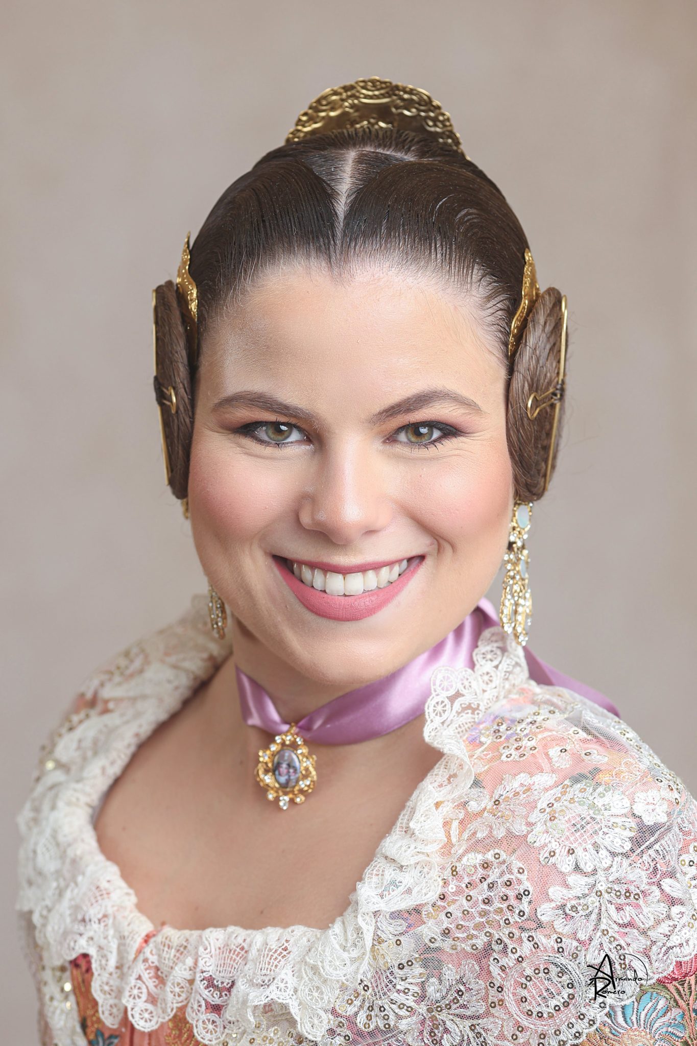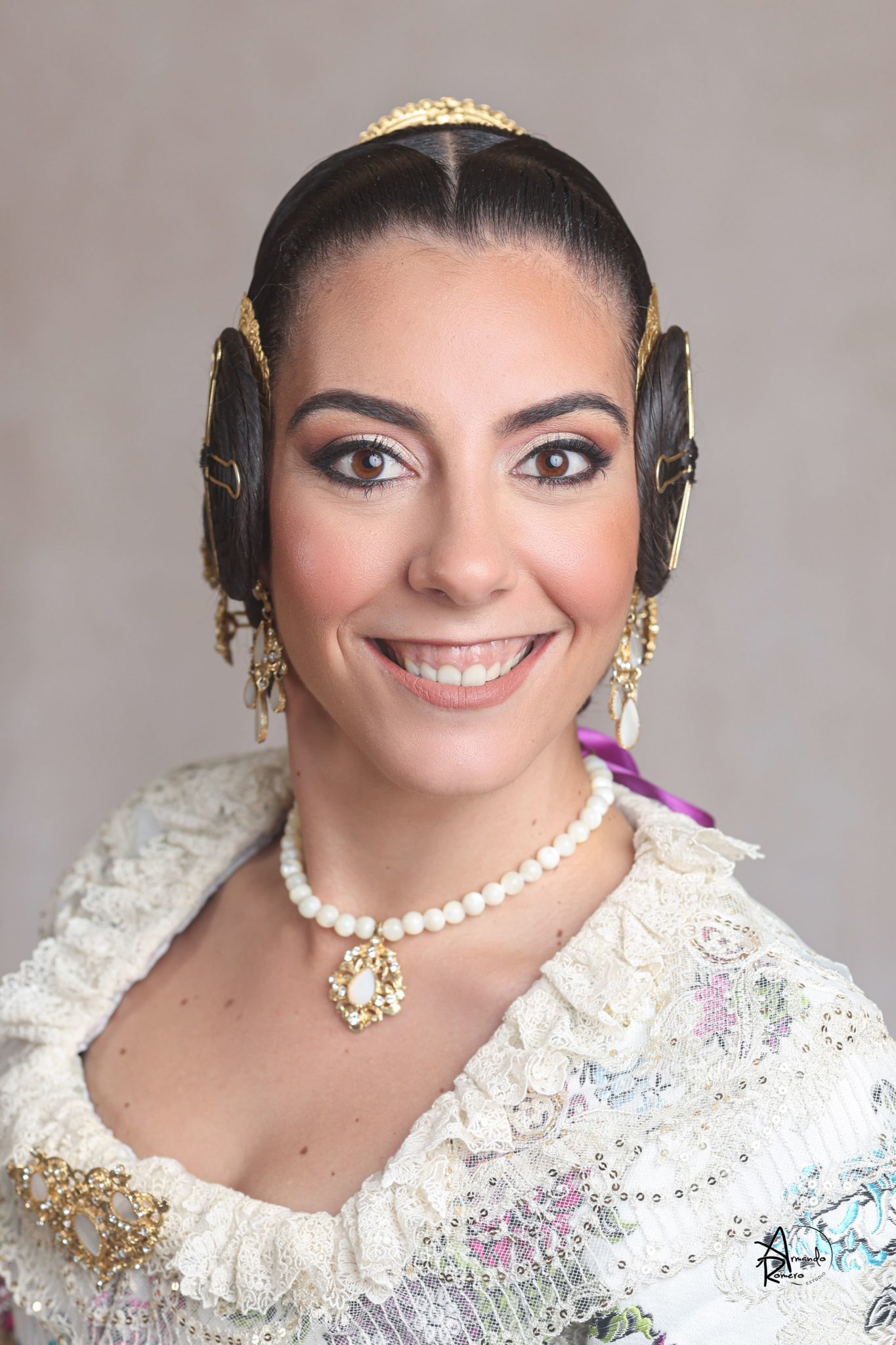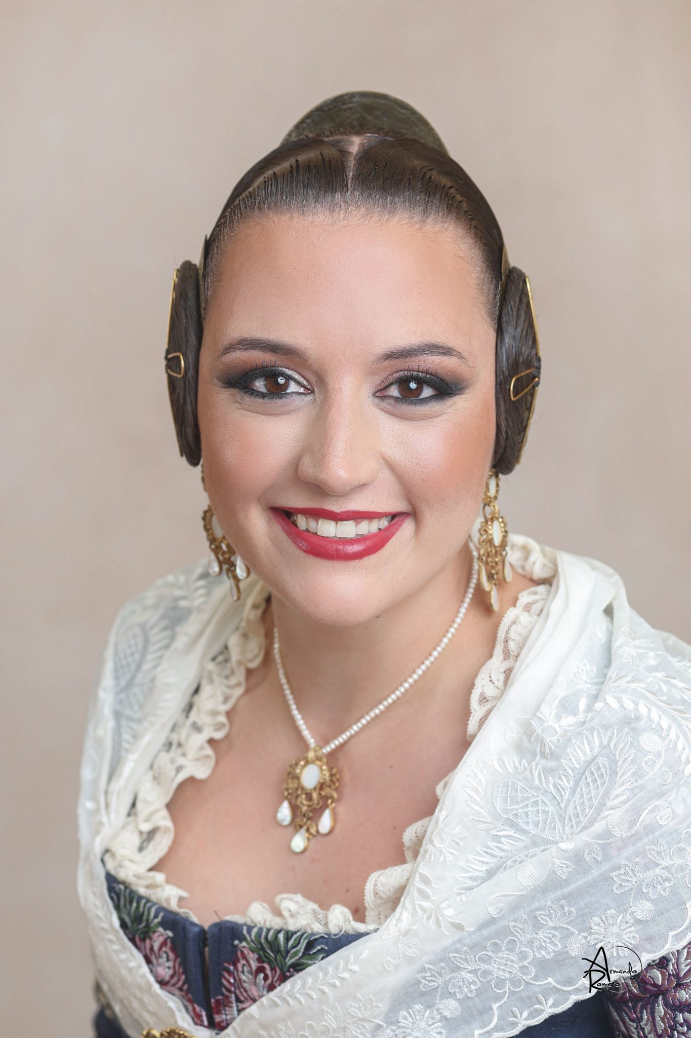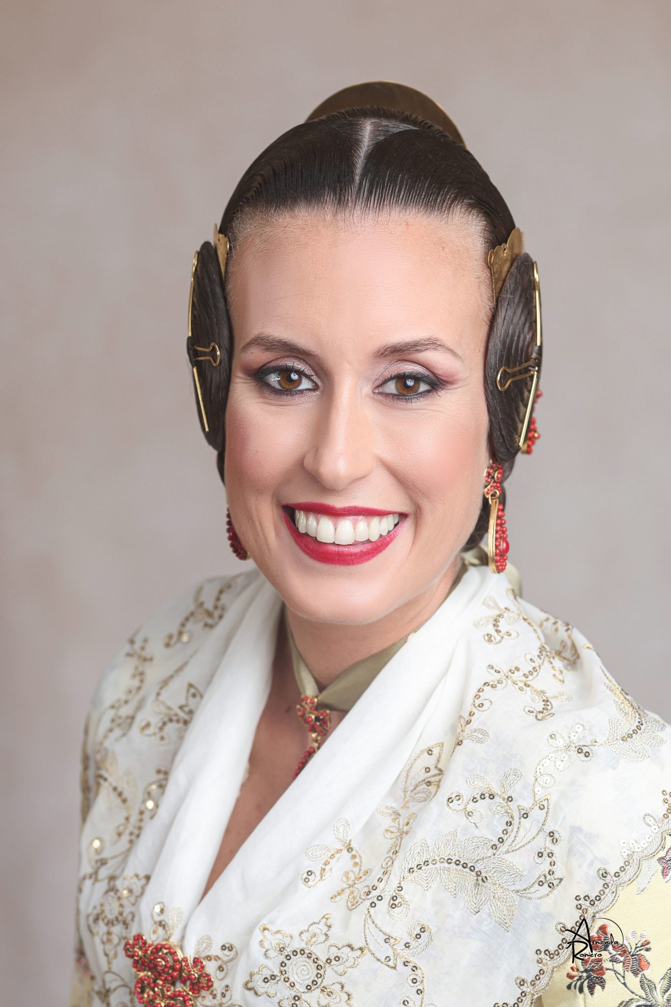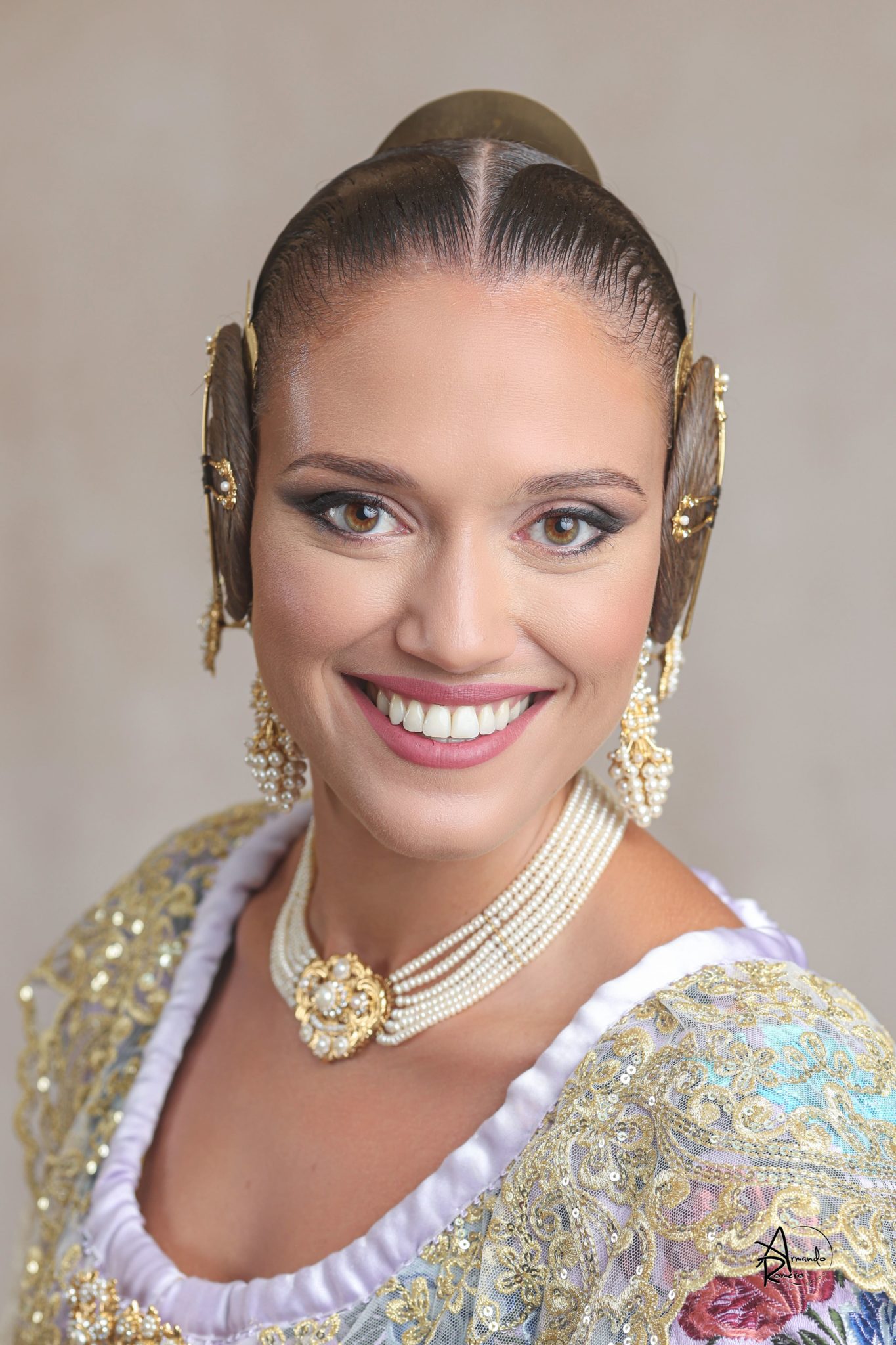 Uno de los momentos más esperados de la noche fue el descubrimiento del traje, que concentró todas las miradas del auditorio. Juana Paula Centeno Roig apareció con un espolín Soto de color azul, una elección cargada de simbolismo en la tradición valenciana, y es que este tono se asocia a la nobleza, la serenidad y la elegancia clásica de la indumentaria histórica. El tejido, confeccionado por Amparo Fabra, destaca por la riqueza del dibujo y la profundidad del color, que aporta sobriedad y presencia escénica.