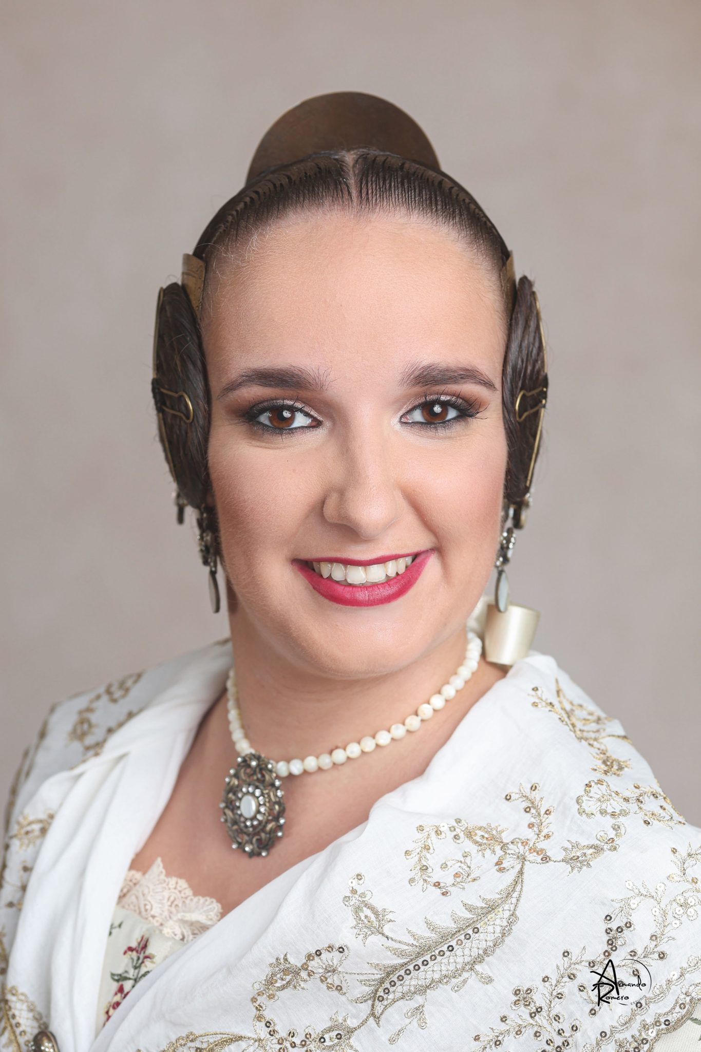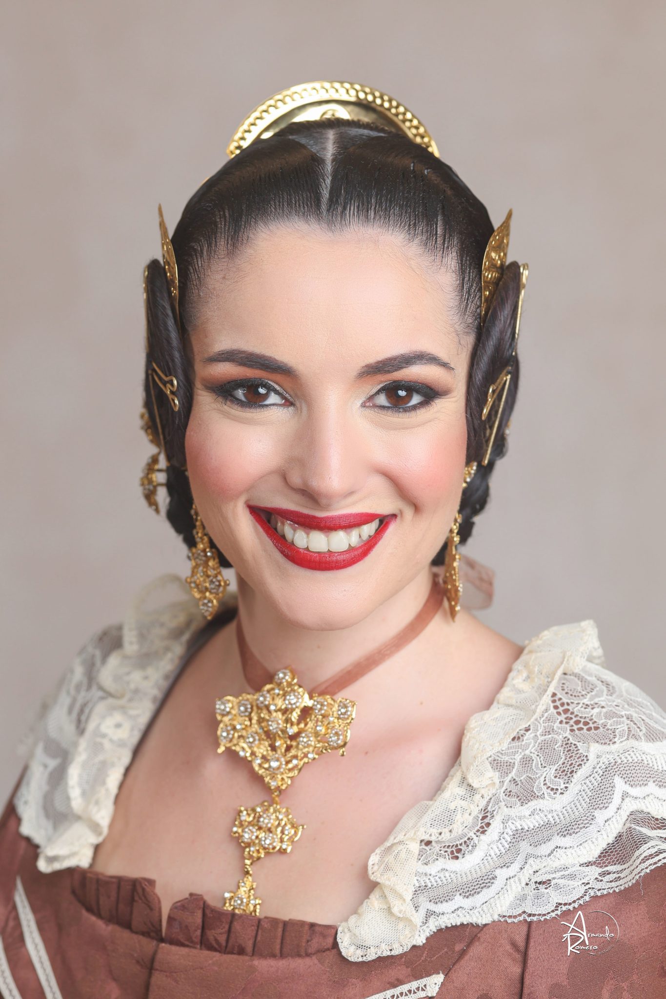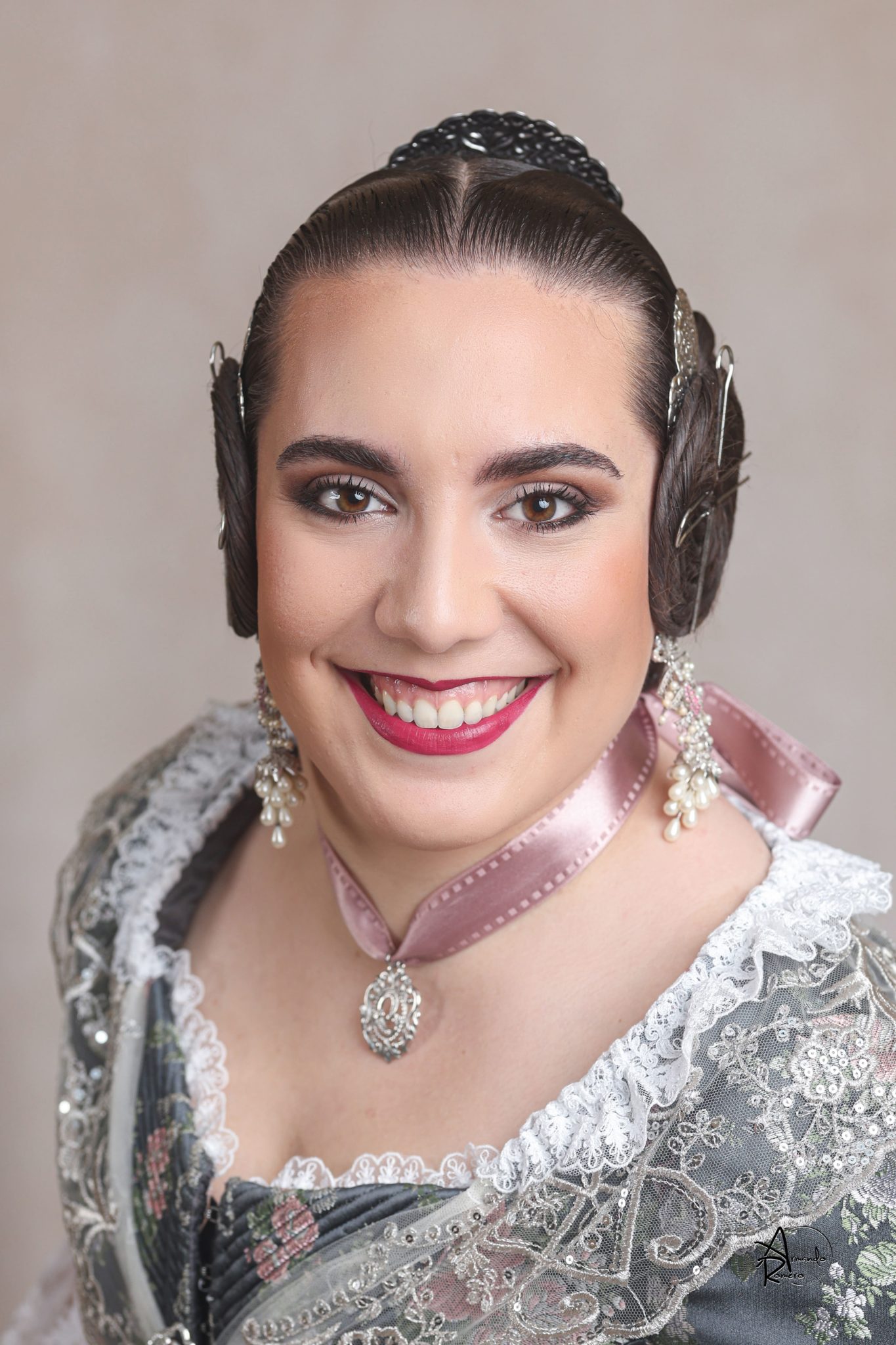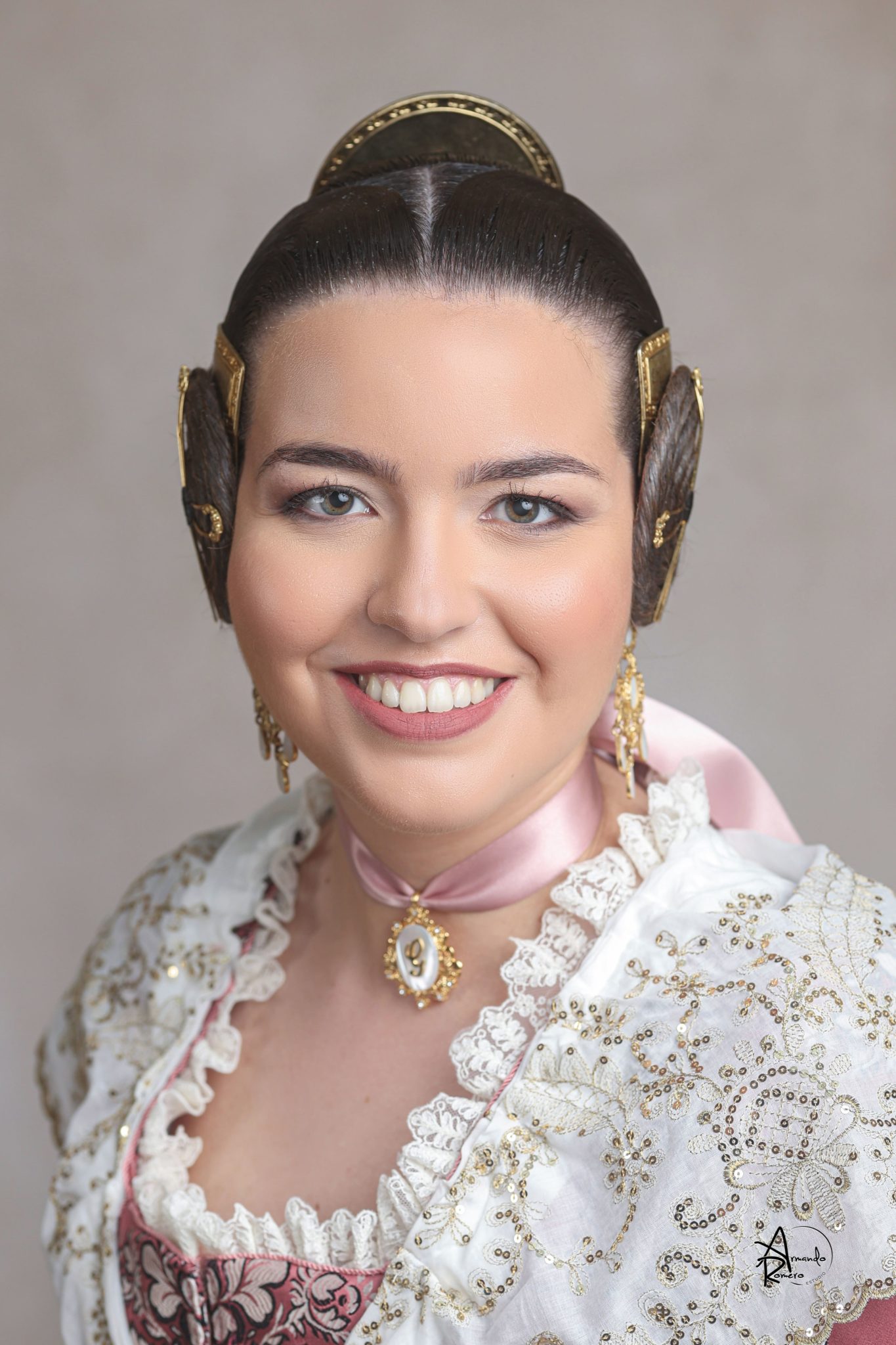 Uno de los momentos más esperados de la noche fue el descubrimiento del traje, que concentró todas las miradas del auditorio. Juana Paula Centeno Roig apareció con un espolín Soto de color azul, una elección cargada de simbolismo en la tradición valenciana, y es que este tono se asocia a la nobleza, la serenidad y la elegancia clásica de la indumentaria histórica. El tejido, confeccionado por Amparo Fabra, destaca por la riqueza del dibujo y la profundidad del color, que aporta sobriedad y presencia escénica.