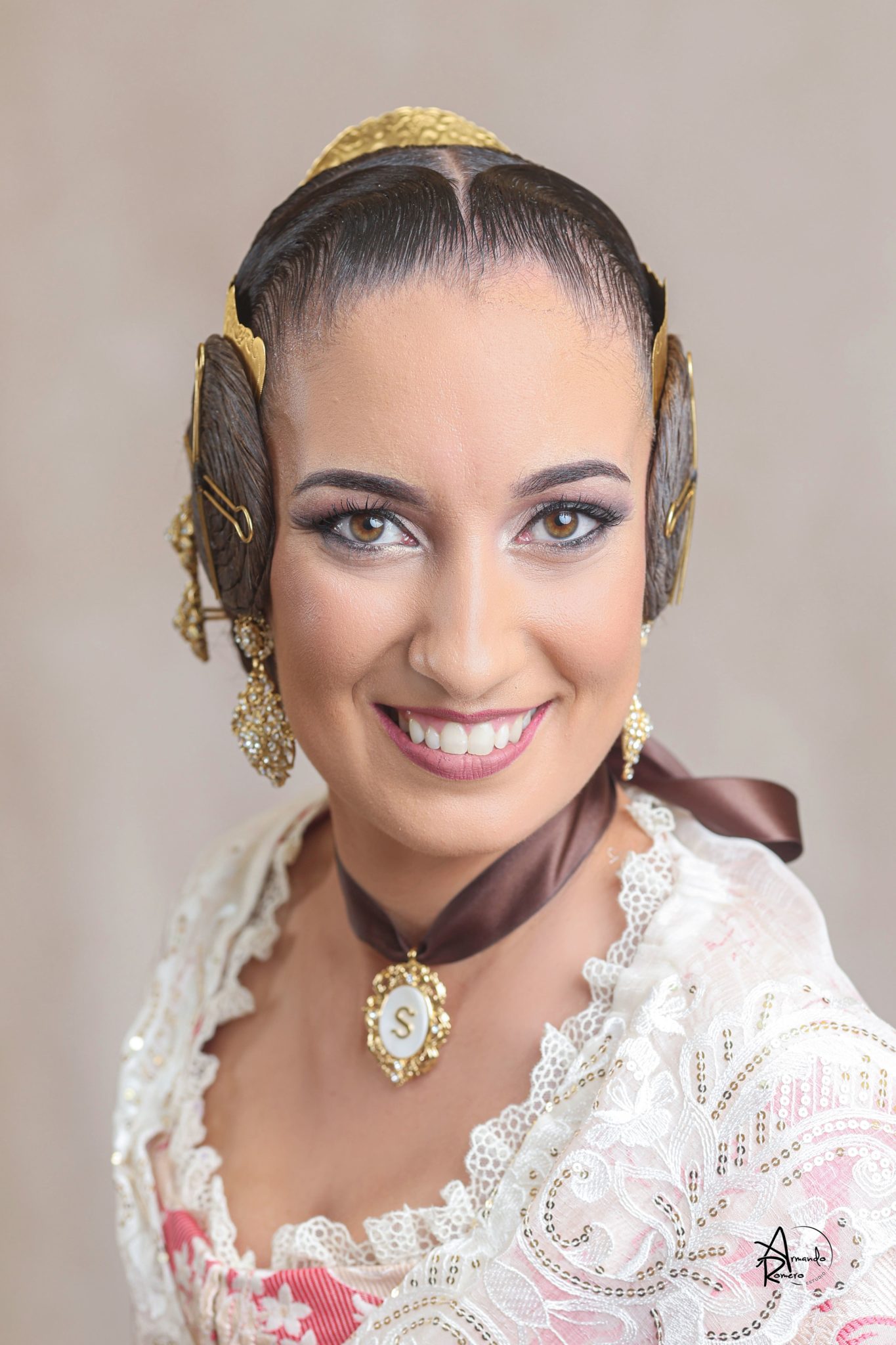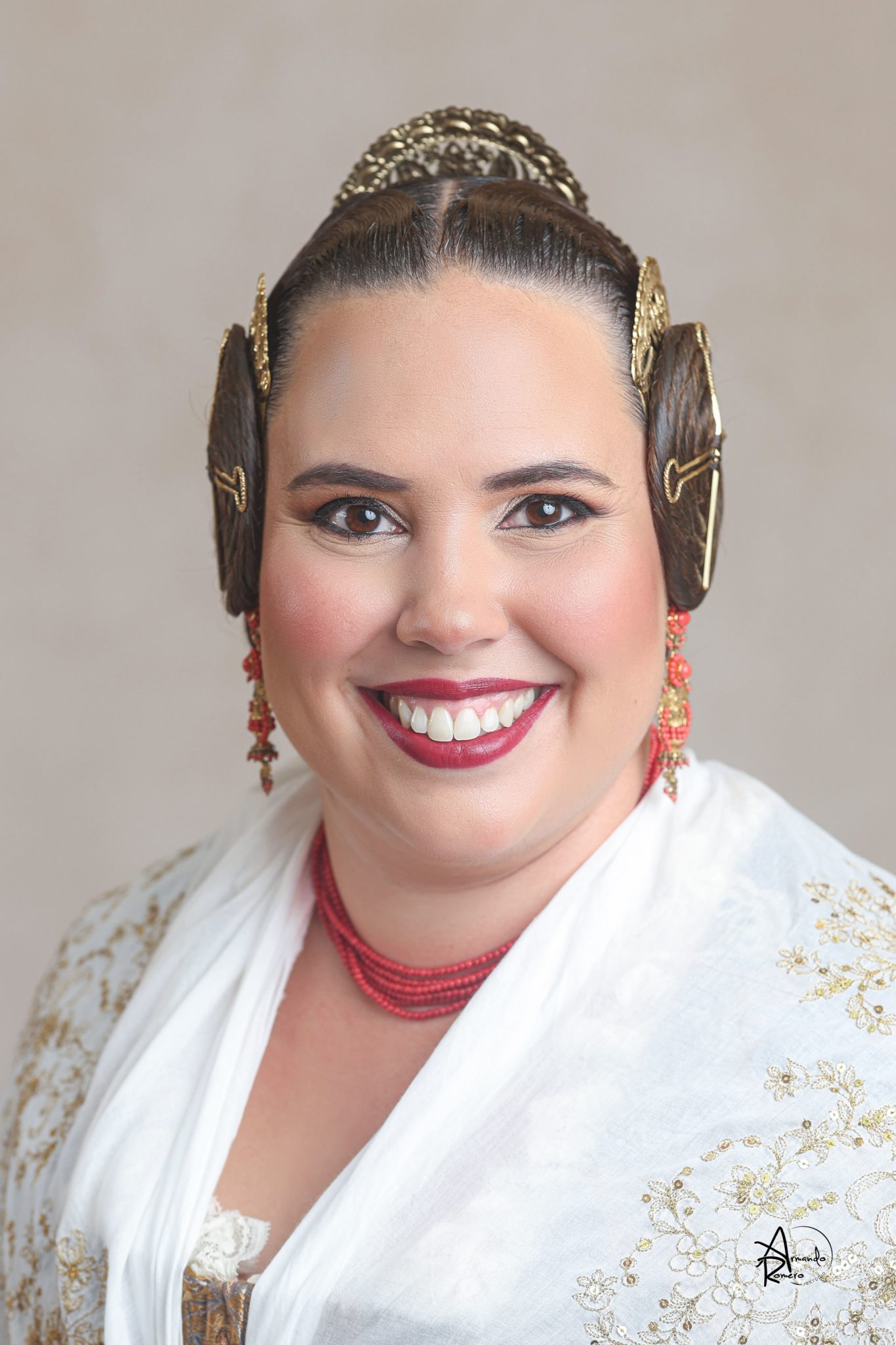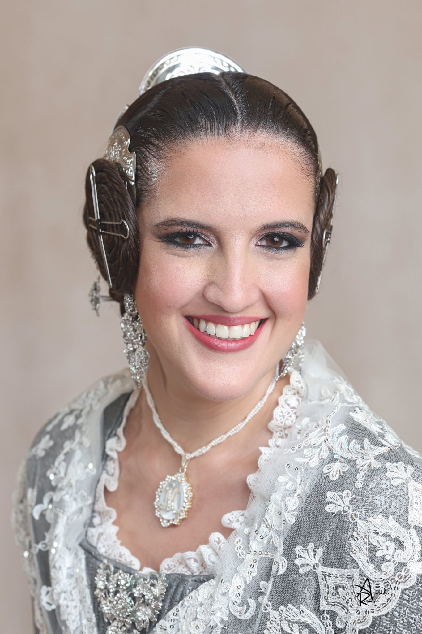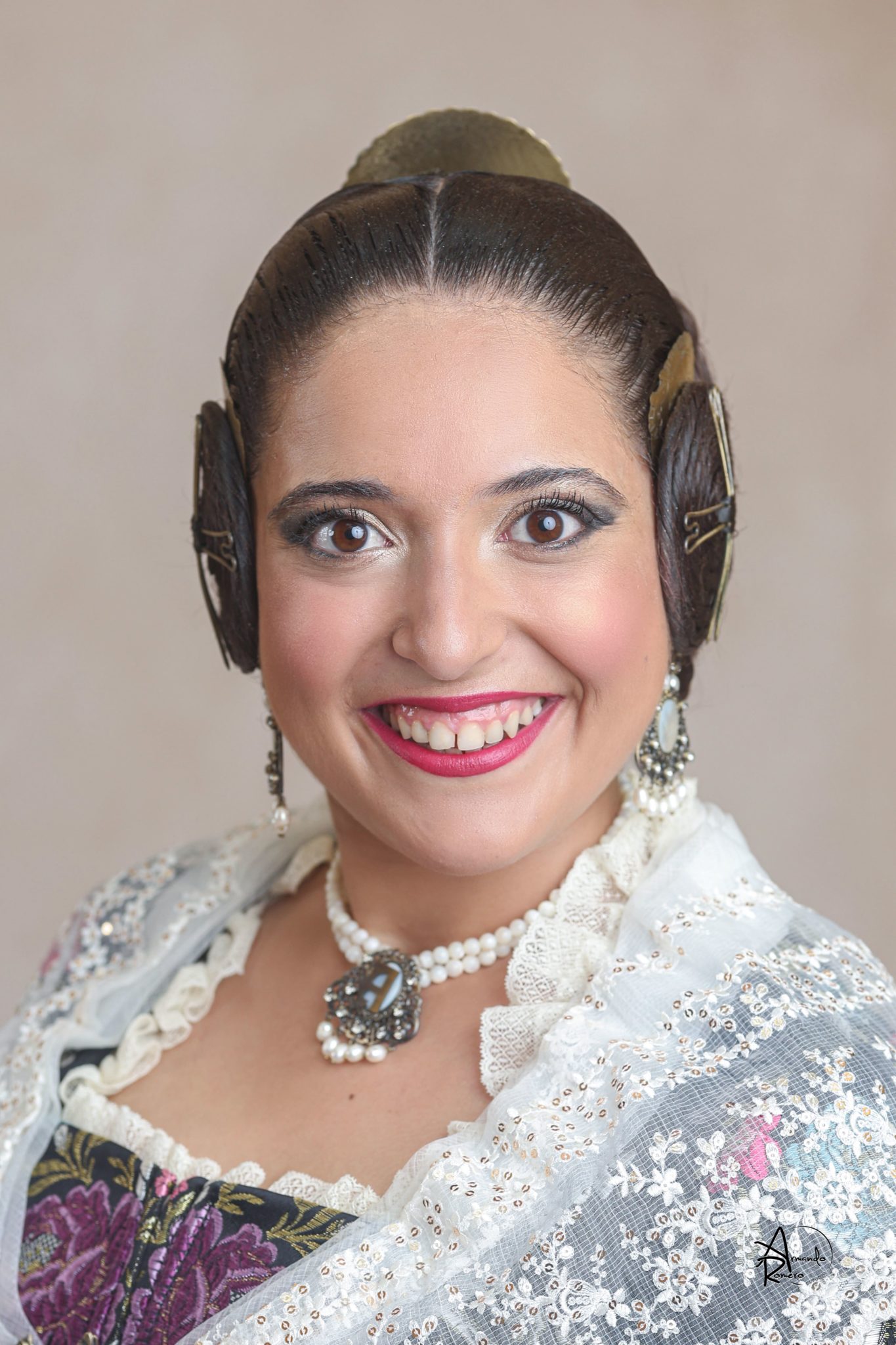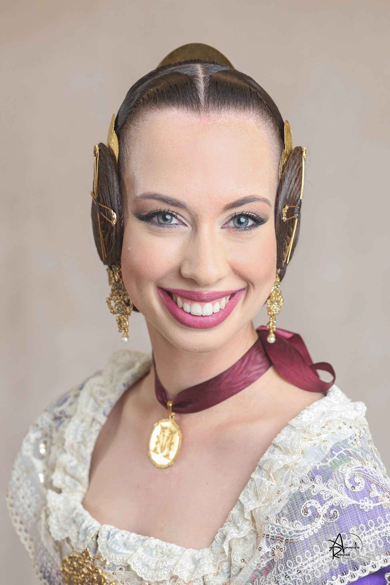 Uno de los momentos más esperados de la noche fue el descubrimiento del traje, que concentró todas las miradas del auditorio. Juana Paula Centeno Roig apareció con un espolín Soto de color azul, una elección cargada de simbolismo en la tradición valenciana, y es que este tono se asocia a la nobleza, la serenidad y la elegancia clásica de la indumentaria histórica. El tejido, confeccionado por Amparo Fabra, destaca por la riqueza del dibujo y la profundidad del color, que aporta sobriedad y presencia escénica.