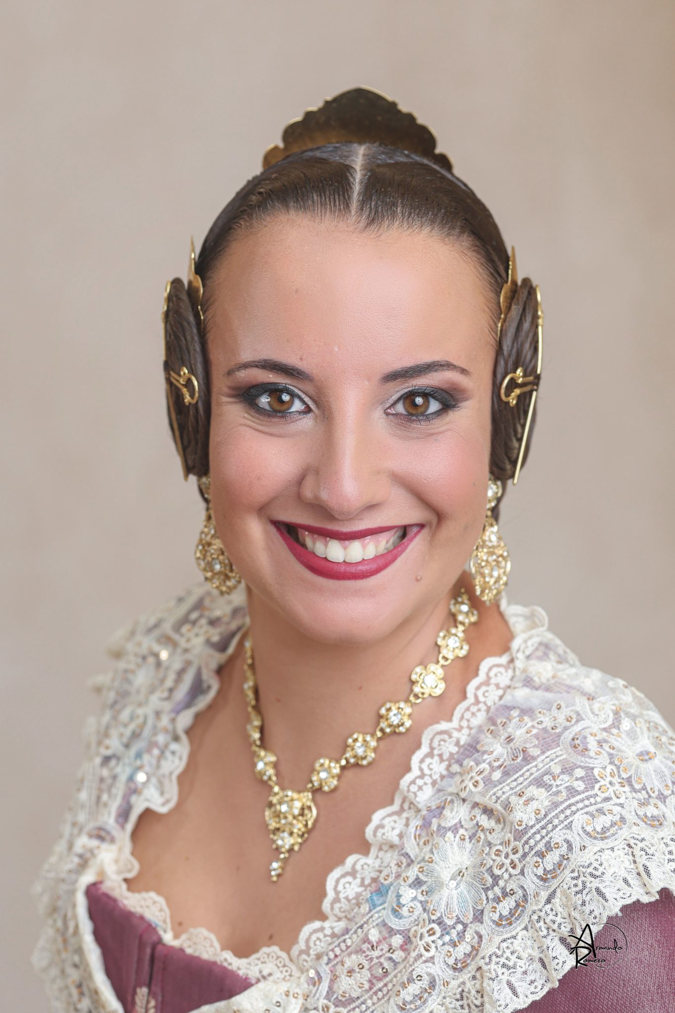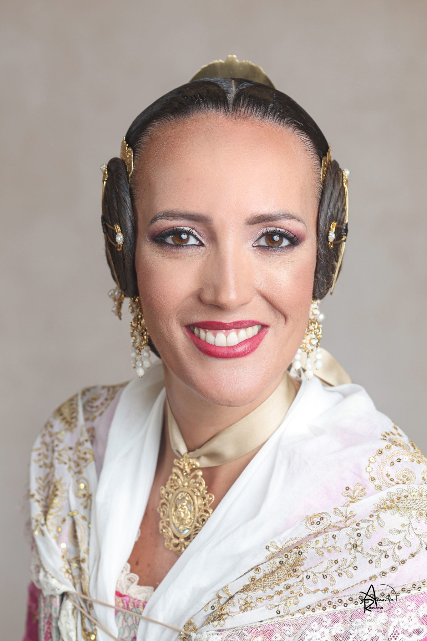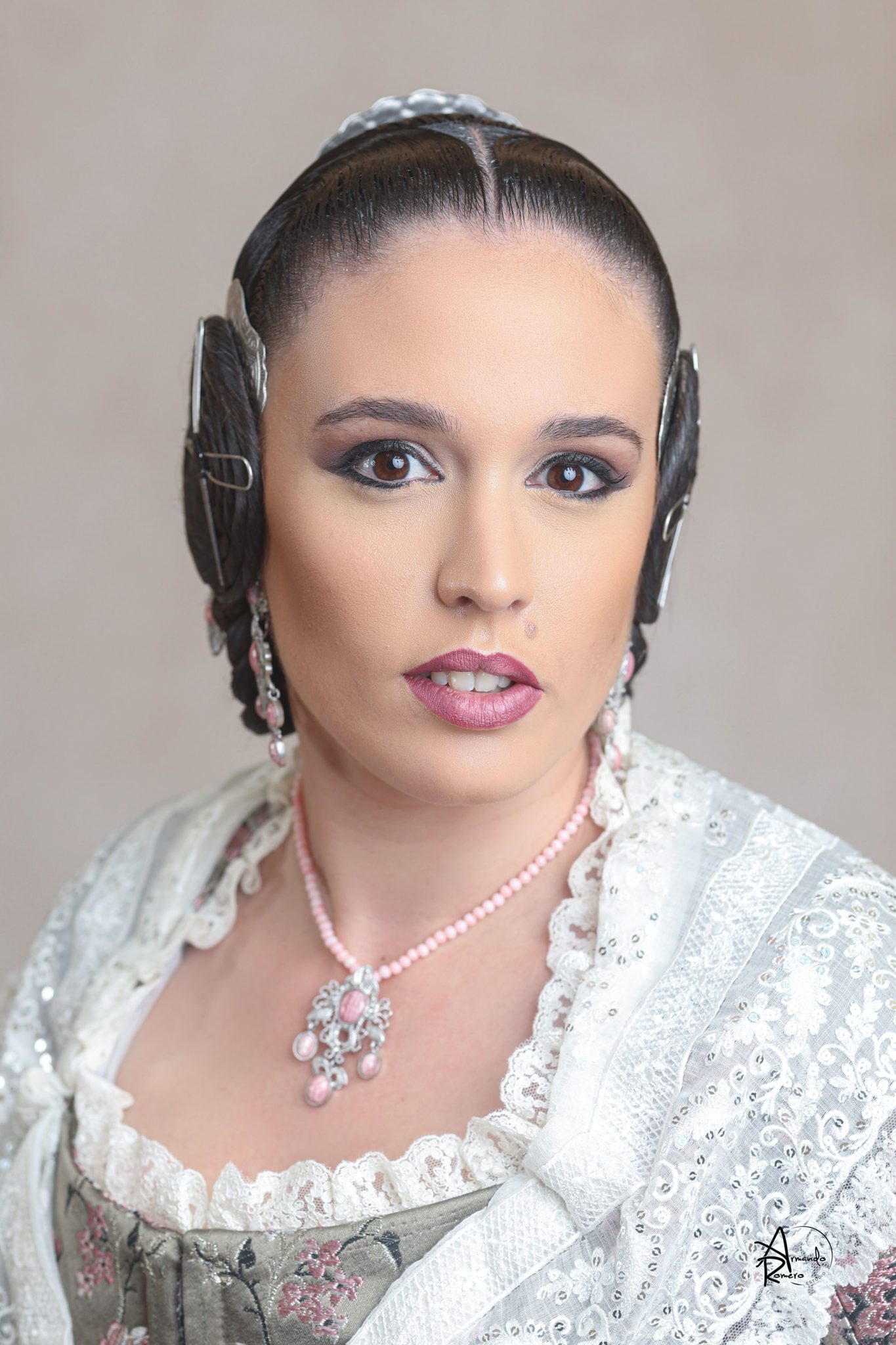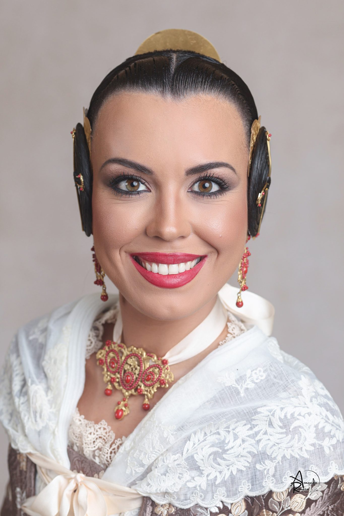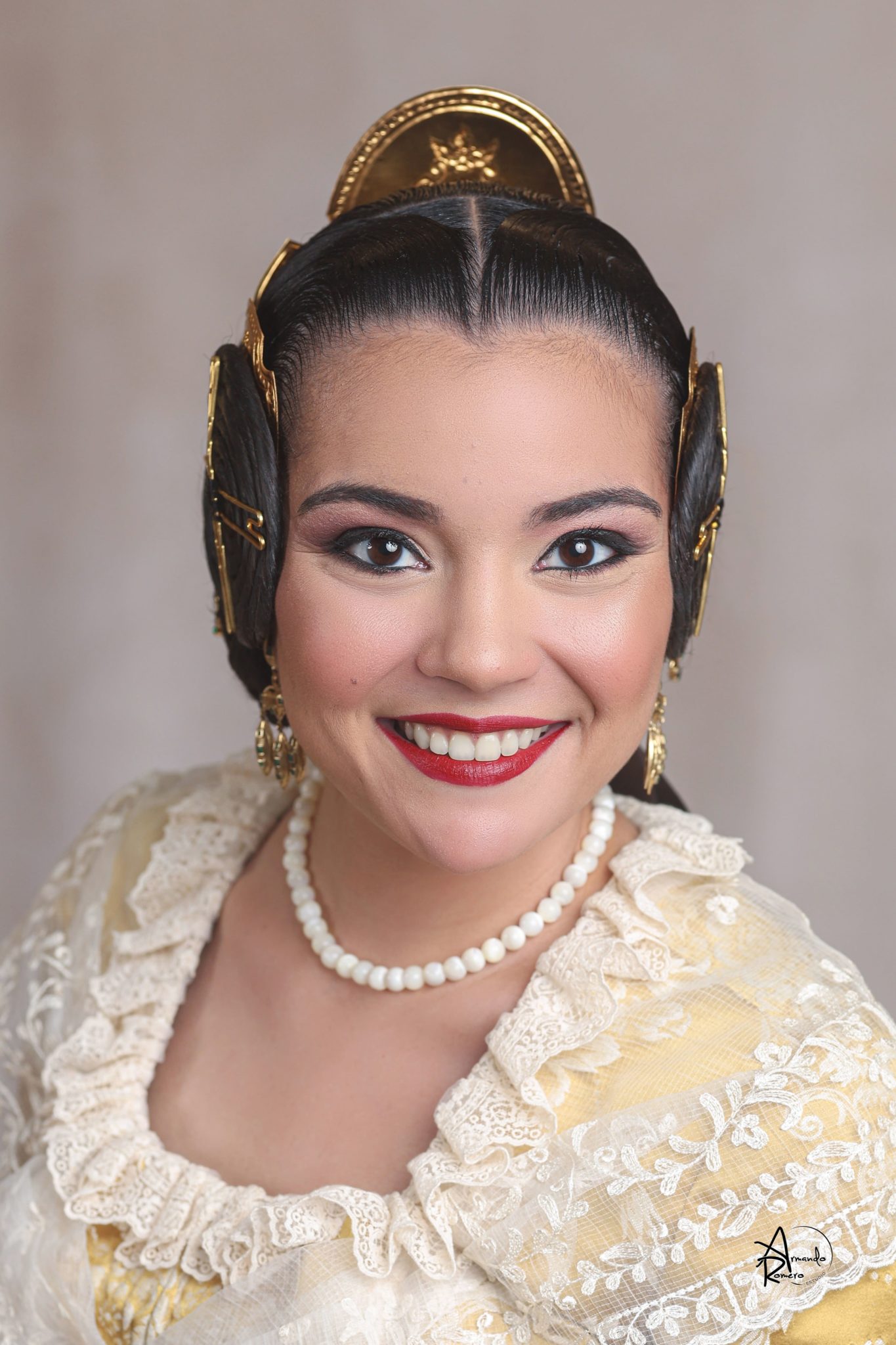 Uno de los momentos más esperados de la noche fue el descubrimiento del traje, que concentró todas las miradas del auditorio. Juana Paula Centeno Roig apareció con un espolín Soto de color azul, una elección cargada de simbolismo en la tradición valenciana, y es que este tono se asocia a la nobleza, la serenidad y la elegancia clásica de la indumentaria histórica. El tejido, confeccionado por Amparo Fabra, destaca por la riqueza del dibujo y la profundidad del color, que aporta sobriedad y presencia escénica.