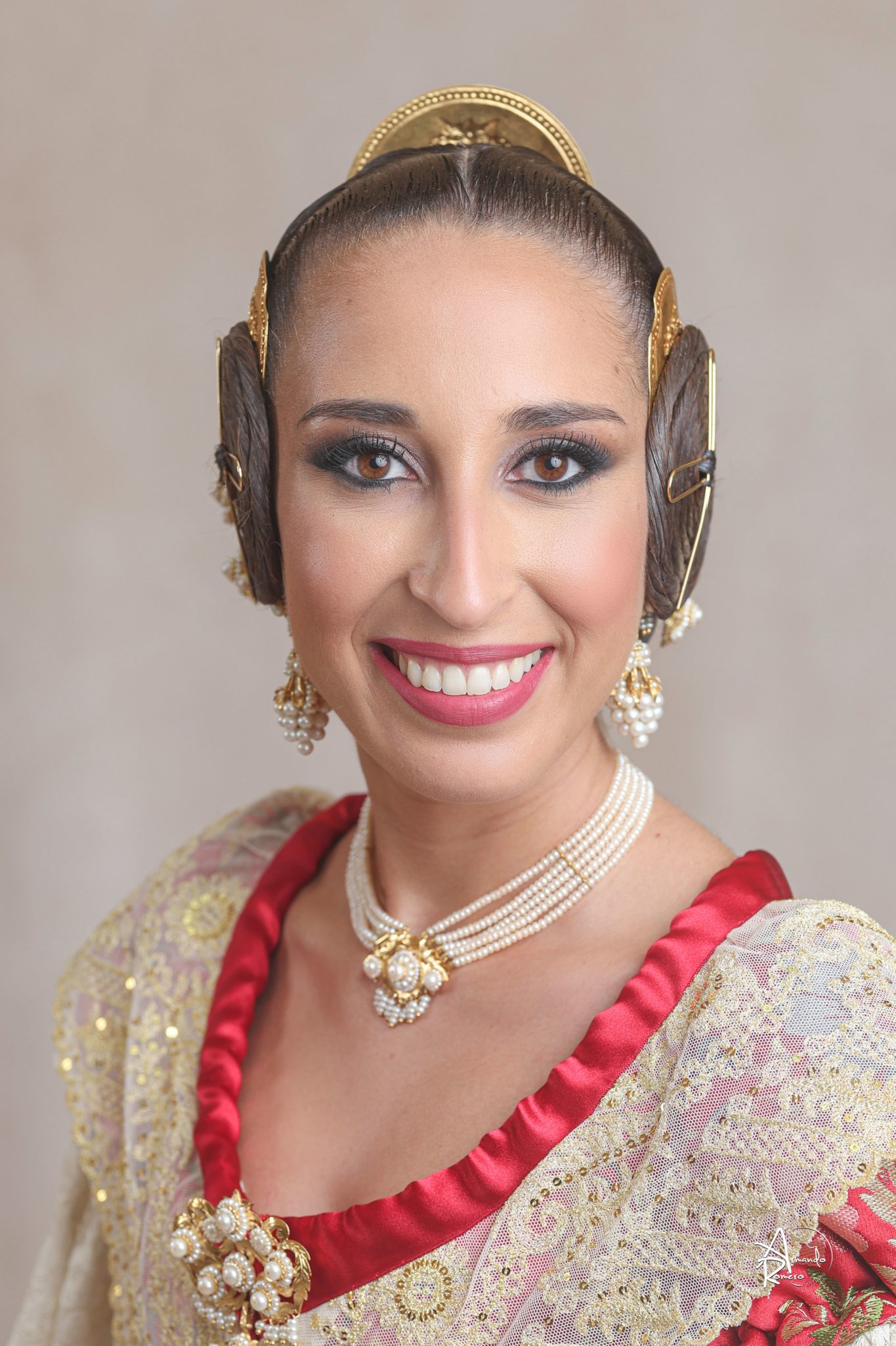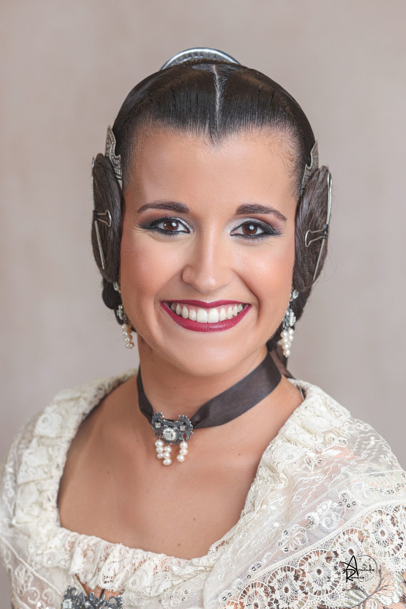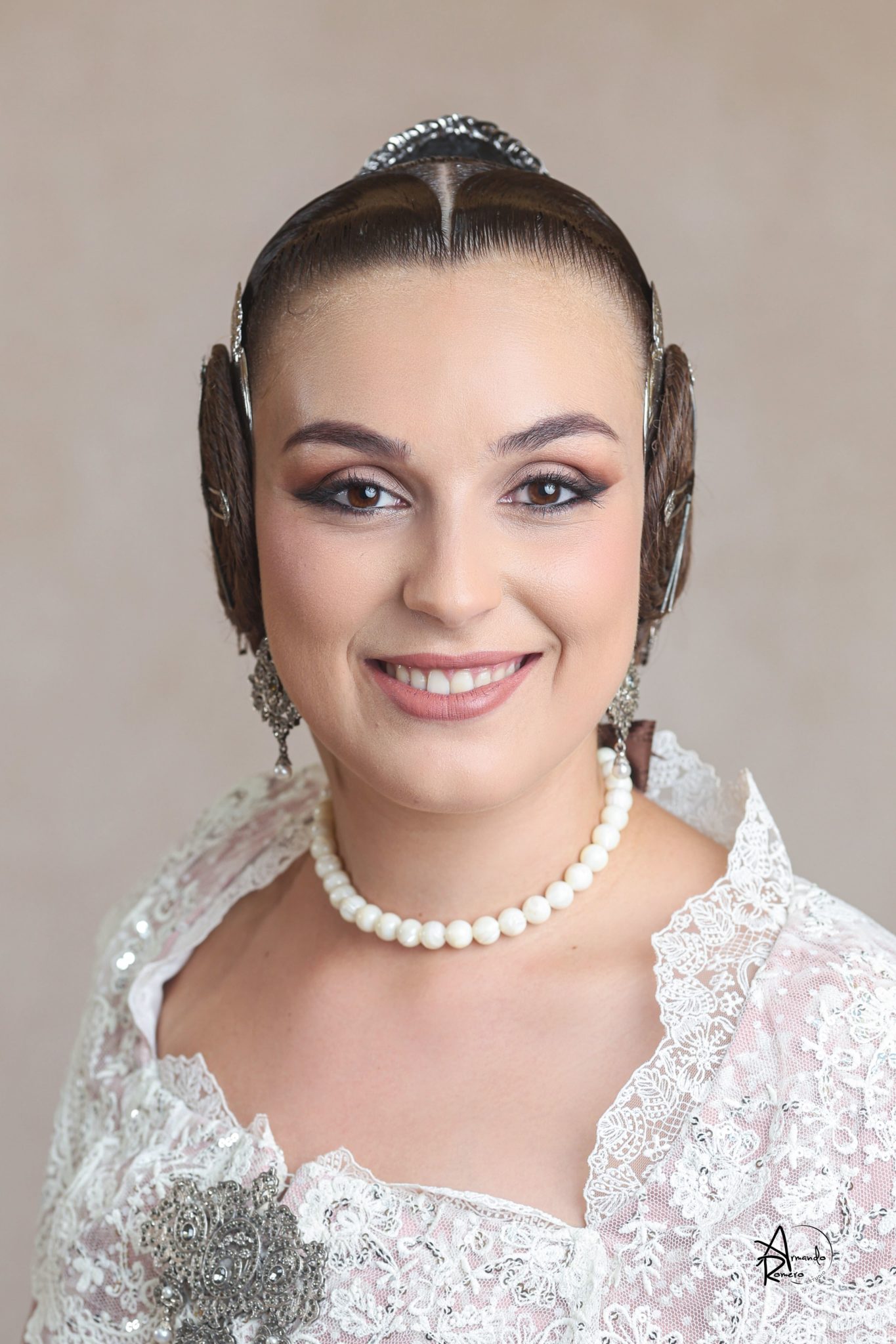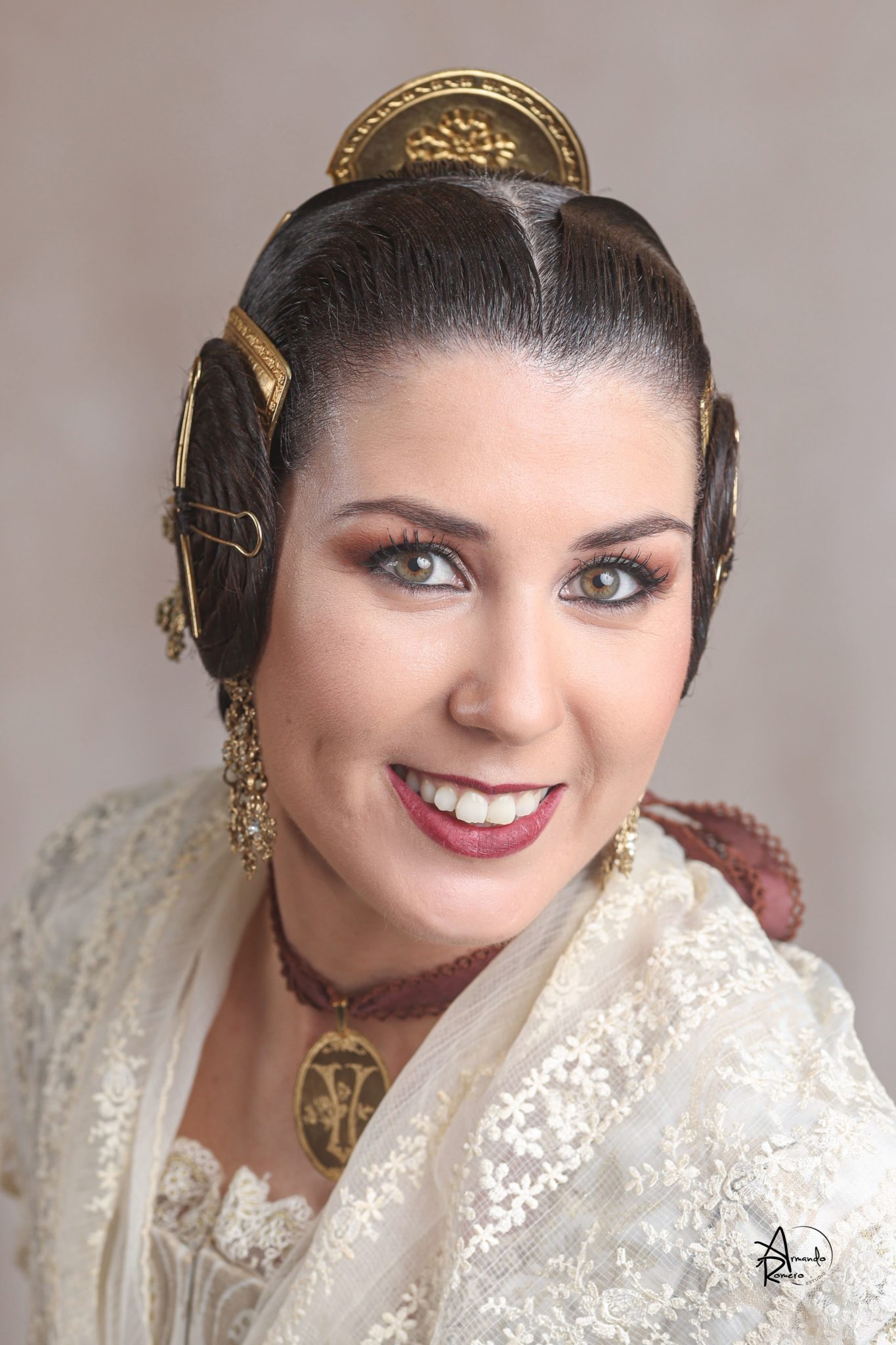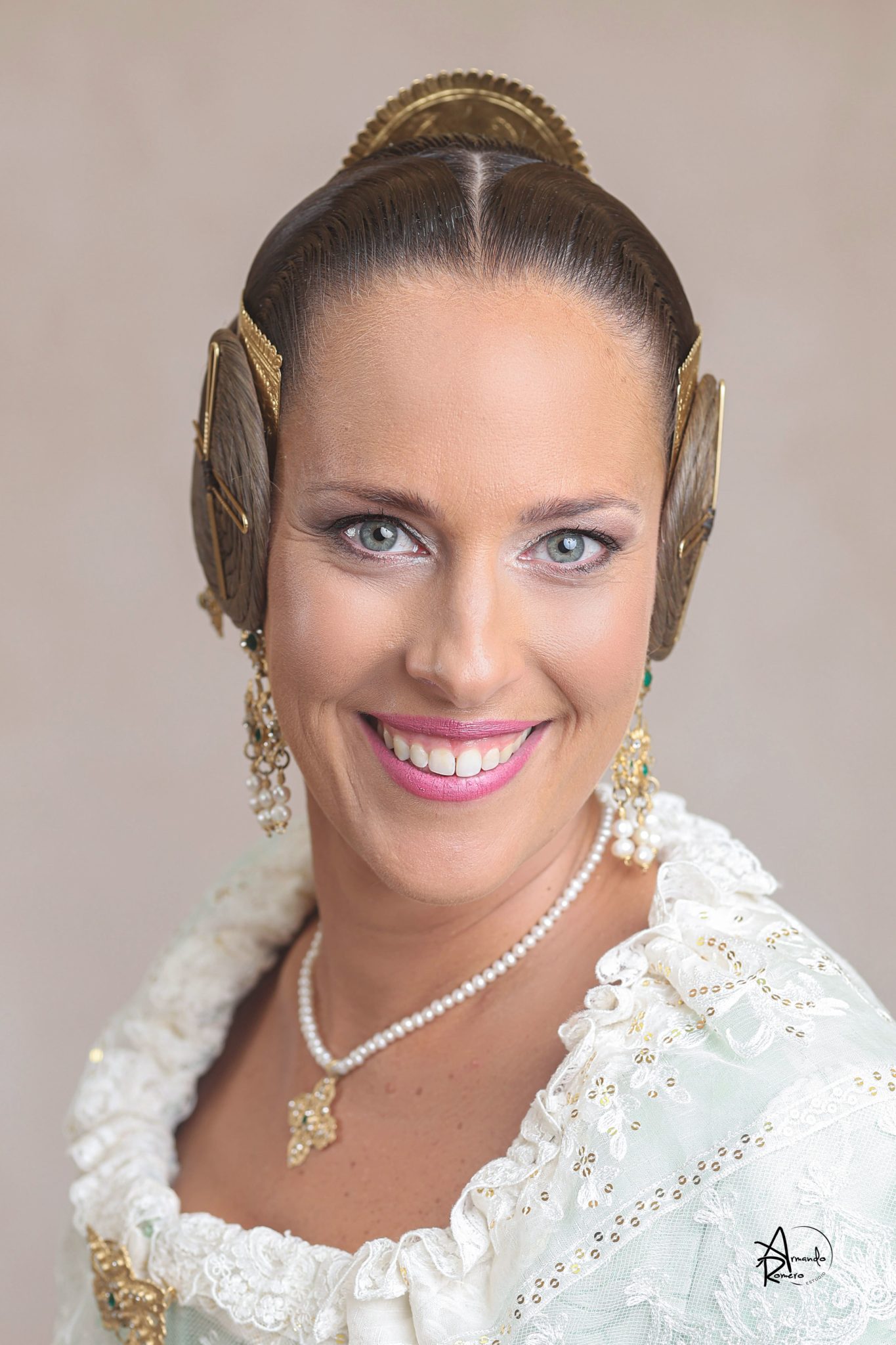 Uno de los momentos más esperados de la noche fue el descubrimiento del traje, que concentró todas las miradas del auditorio. Juana Paula Centeno Roig apareció con un espolín Soto de color azul, una elección cargada de simbolismo en la tradición valenciana, y es que este tono se asocia a la nobleza, la serenidad y la elegancia clásica de la indumentaria histórica. El tejido, confeccionado por Amparo Fabra, destaca por la riqueza del dibujo y la profundidad del color, que aporta sobriedad y presencia escénica.