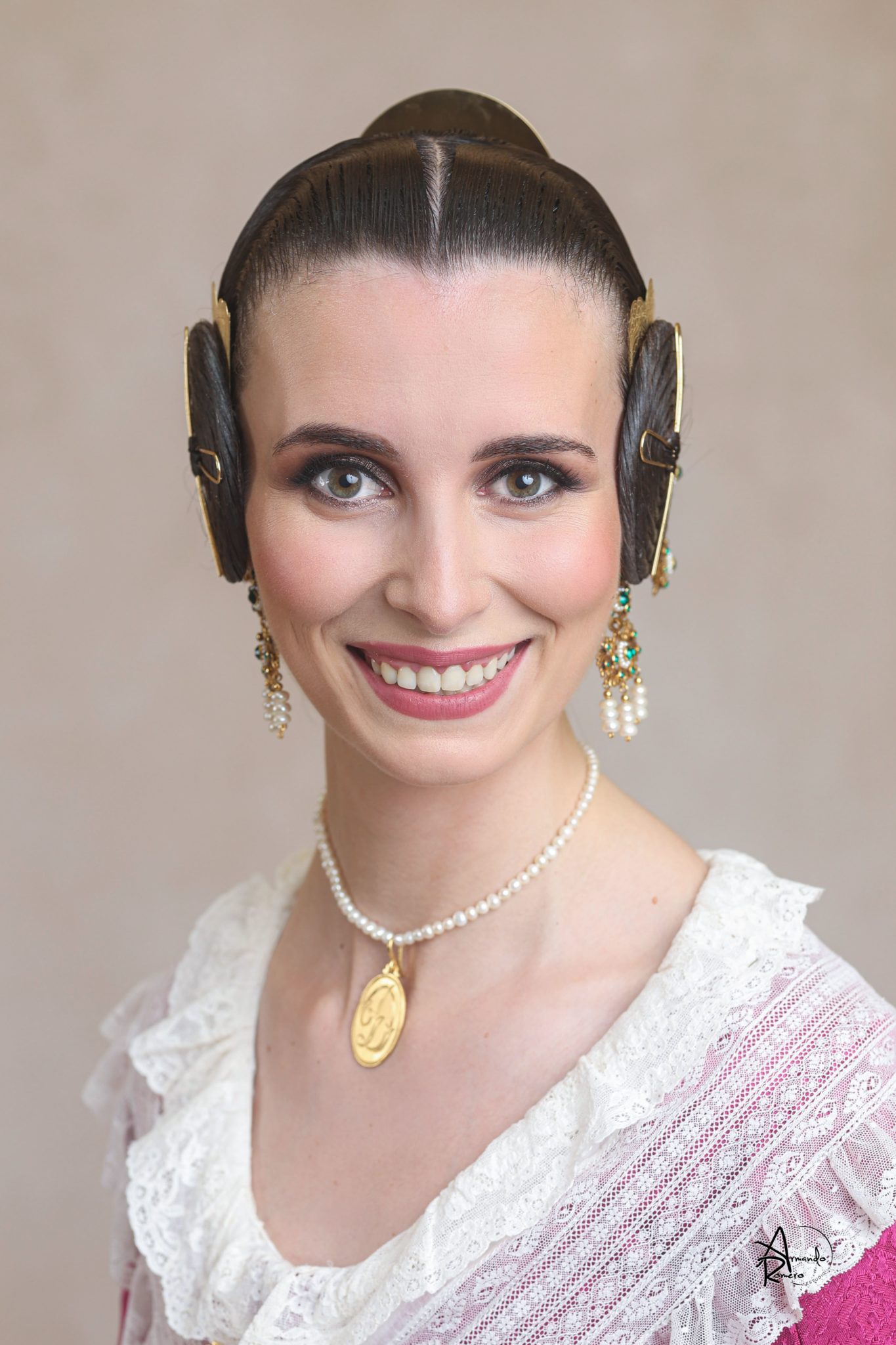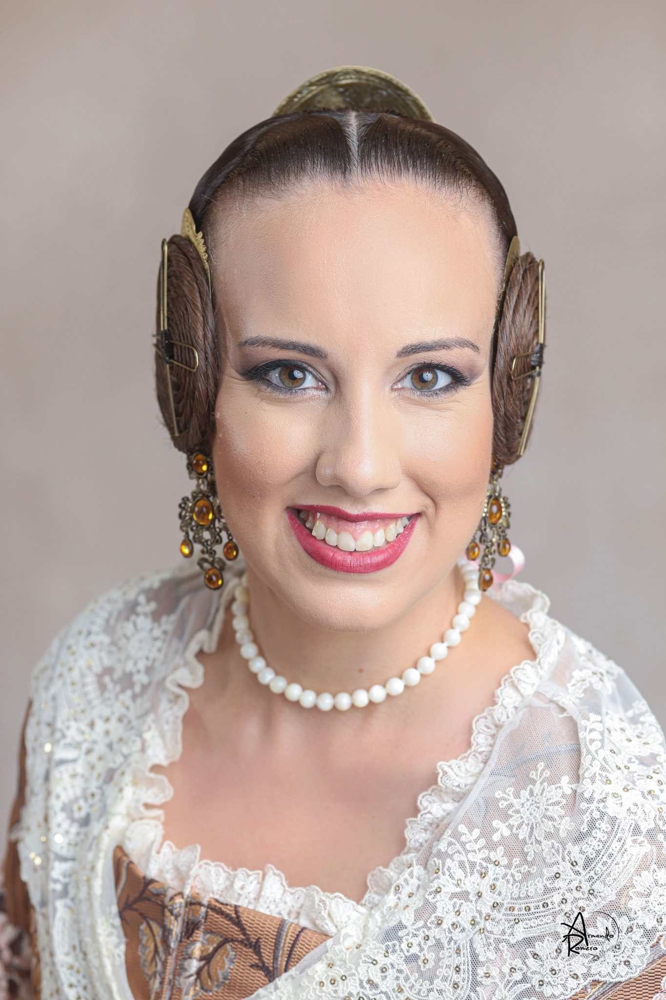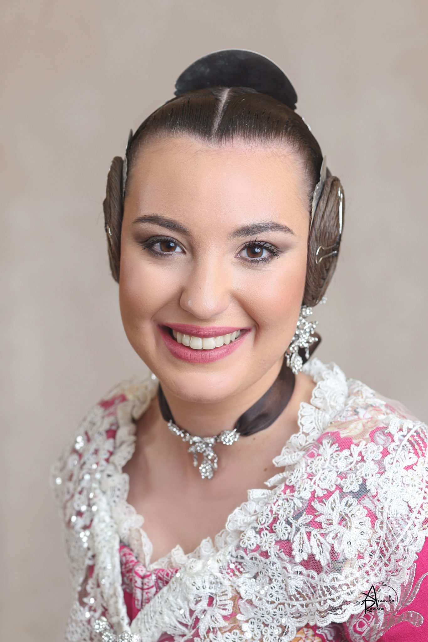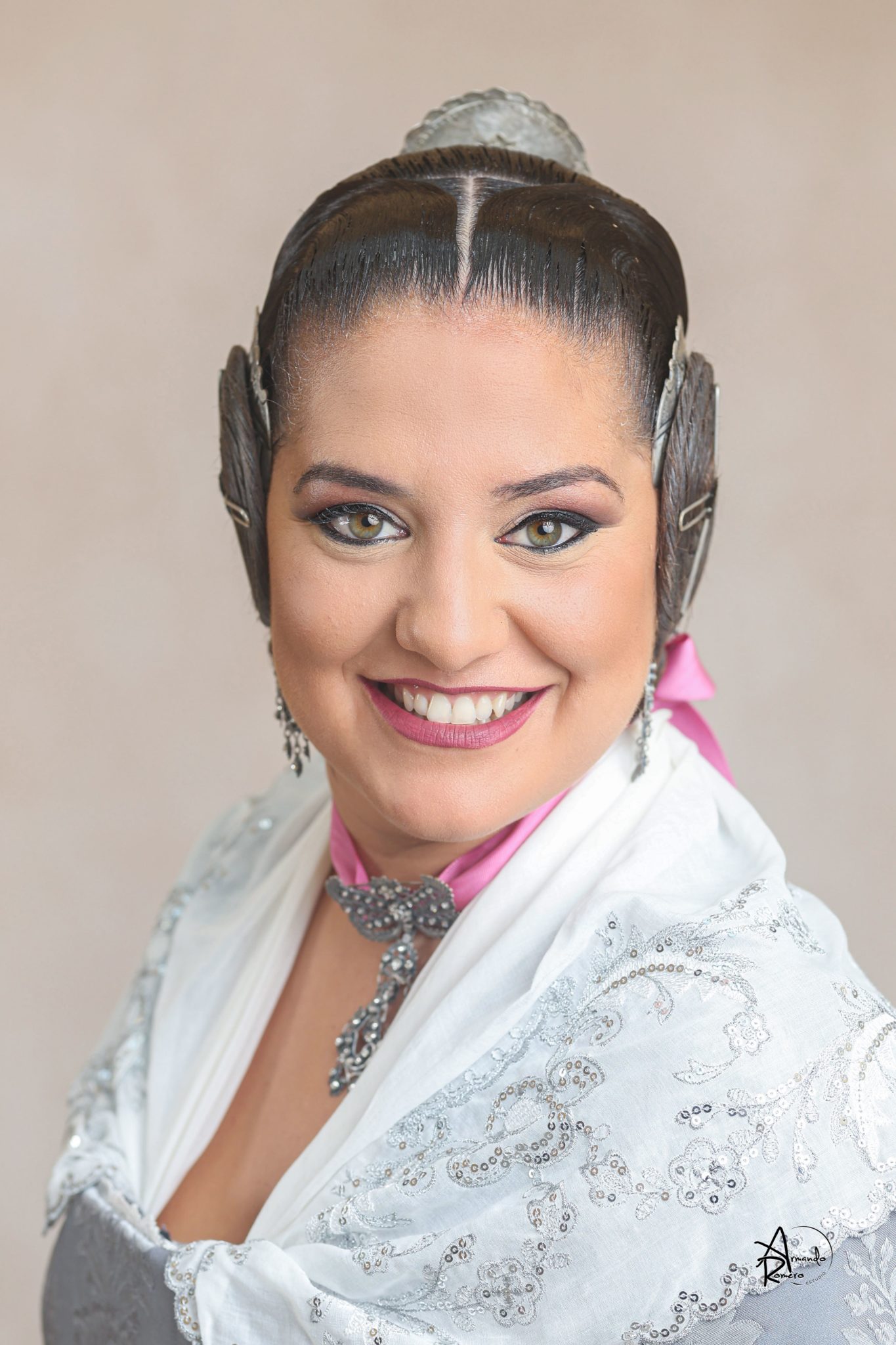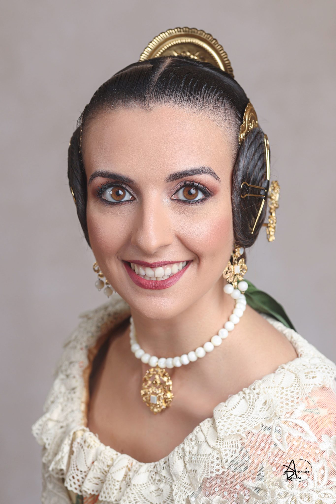 Uno de los momentos más esperados de la noche fue el descubrimiento del traje, que concentró todas las miradas del auditorio. Juana Paula Centeno Roig apareció con un espolín Soto de color azul, una elección cargada de simbolismo en la tradición valenciana, y es que este tono se asocia a la nobleza, la serenidad y la elegancia clásica de la indumentaria histórica. El tejido, confeccionado por Amparo Fabra, destaca por la riqueza del dibujo y la profundidad del color, que aporta sobriedad y presencia escénica.