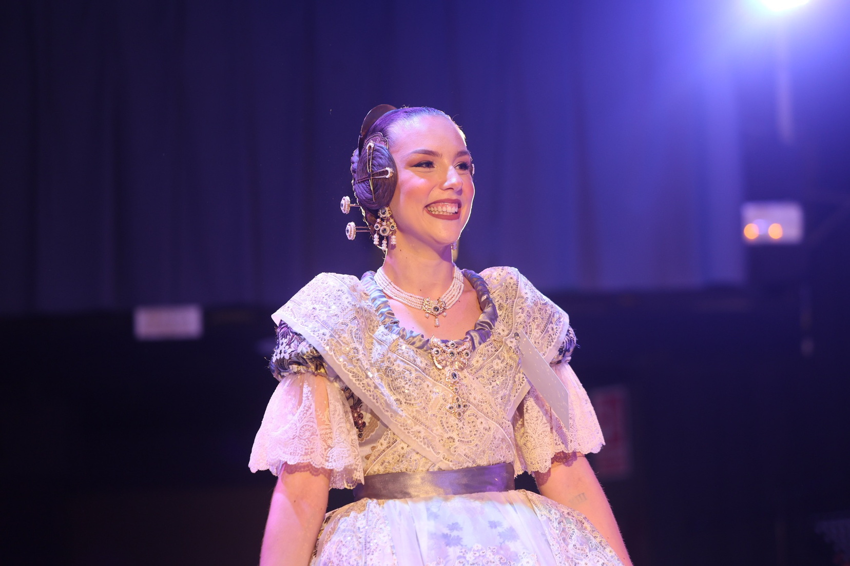 Las puntillas, tanto de las mangas como del escote, son antiguas, un detalle que eleva aún más el valor patrimonial del traje y refuerza su conexión con la tradición y la historia de la indumentaria valenciana.