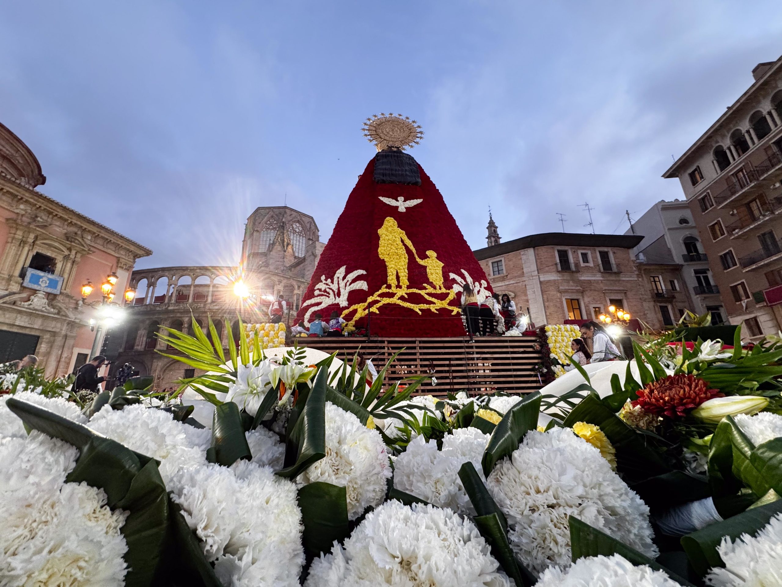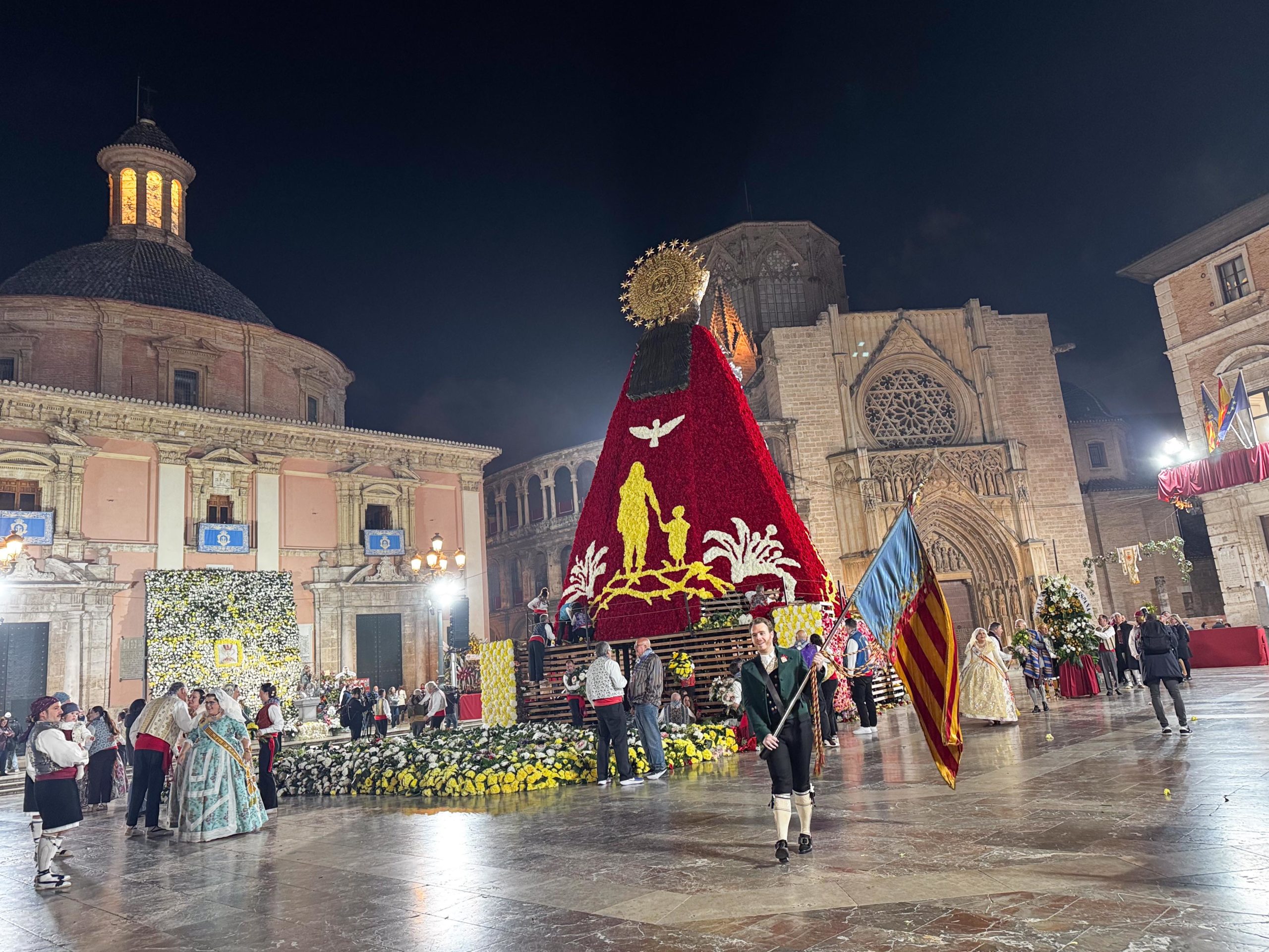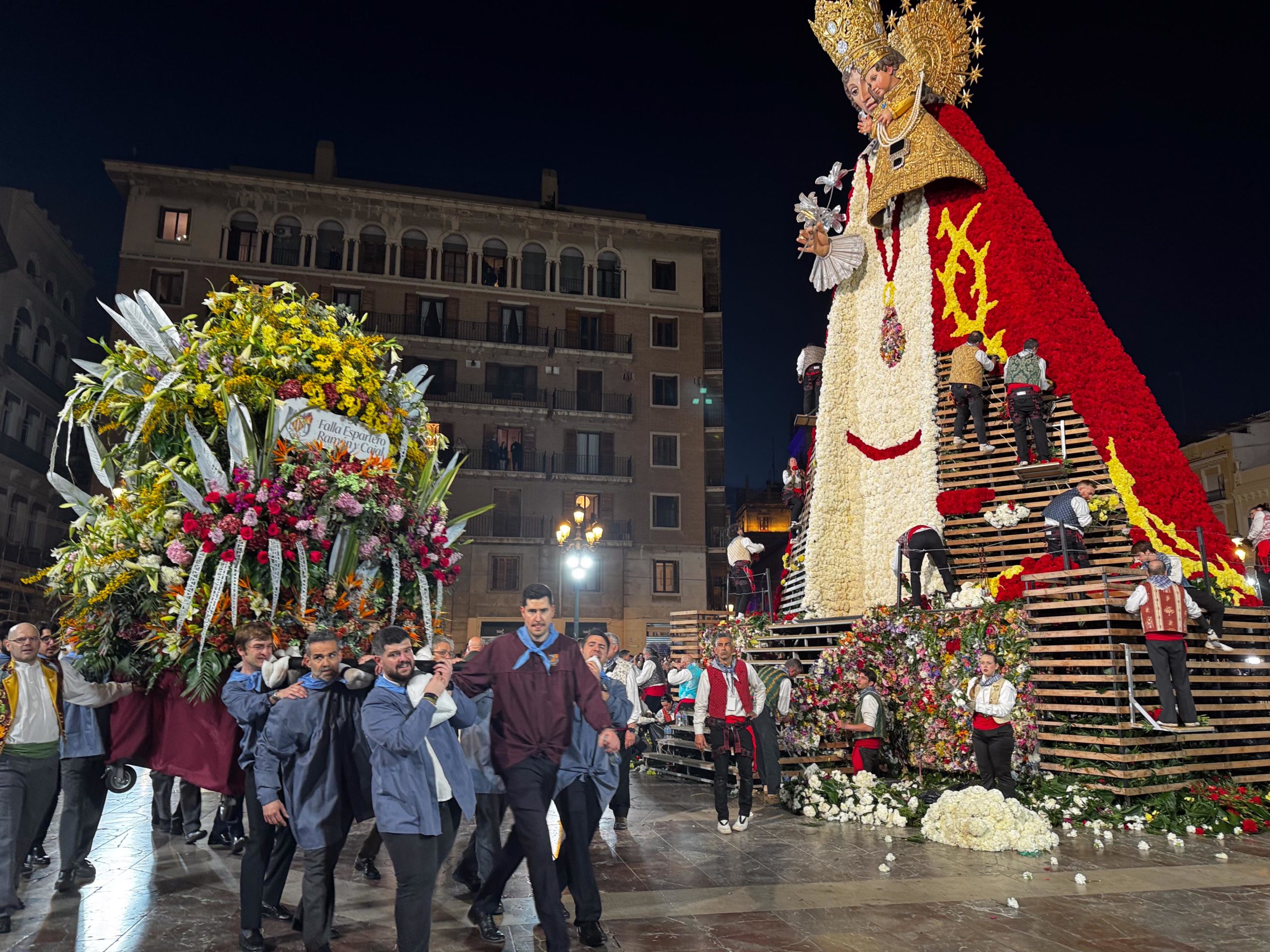La Ofrenda continuará este 18 de marzo, cuando más comisiones falleras desfilarán para completar el manto floral antes de la llegada de la Nit del Foc y el día de San José, que pondrá el broche final a las fiestas.
