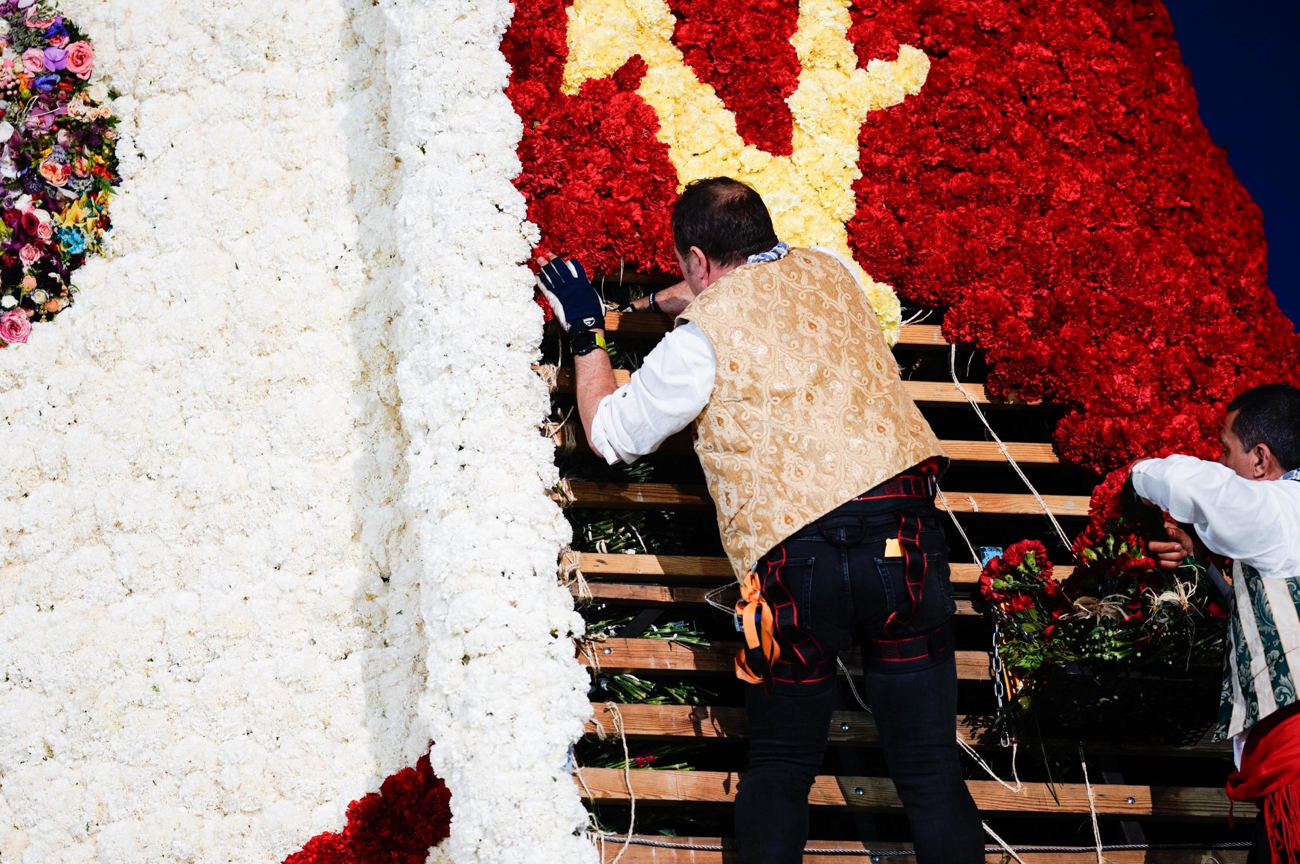Los ramos de flores depositados han comenzado ya a dar forma al manto de la patrona, una de las imágenes más icónicas de las Fallas.
