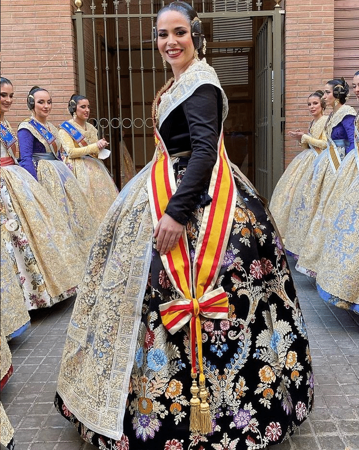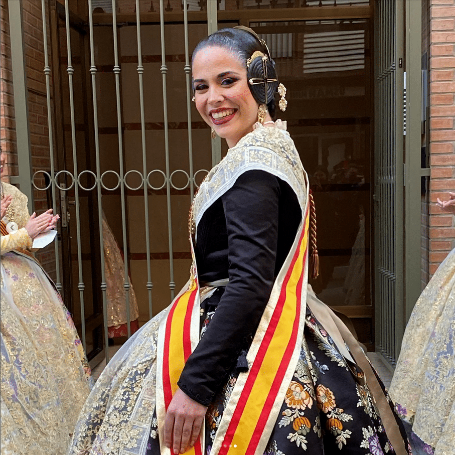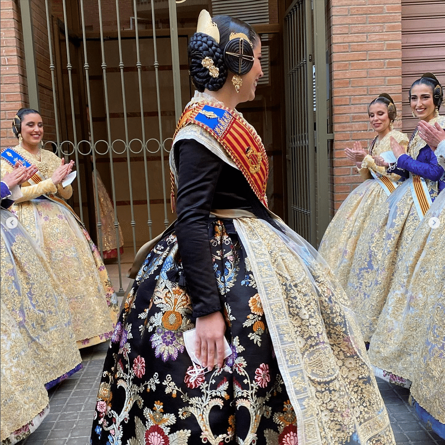 A l’Antiga Torrent ha sido la indumentarista encargada de la confección del vestido con el que ha lucido unas manteletas de nueva colección bordadas con nipi y tul de Hijas de Carmen Esteve.  El aderezo, regalo de su corte ha sido obra de Art Antic. Las peinetas, un dibujo exclusivo para Carmen de Més que pintes. Mientras que la puntilla, rememora un diseño antiguo de Santos Textil.