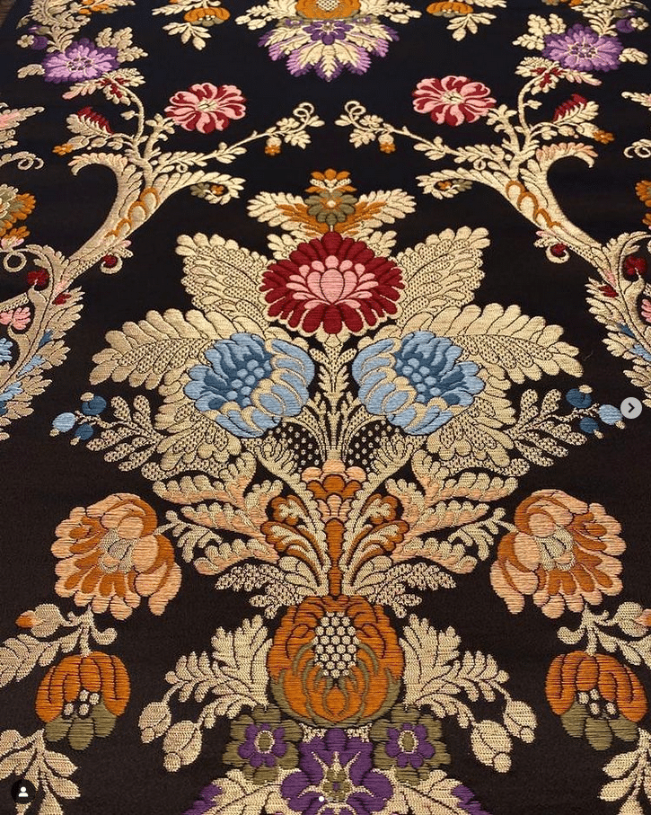 Este lampazo de nombre “Arabesco” está tejido en seda natural tanto la urdimbre como las tramas. La urdimbre de color negro conecta de manera especial y deslumbrante con los metales, donde a petición y apuesta acertadísima de Carmen se entre mezclan a lo largo de todo el dibujo los dos metales, el oro viejo con el champagne resultando en una pieza única para la historia. El colorido de las tramas en fríos y cálidos destaca por su gran relieve que es característico del los tejidos Lampazo.