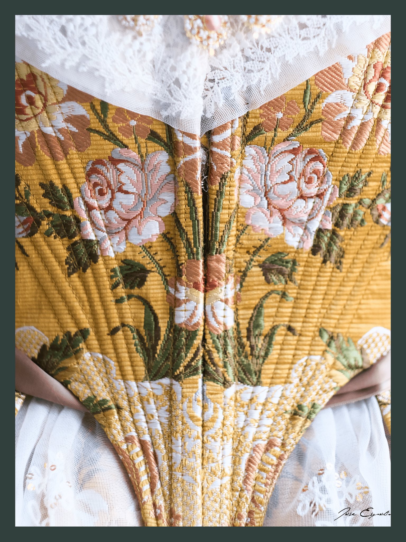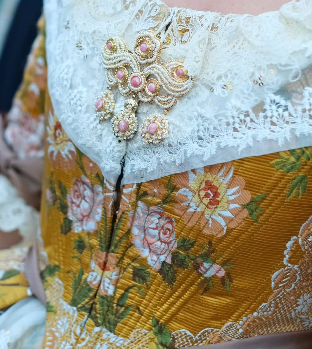 La confección clásica resalta la esencia de la indumentaria valenciana: manteletas de encaje bordadas con lentejuelas, un aderezo de girándolas con lazo trabajado en perla de mostacilla y piedras naturales de rodocrosita, y unos zapatos abotinados con pompones de seda en color caramelo, en perfecta sintonía con los lazos del conjunto.
