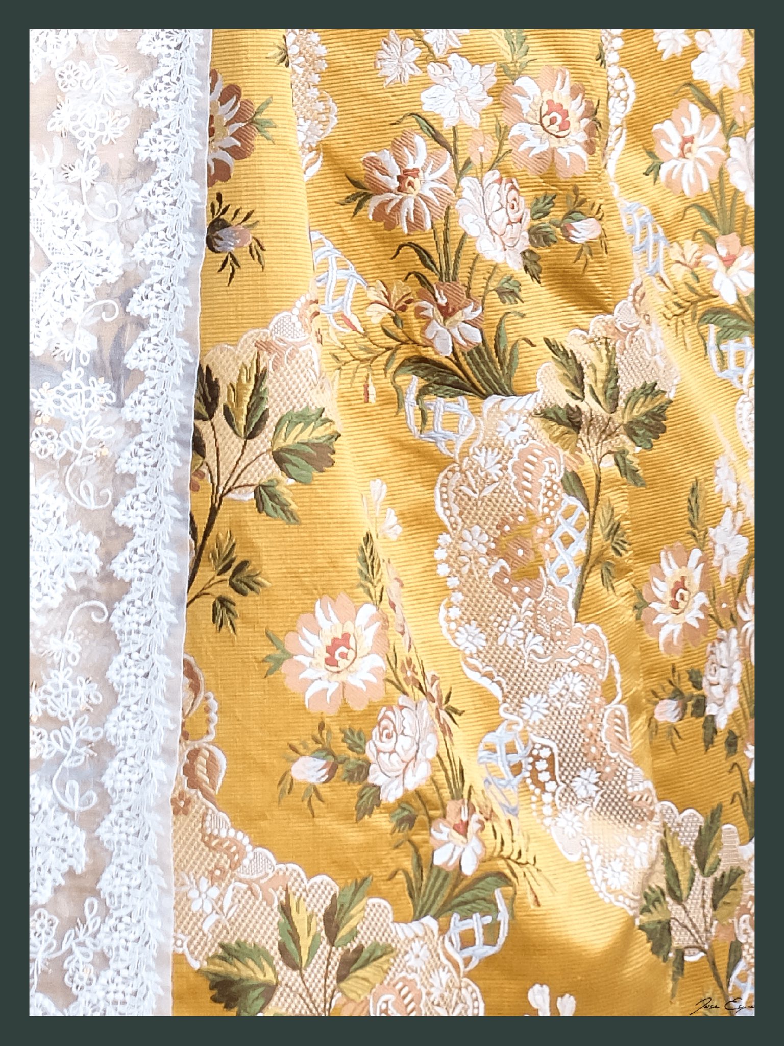 El tejido elegido no podría ser más especial: una tapicería espolinada en seda 100%. Cada hilo encierra historia, arte y sentimiento. De fondo color mostaza, su dibujo asimétrico se entrelaza con tres tonalidades de verde y flores en beig, rosa empolvado y nude, componiendo una armonía de colores digna de los salones más nobles del siglo XVIII.