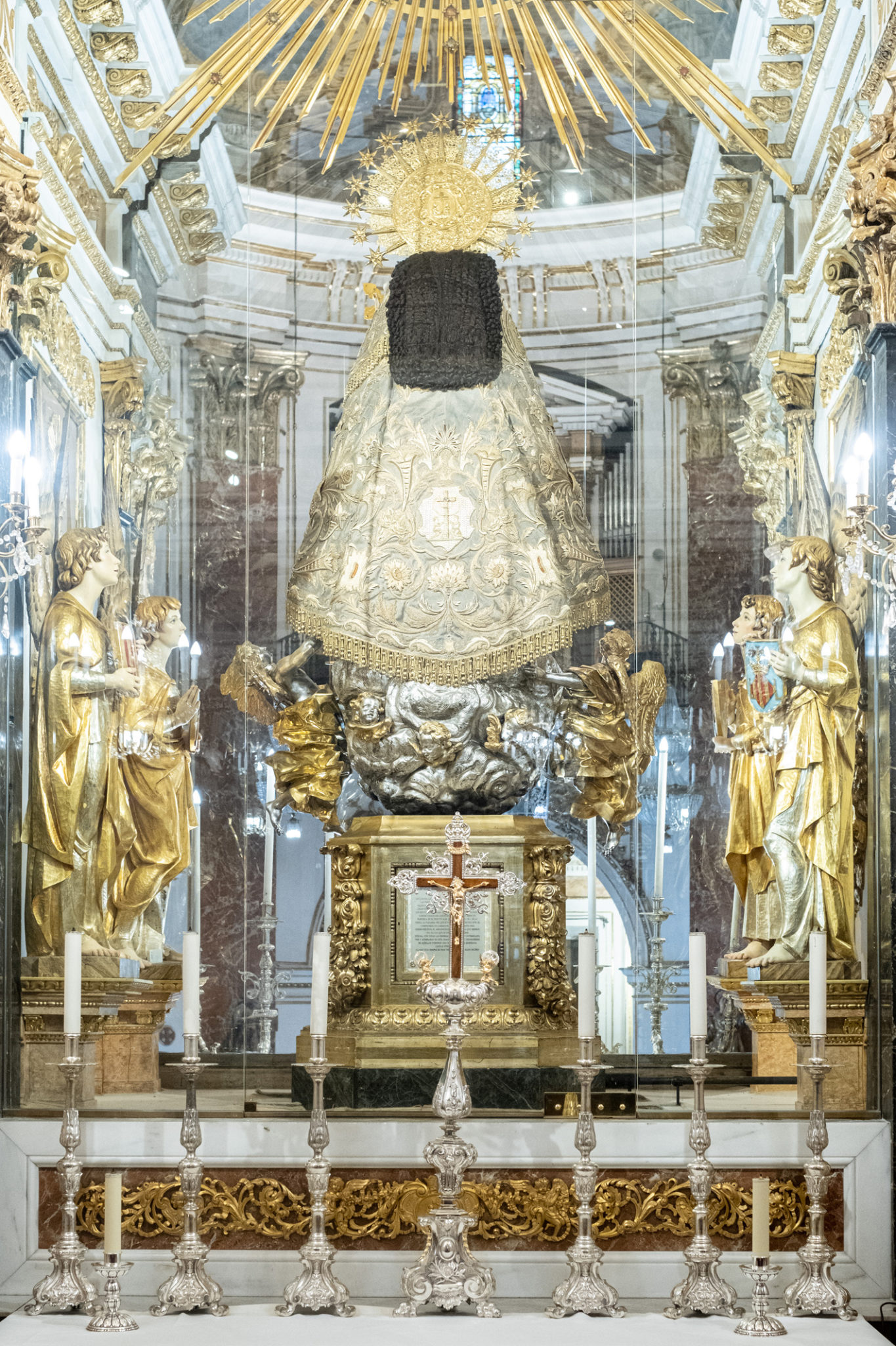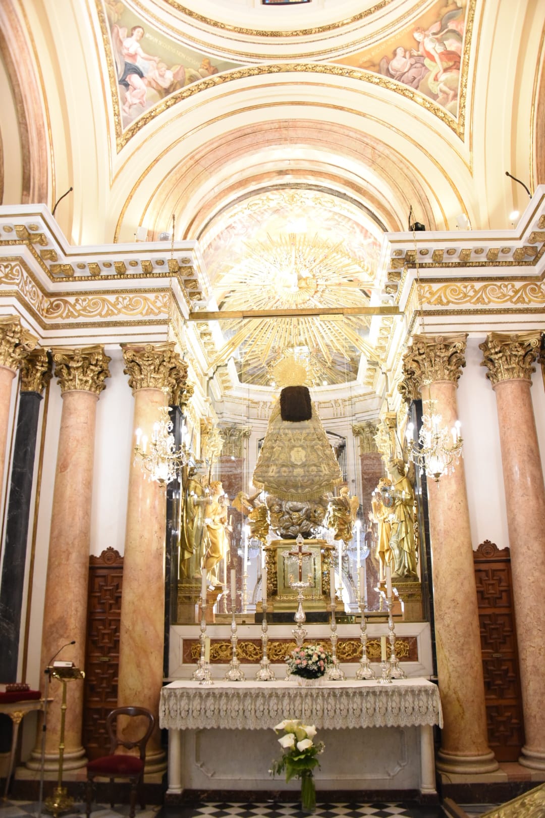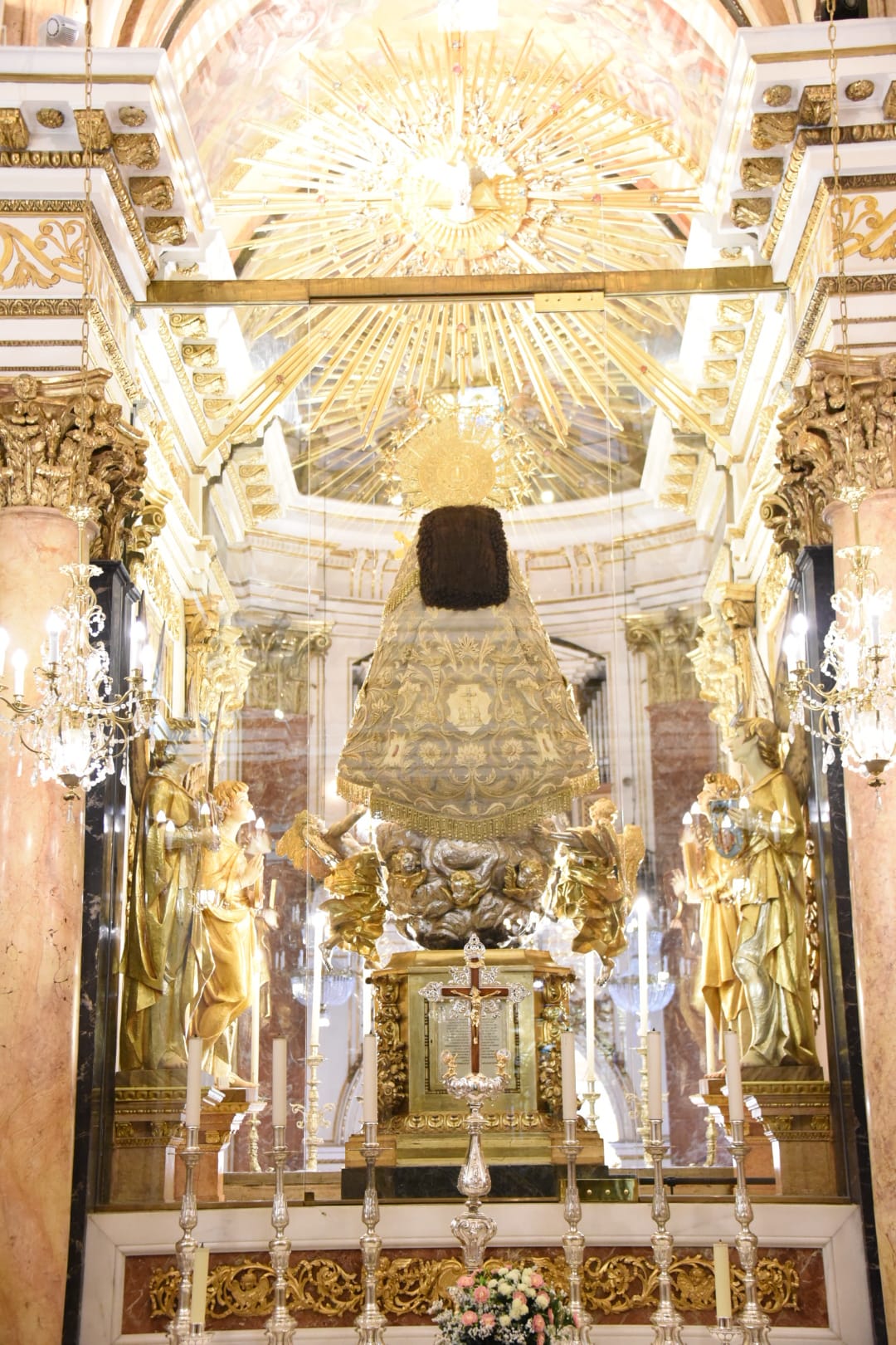 La imagen de la Virgen de los Desamparados del altar mayor de la Basílica lucirá durante todo el Año Jubilar Mariano del Centenario de la Coronación uno de sus mantos históricos, conocido como el “Manto del Año Mariano Universal” del año 1954.