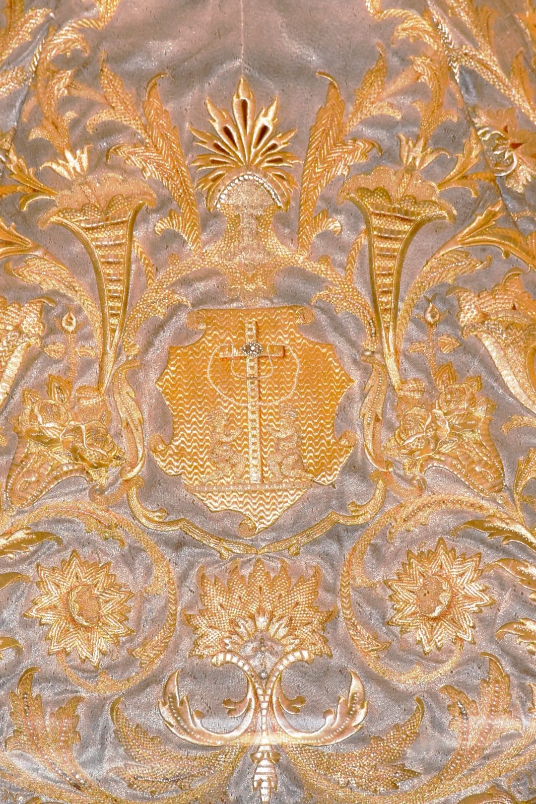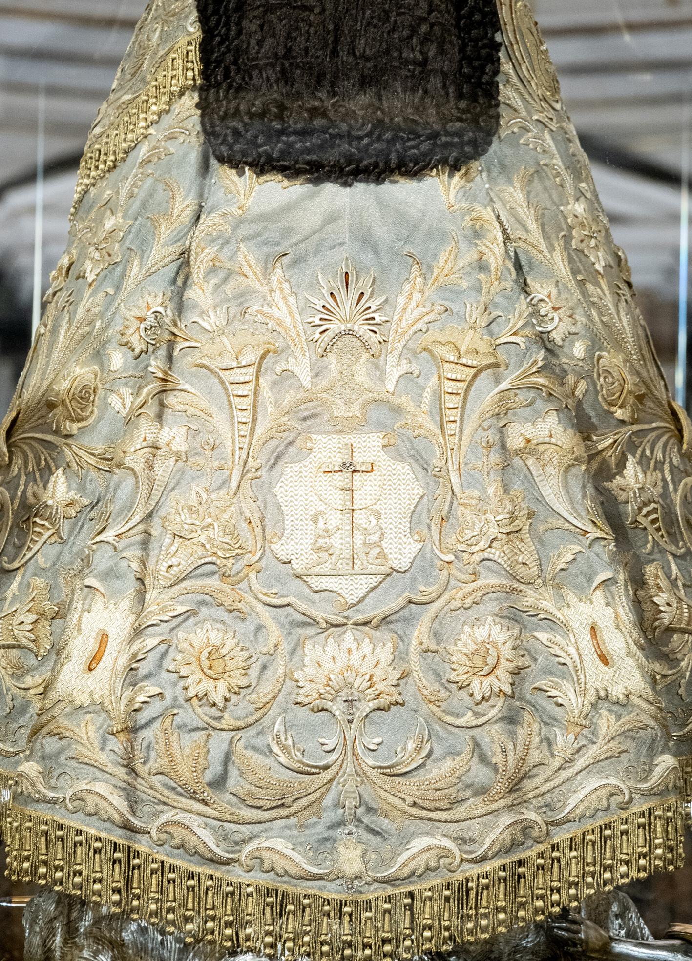 Además, es una “gran obra de artesanía tanto por el tejido con el que está hecho, tisú de plata fina sobre seda natural de color azul celeste, como por el rico bordado en oro fino realzado por varios centenares de perlas finas”.