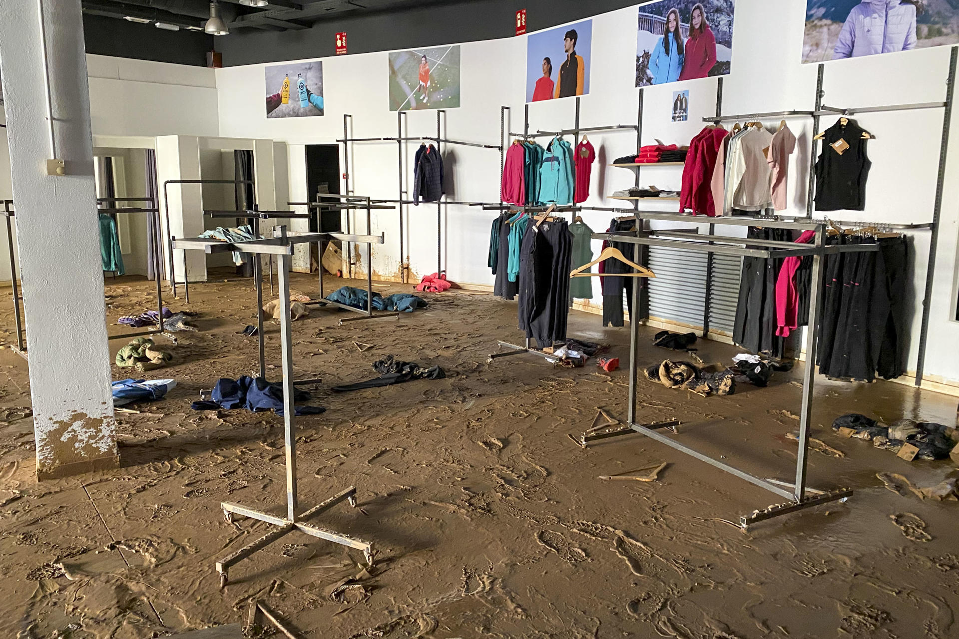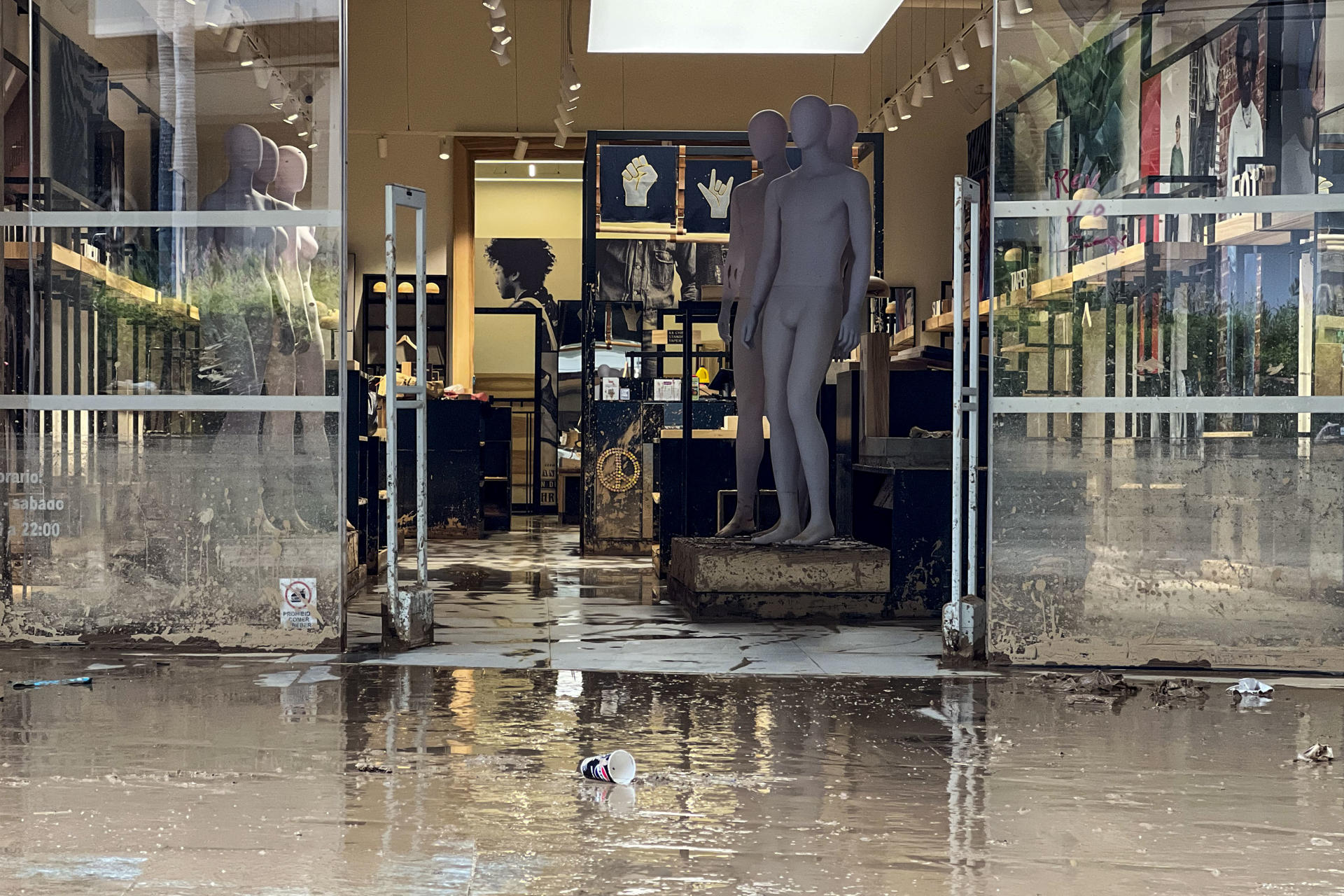 - El centro comercial de Bonaire, en Aldaia (Valencia), epicentro de algunas de las imágenes más impactantes de las inundaciones provocadas por la dana en la provincia, continúa este sábado repleto de lodo. Multitud de prendas y objetos pueden verse esparcidas por el suelo: cajas de comida de hamburgueserías, vasos de refrescos, cajas de zapatos, camisas, pantalones Todo tapado por barro, ramas y hojarasca. EFE/Macarena Soto