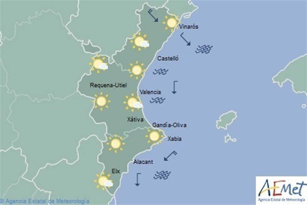 Así, habrá heladas generalizadas en el interior, en general débiles. Por su parte, el viento soplará variable flojo, con noroeste moderado en el norte de Castellón a primeras horas.