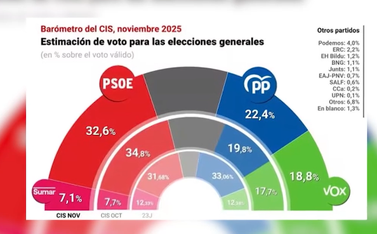 El Barómetro de Opinión del CIS de noviembre muestra un retroceso en la estimación de voto del PSOE, que cae hasta el 32,6%, el primer descenso tras el anuncio de ruptura de Junts. Esta bajada recorta la distancia con el Partido Popular, situando la ventaja socialista en 10,2 puntos.