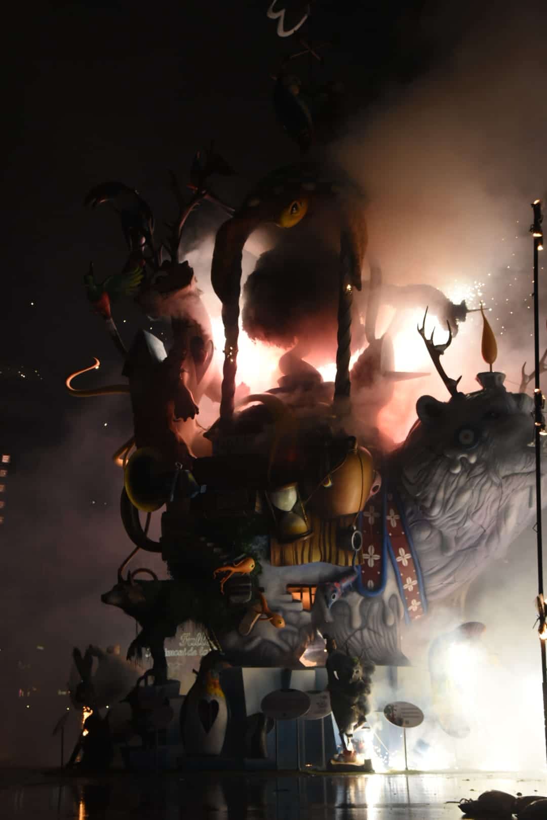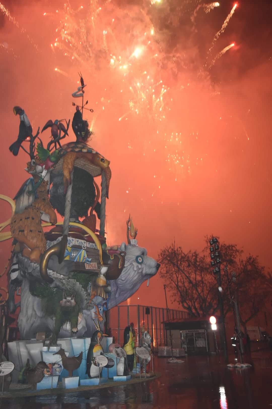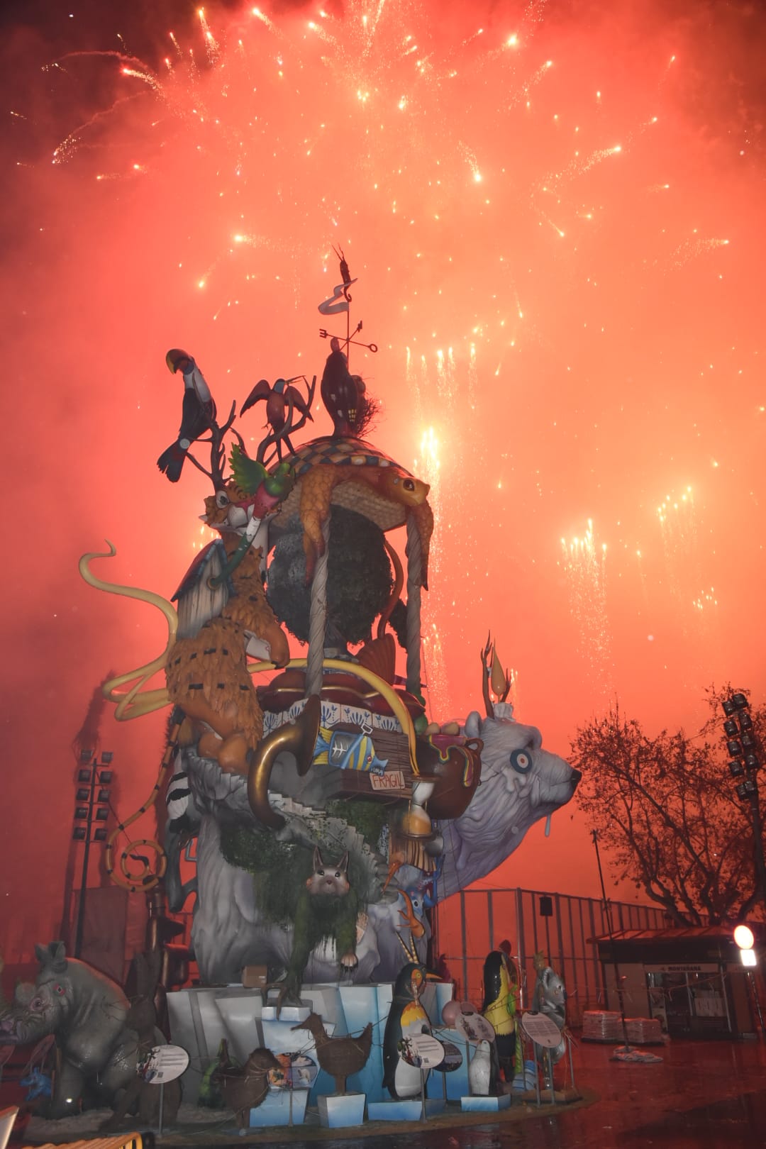 El monumento era un canto a la Naturaleza repleto de animales en peligro de extinción y construida con materiales sostenibles para alertar del riesgo de que desaparezcan muchas especies de flora y fauna, como el enorme oso polar con mirada triste e incierta que se ha convertido en uno de los emblemas de estas Fallas.