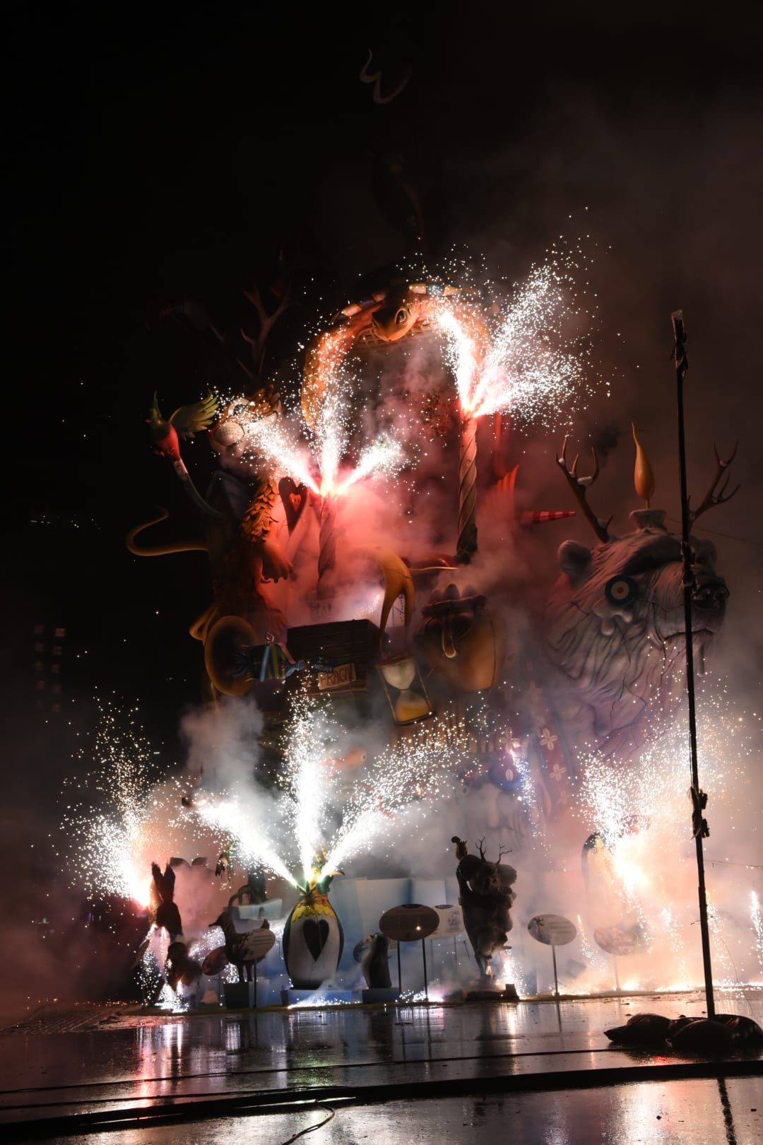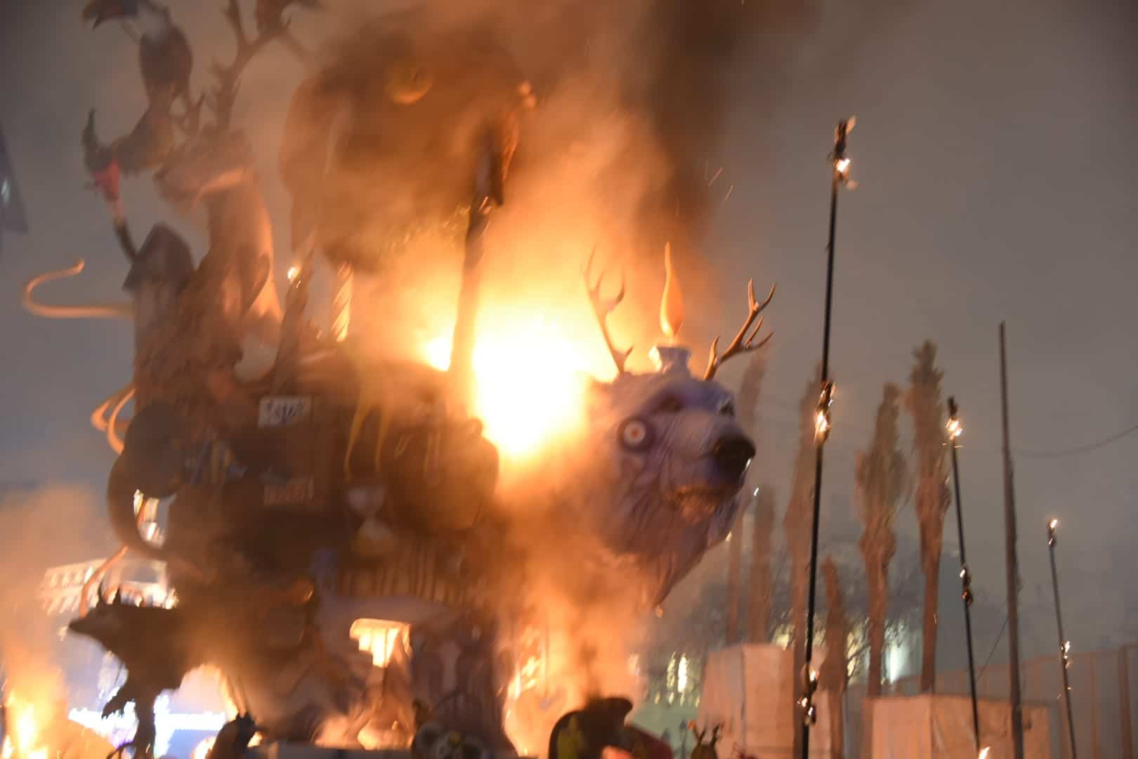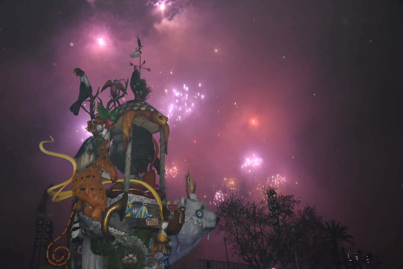 El monumento era un canto a la Naturaleza repleto de animales en peligro de extinción y construida con materiales sostenibles para alertar del riesgo de que desaparezcan muchas especies de flora y fauna, como el enorme oso polar con mirada triste e incierta que se ha convertido en uno de los emblemas de estas Fallas.