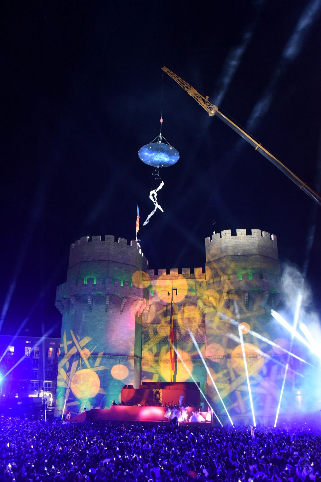 El evento ha contado con la participación de los artistas Lorena Calero y Gonzalo Manglano, quienes han interpretado el emblemático pasodoble «El Fallero», acompañados por una treintena de niños de la Escolanía de la Virgen de los Desamparados. Por primera vez, las Torres de Serranos han cobrado voz, gracias a la interpretación de la actriz de doblaje Pilar Martínez.