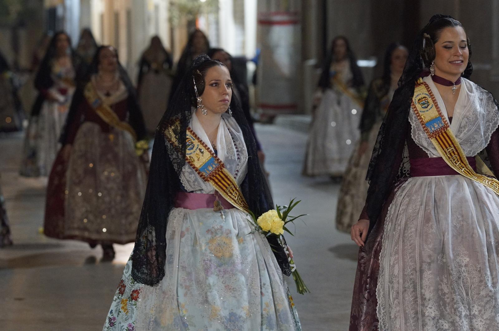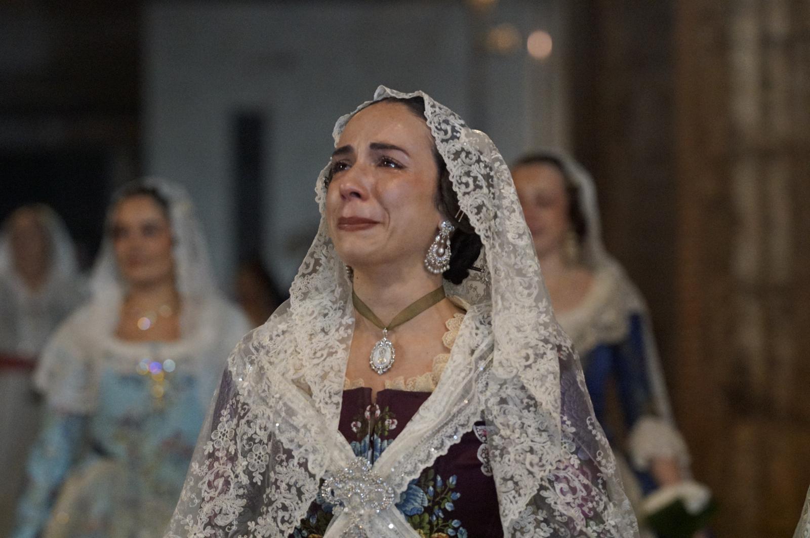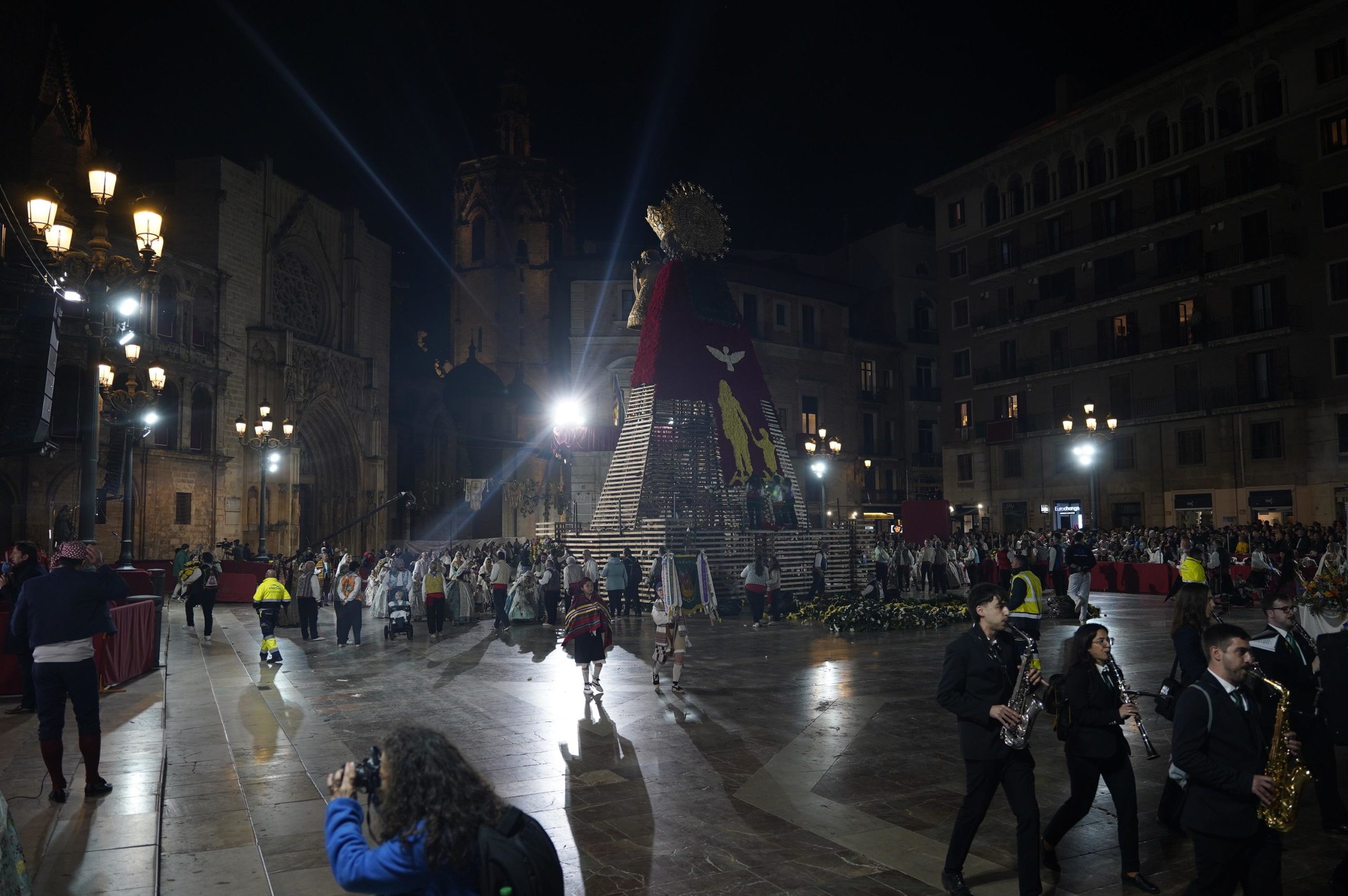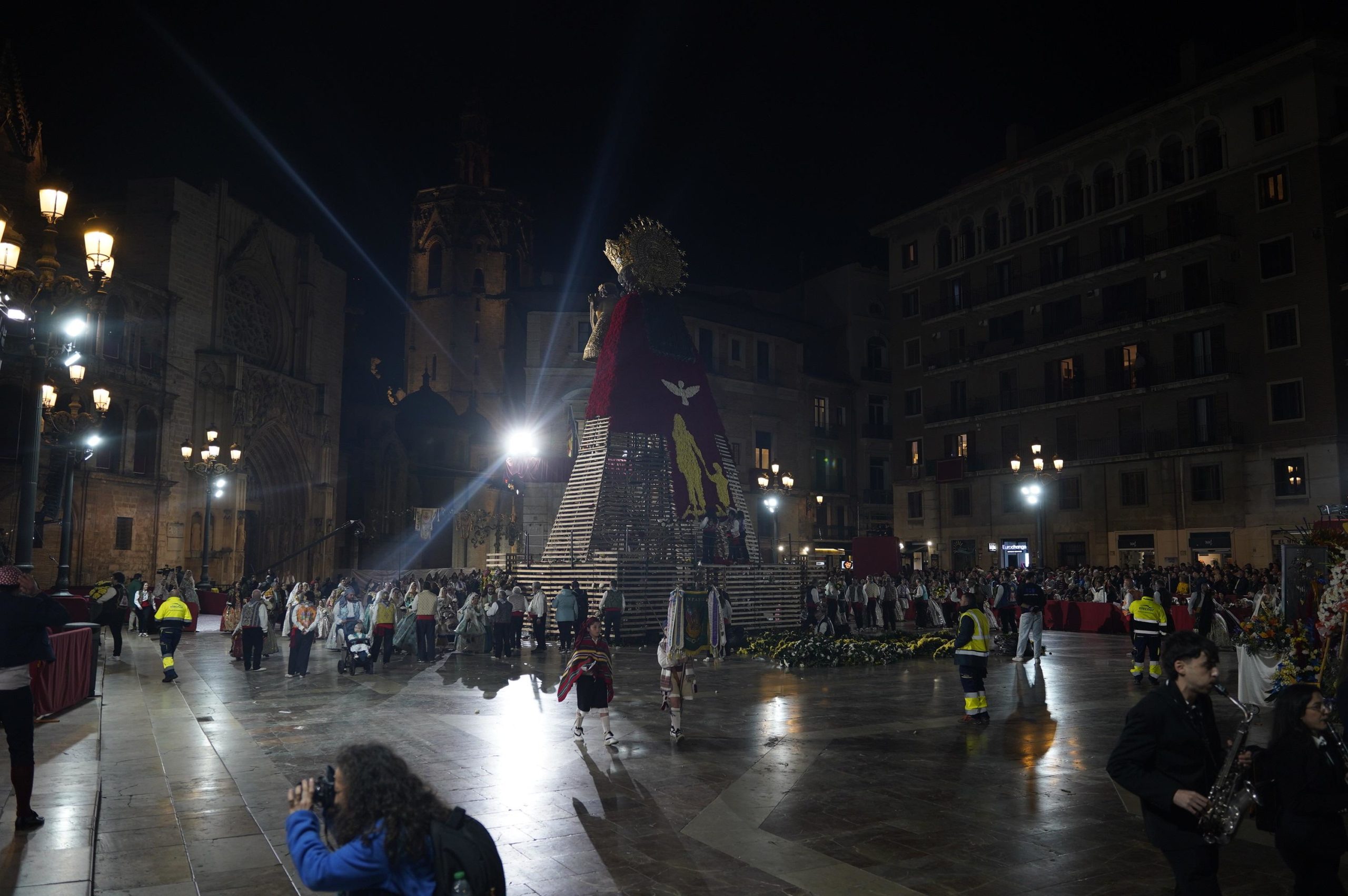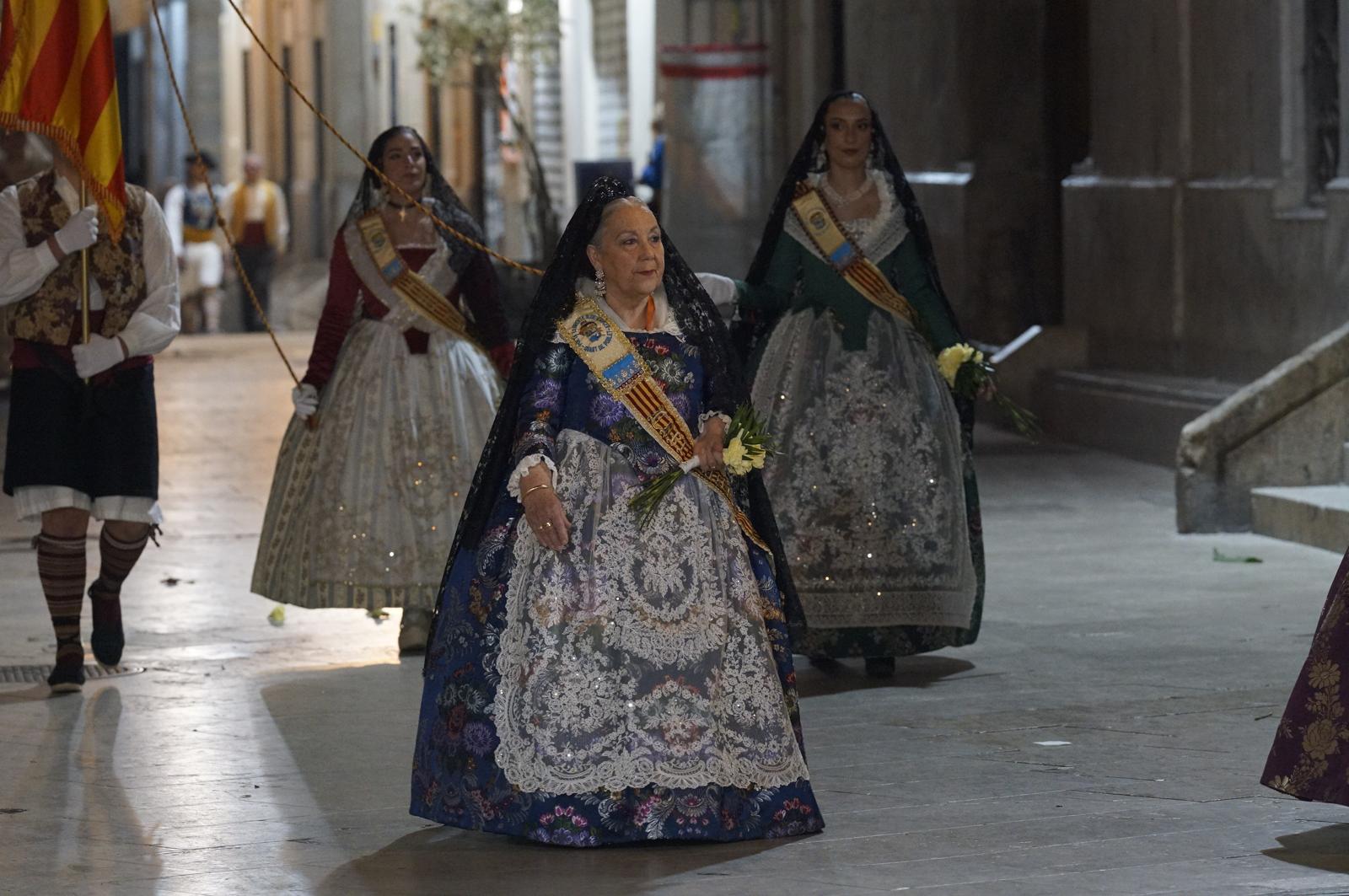 Durante toda la tarde y hasta bien entrada la madrugada, las comisiones falleras han desfilado ante la imagen de la Virgen de los Desamparados, conocida como la Geperudeta.