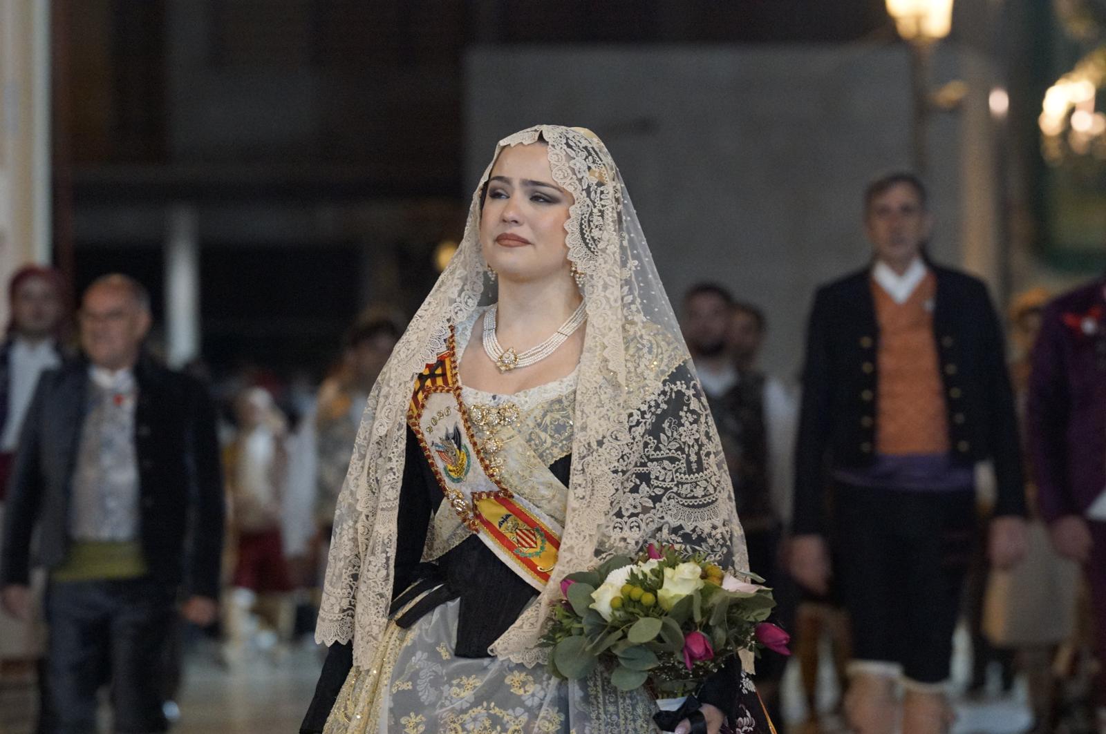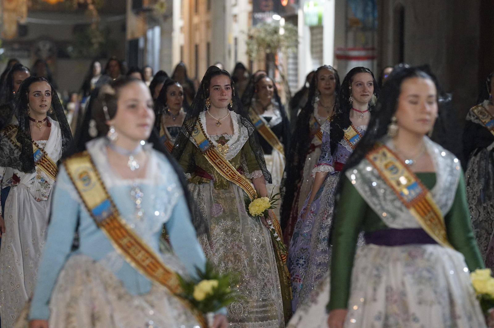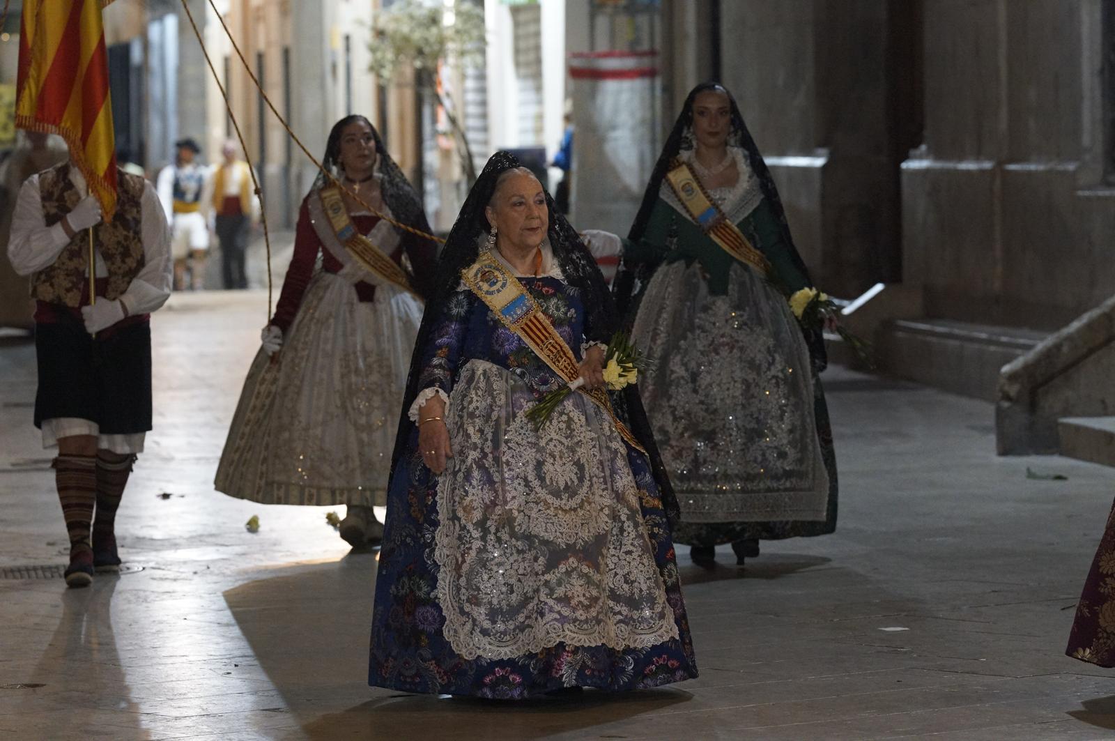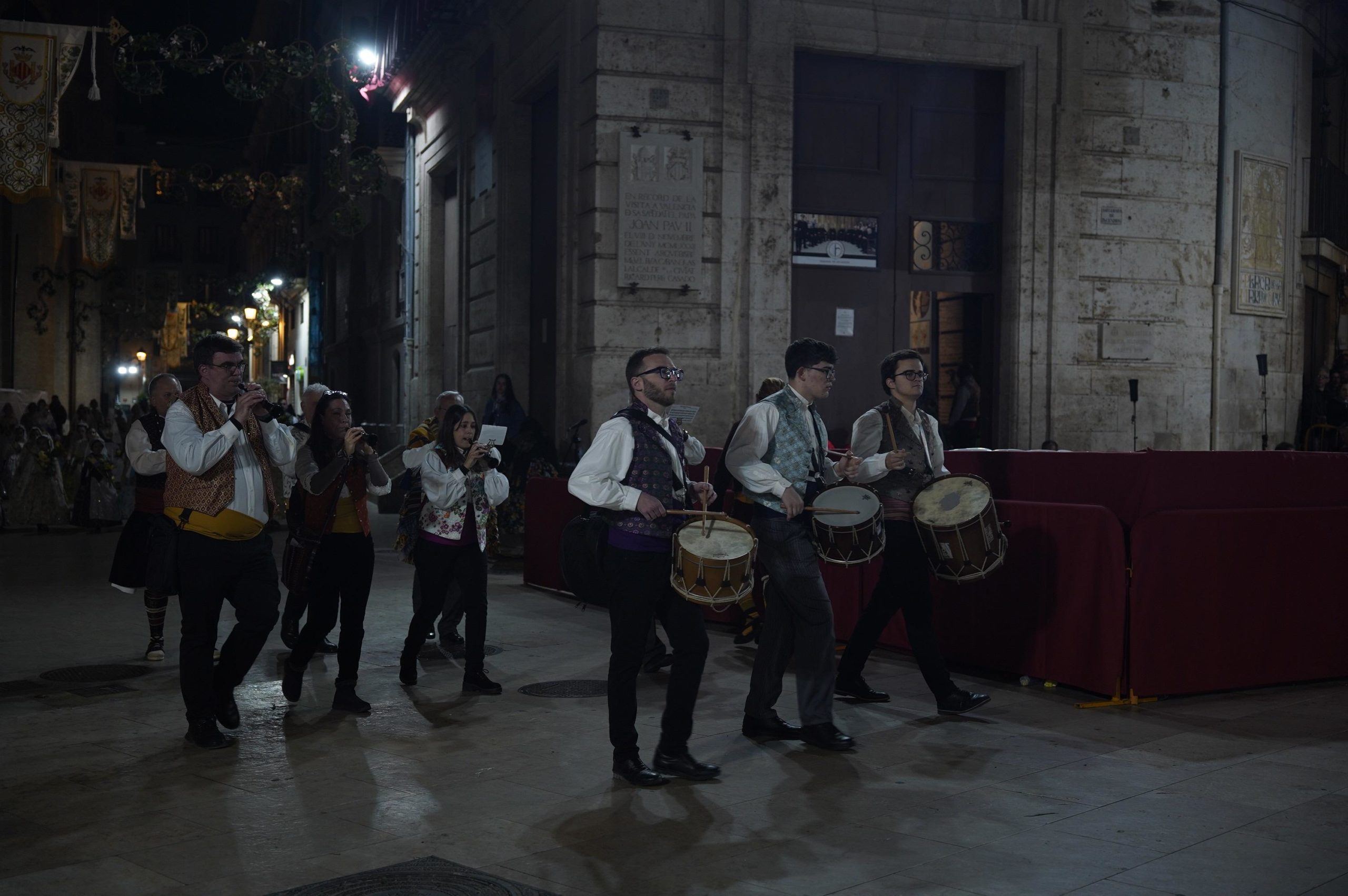 Durante toda la tarde y hasta bien entrada la madrugada, las comisiones falleras han desfilado ante la imagen de la Virgen de los Desamparados, conocida como la Geperudeta.