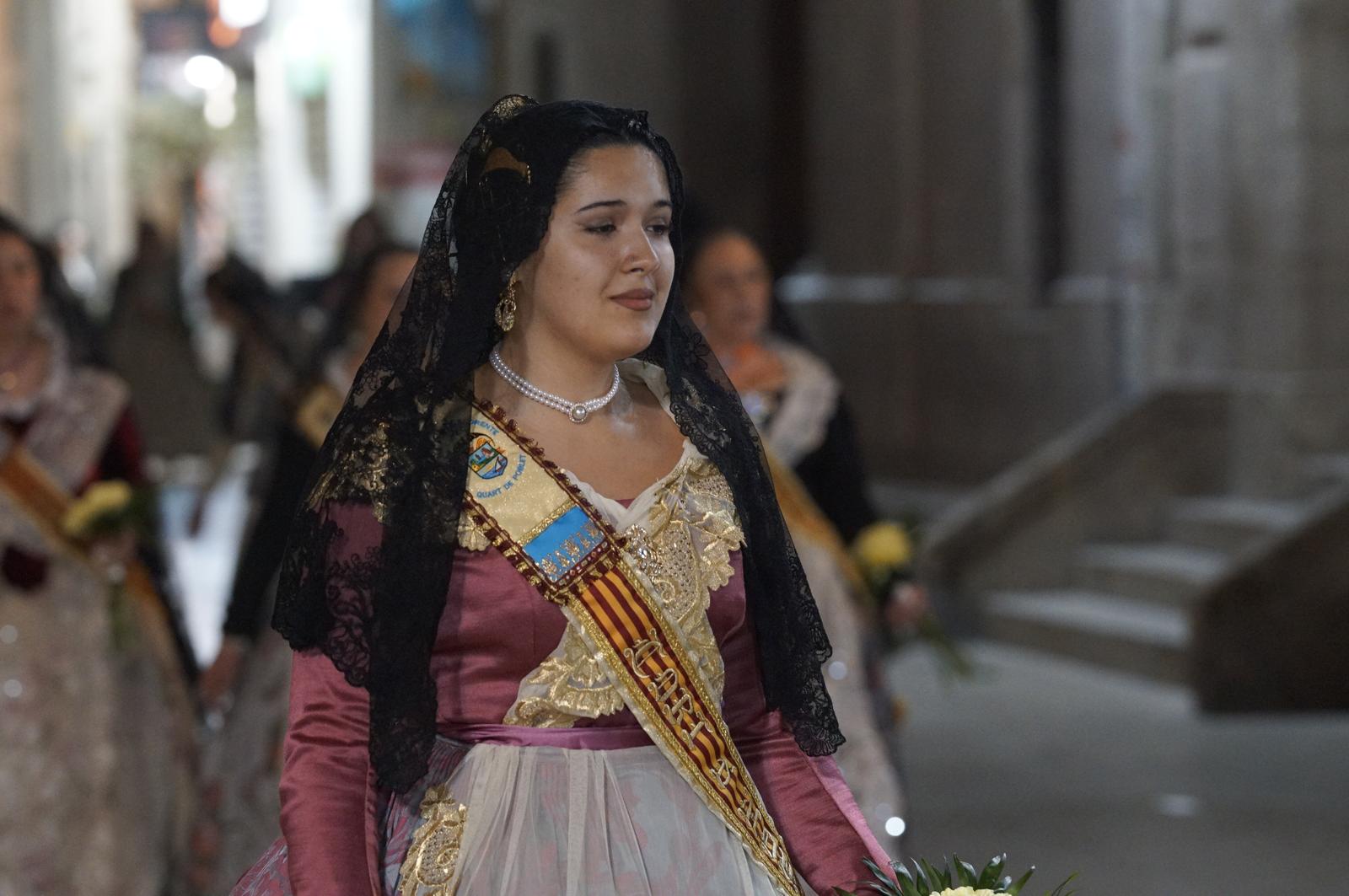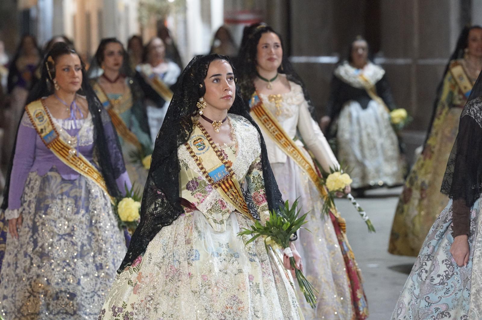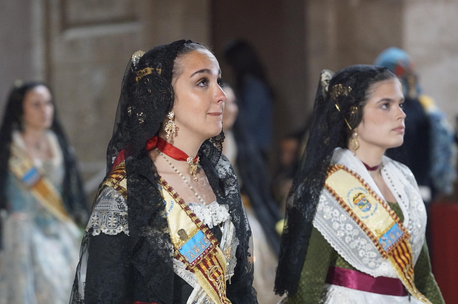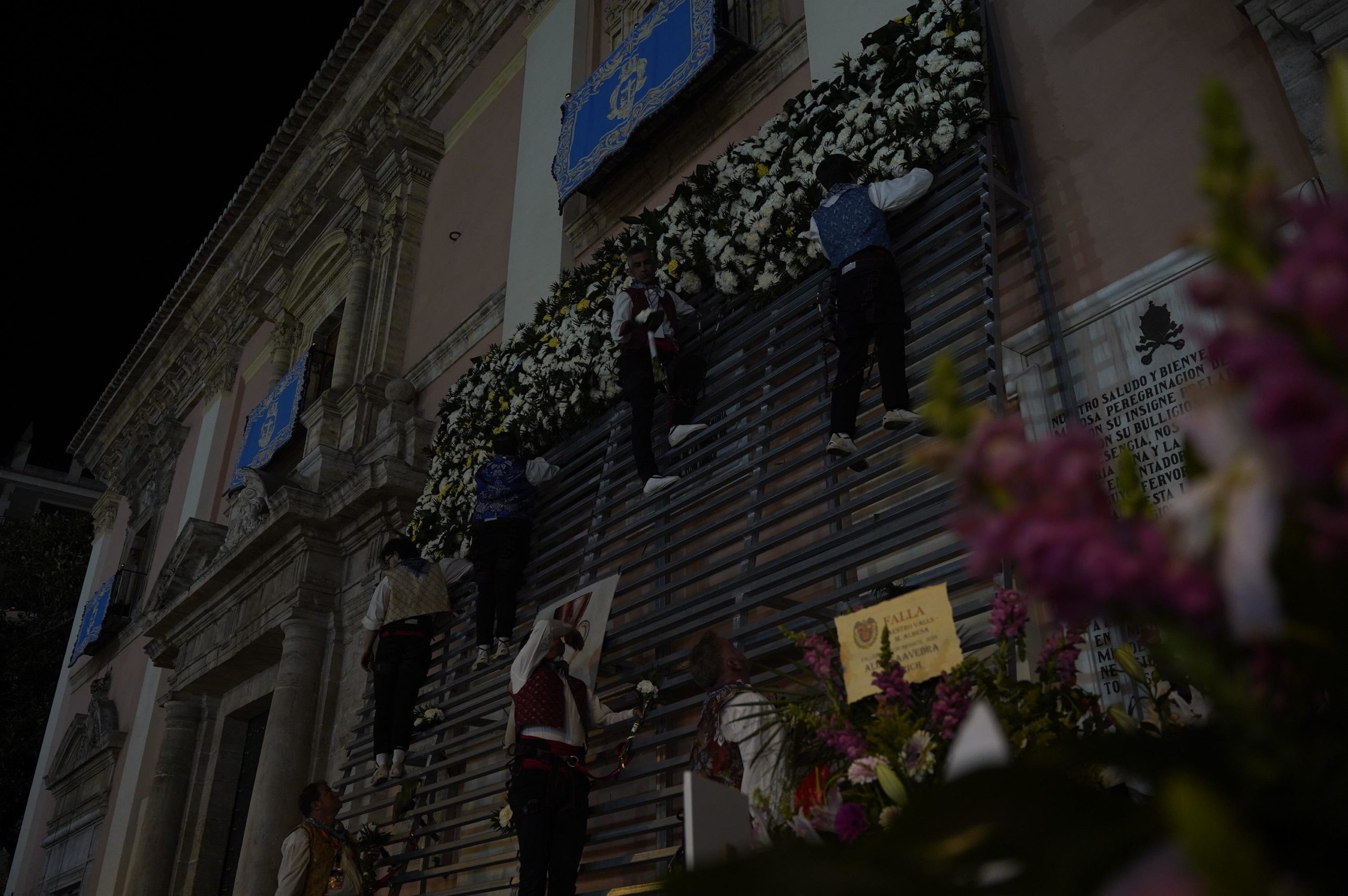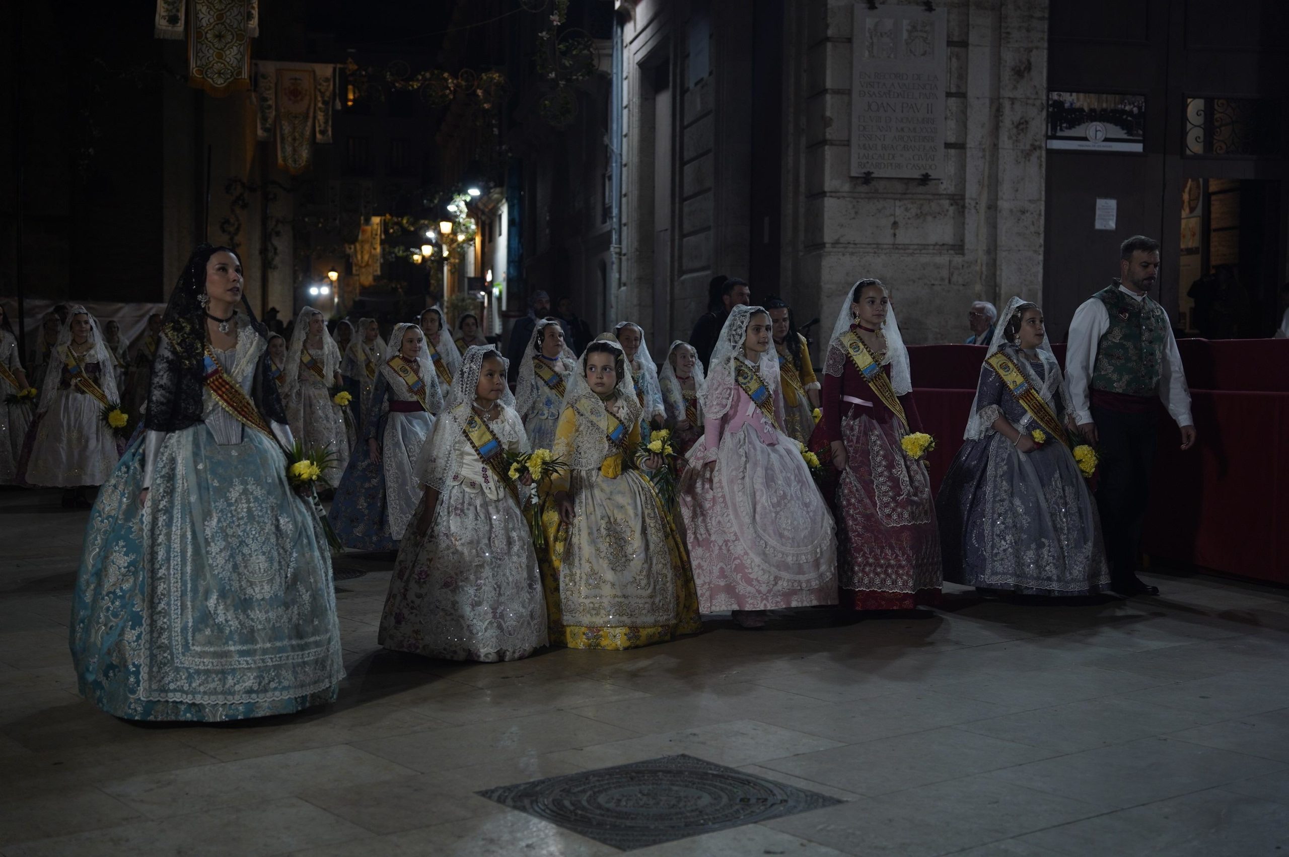 Durante toda la tarde y hasta bien entrada la madrugada, las comisiones falleras han desfilado ante la imagen de la Virgen de los Desamparados, conocida como la Geperudeta.