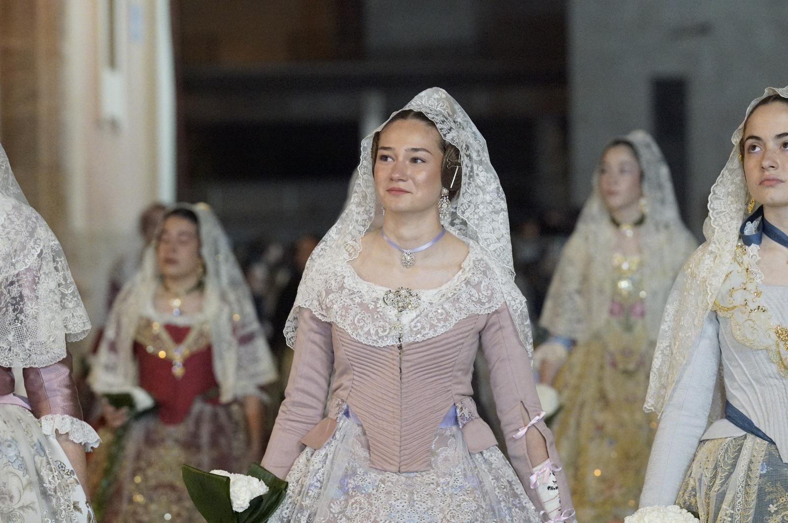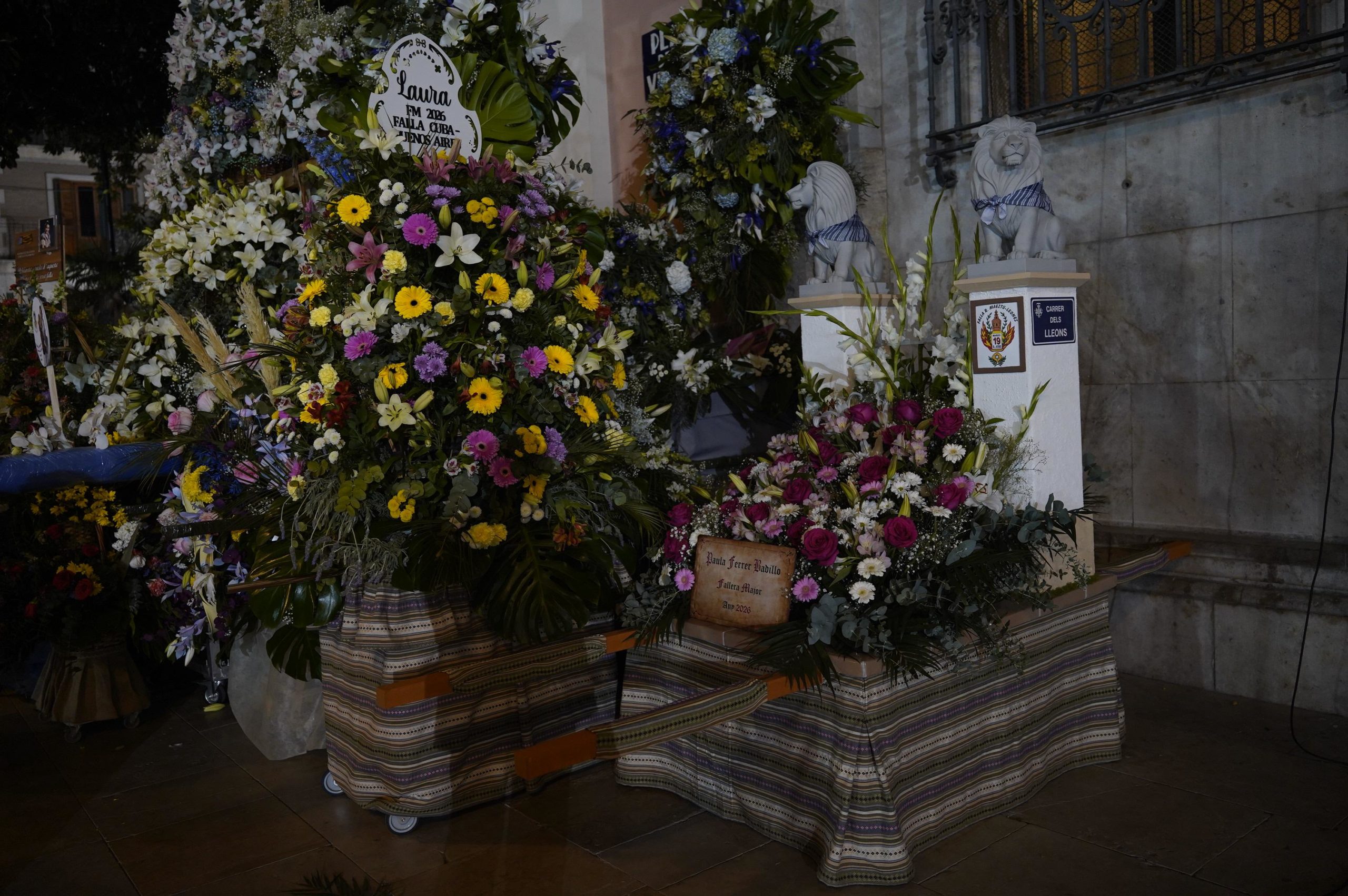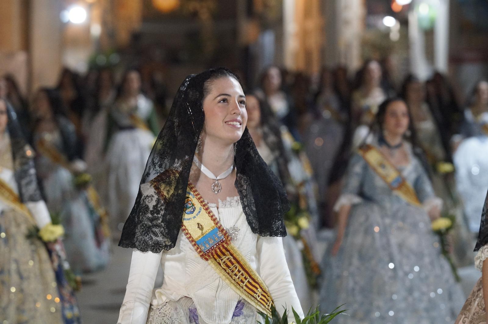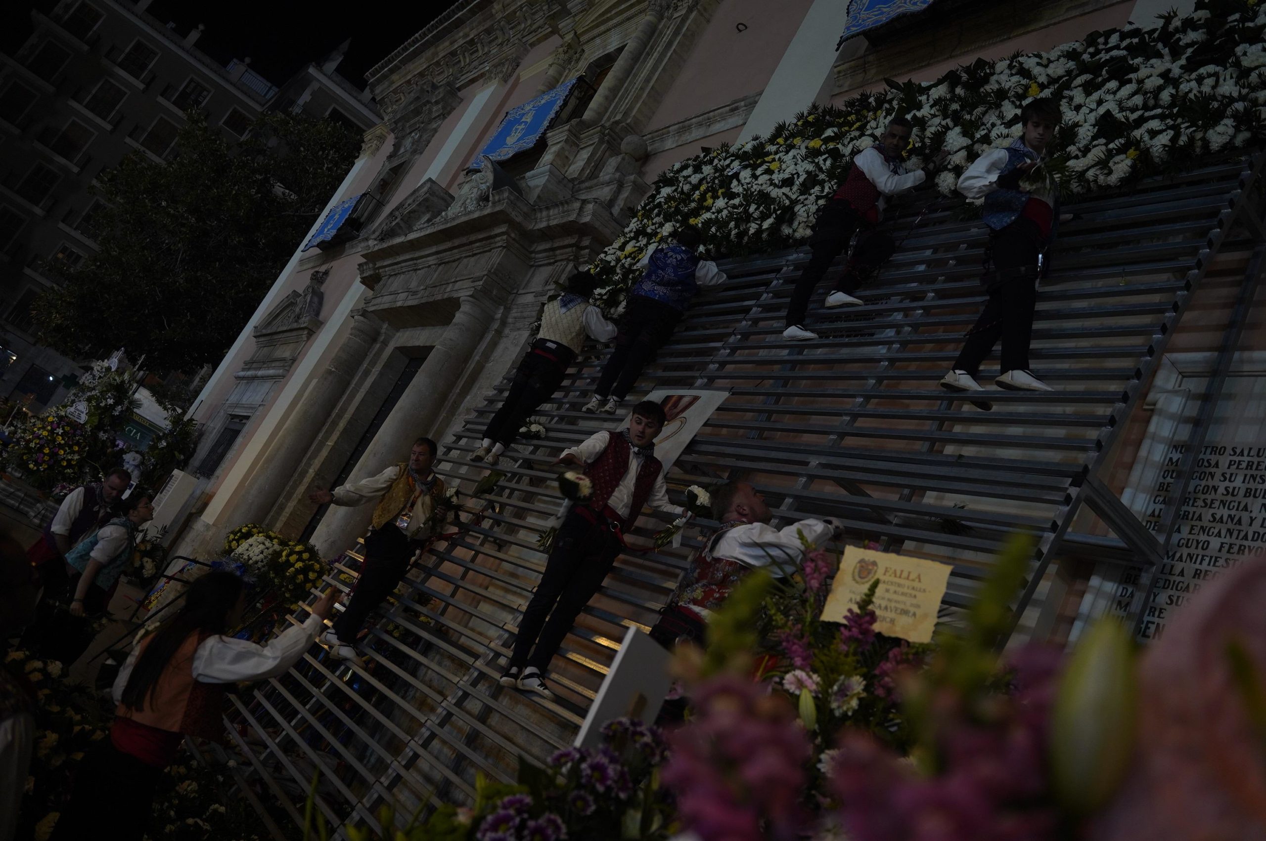 Durante toda la tarde y hasta bien entrada la madrugada, las comisiones falleras han desfilado ante la imagen de la Virgen de los Desamparados, conocida como la Geperudeta.