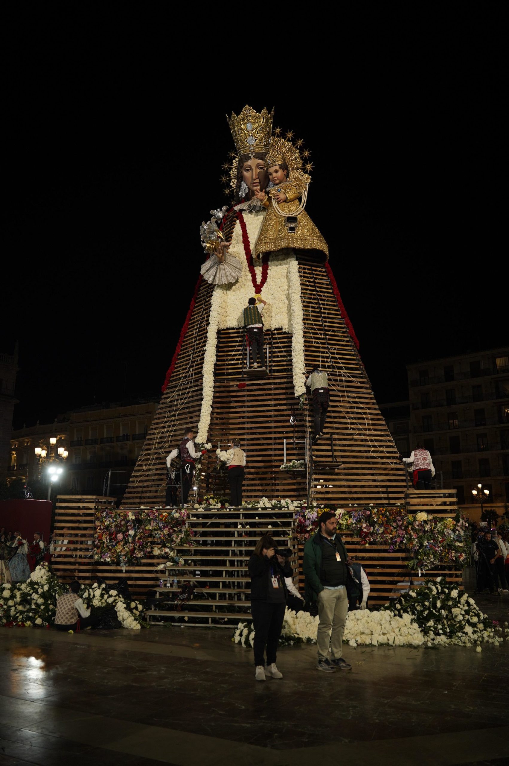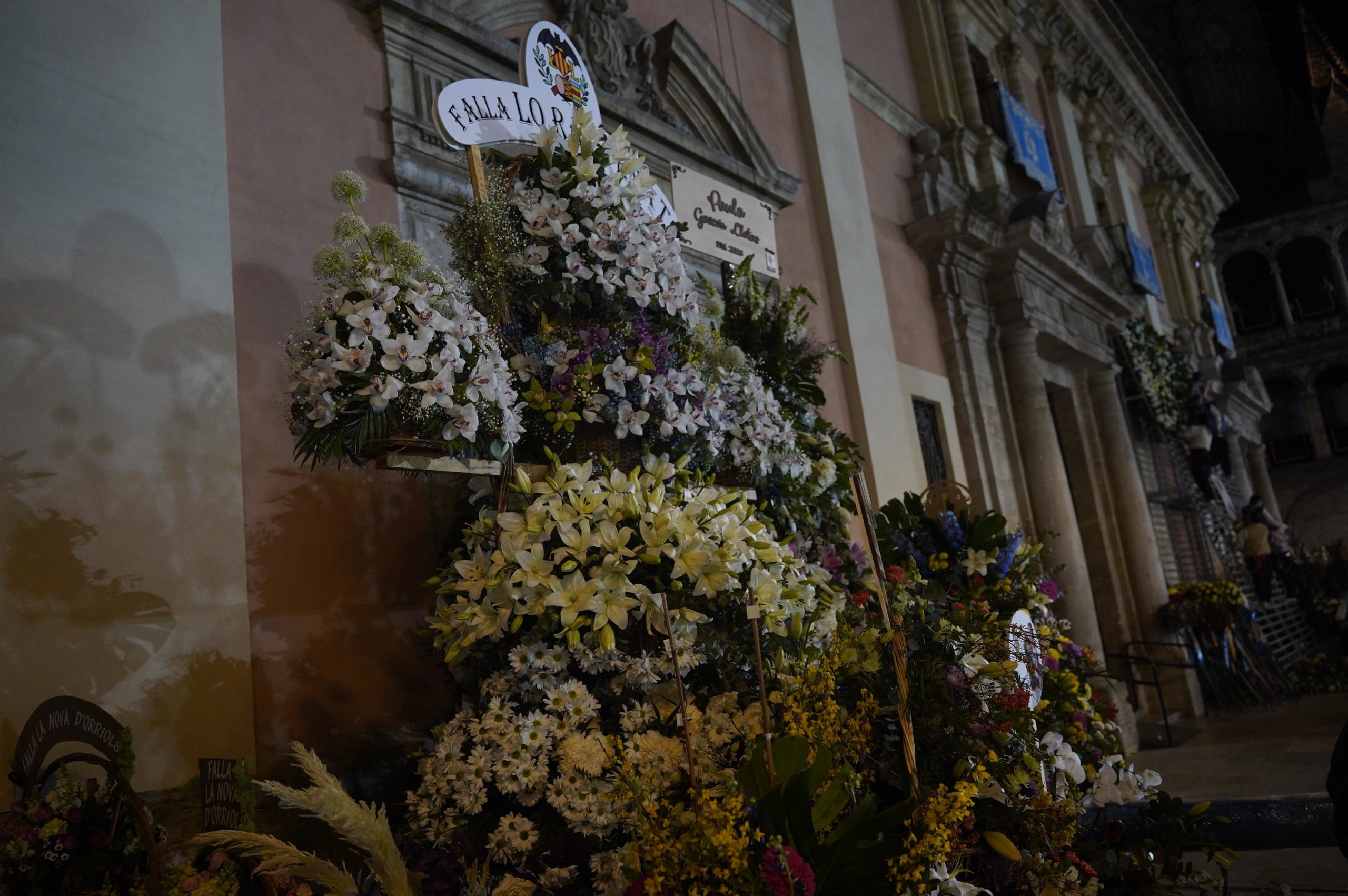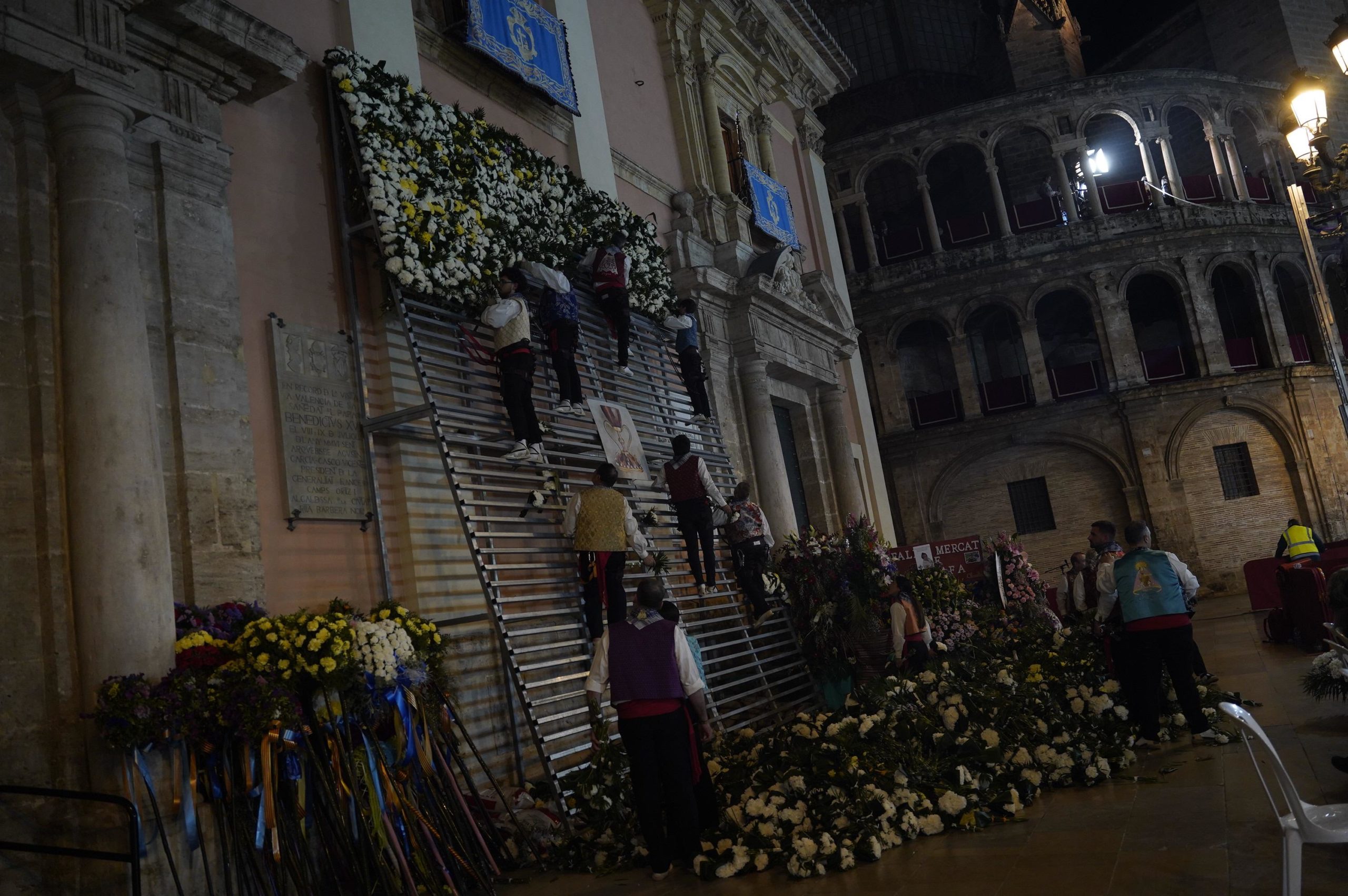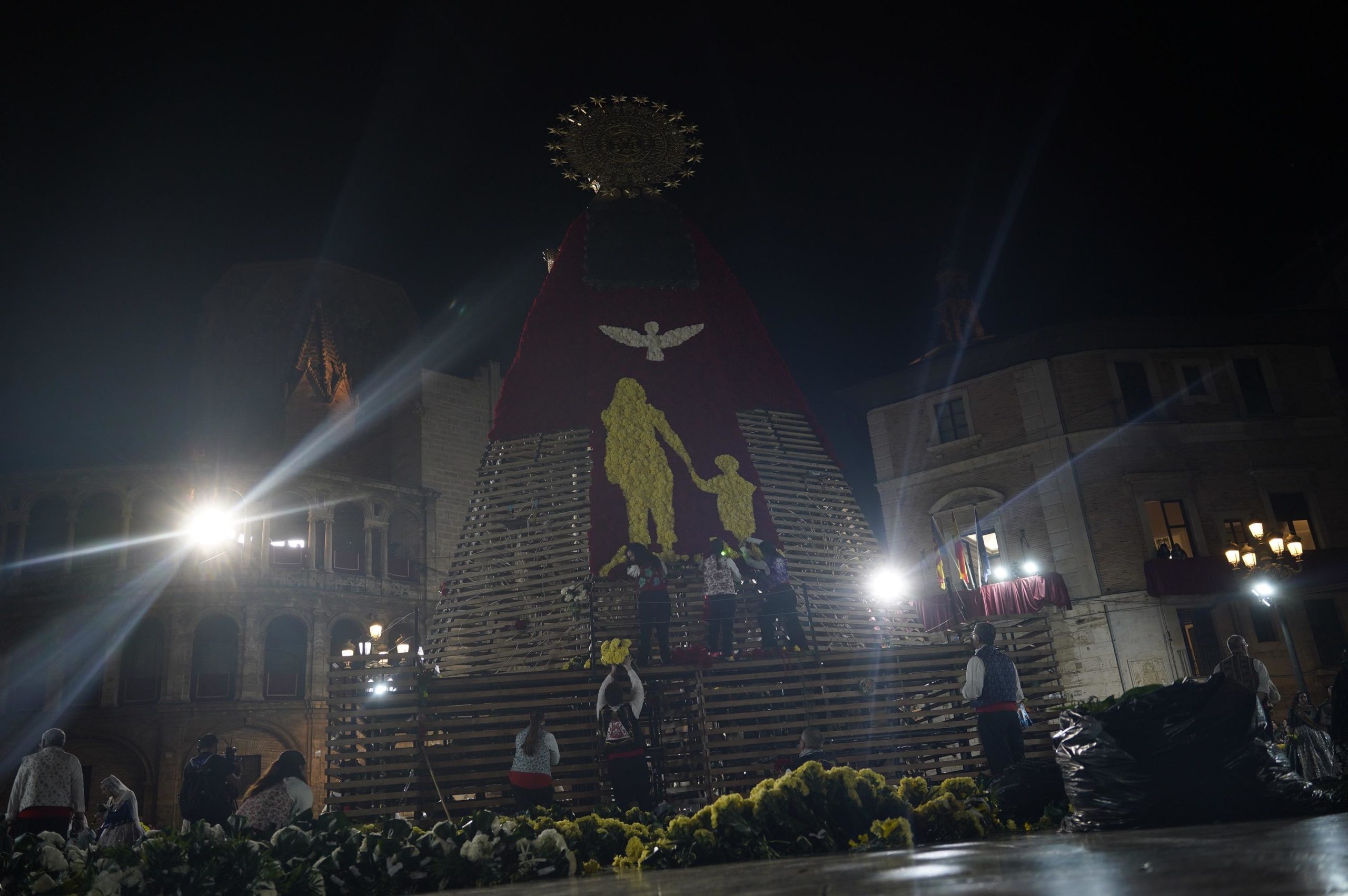 Los ramos de flores depositados han comenzado ya a dar forma al manto de la patrona, una de las imágenes más icónicas de las Fallas.