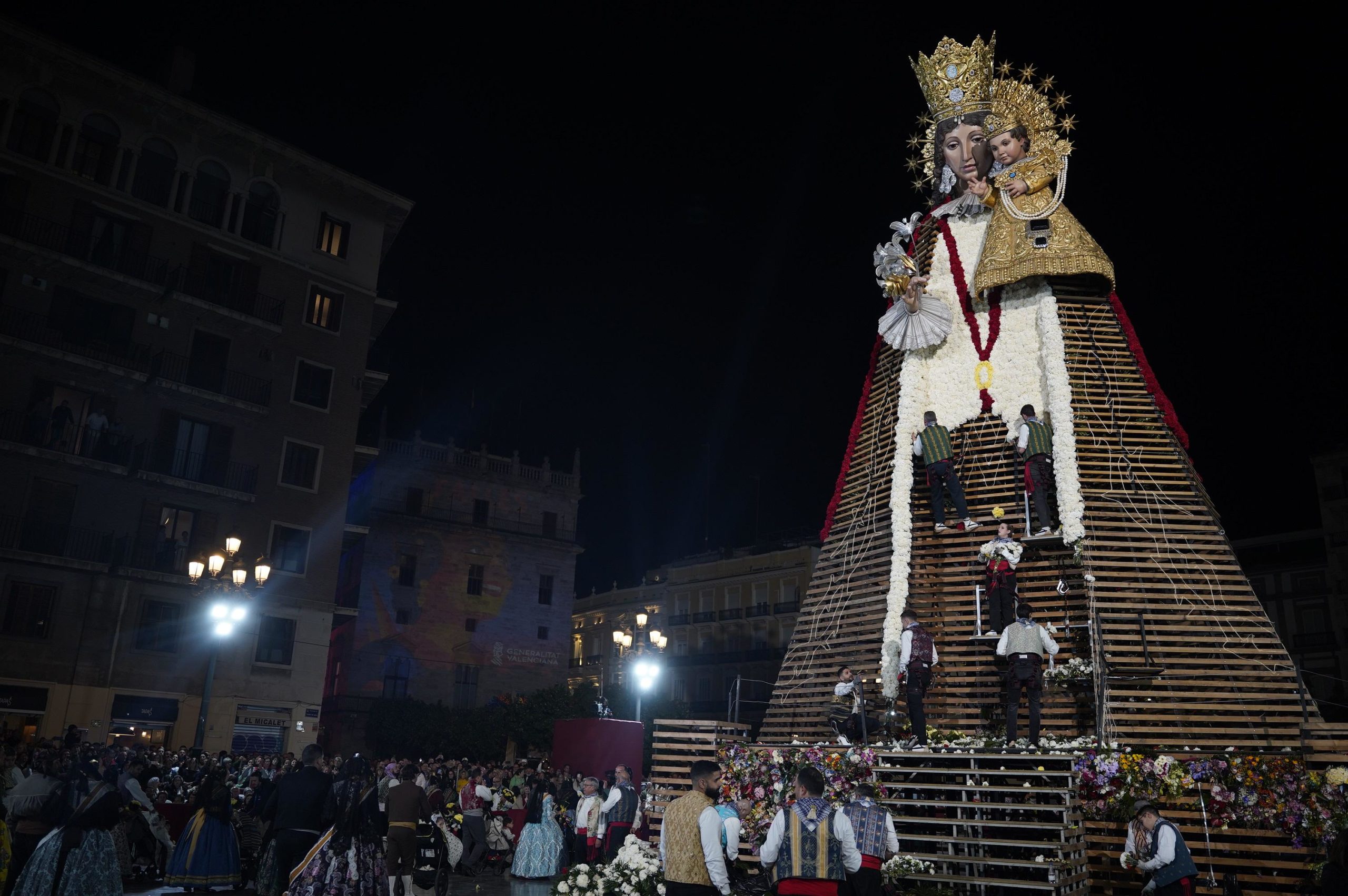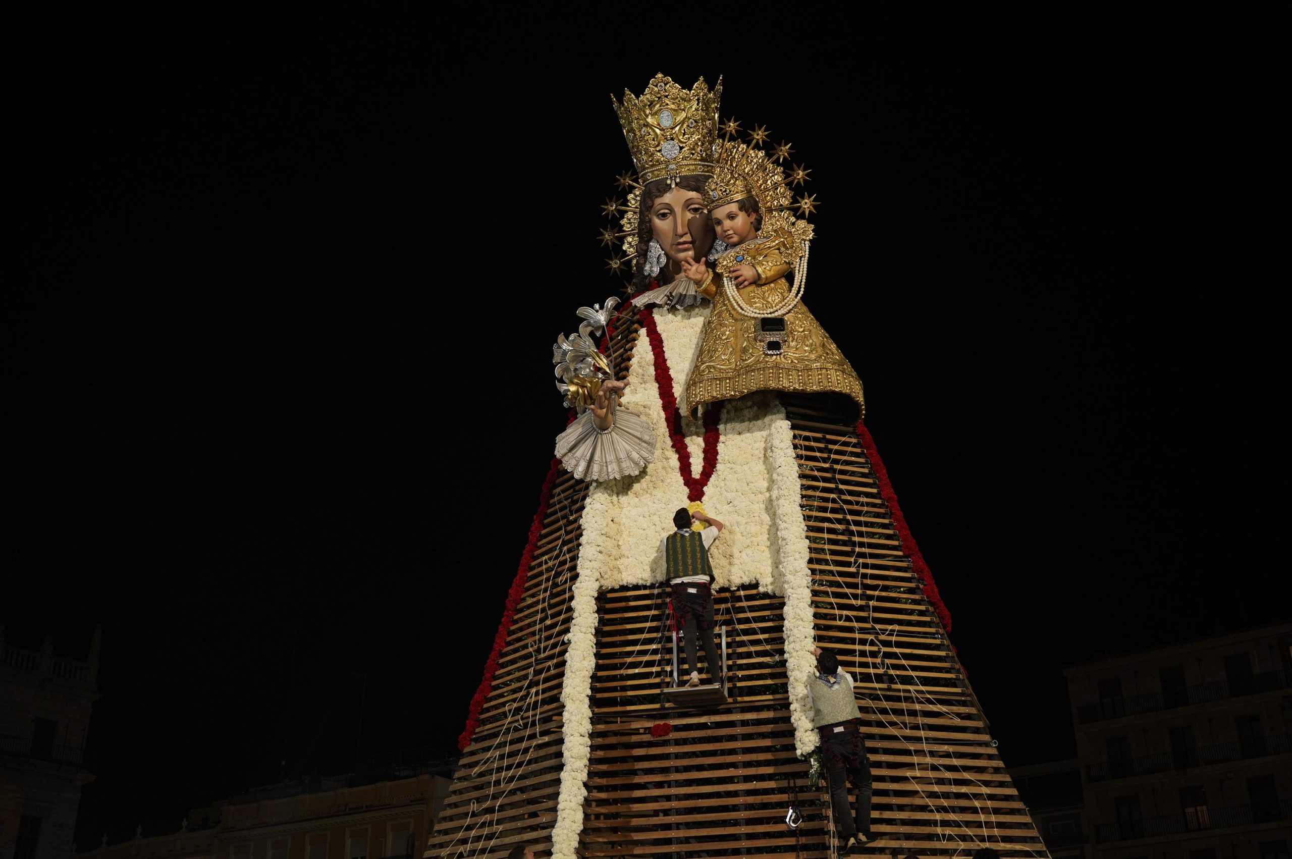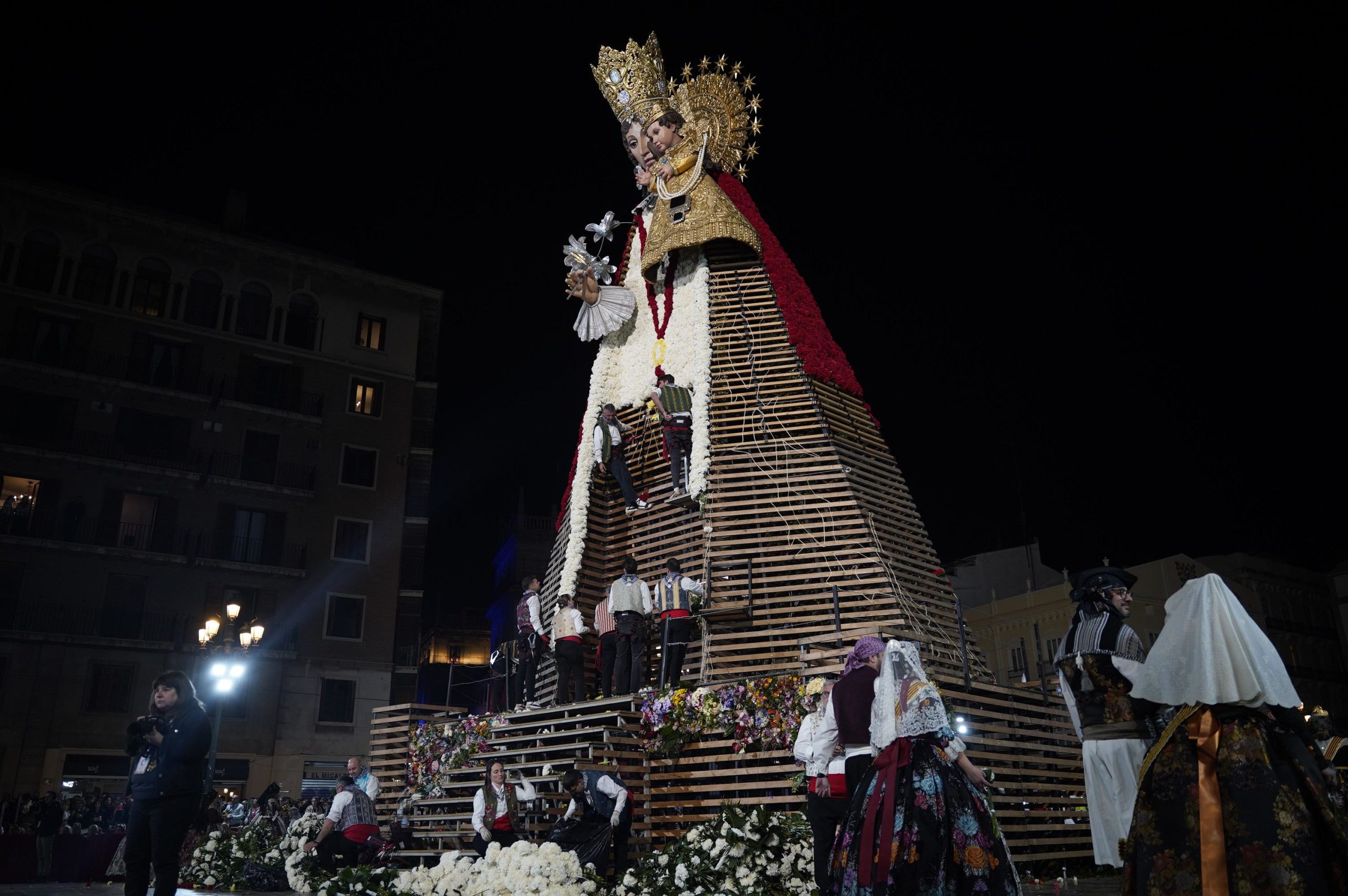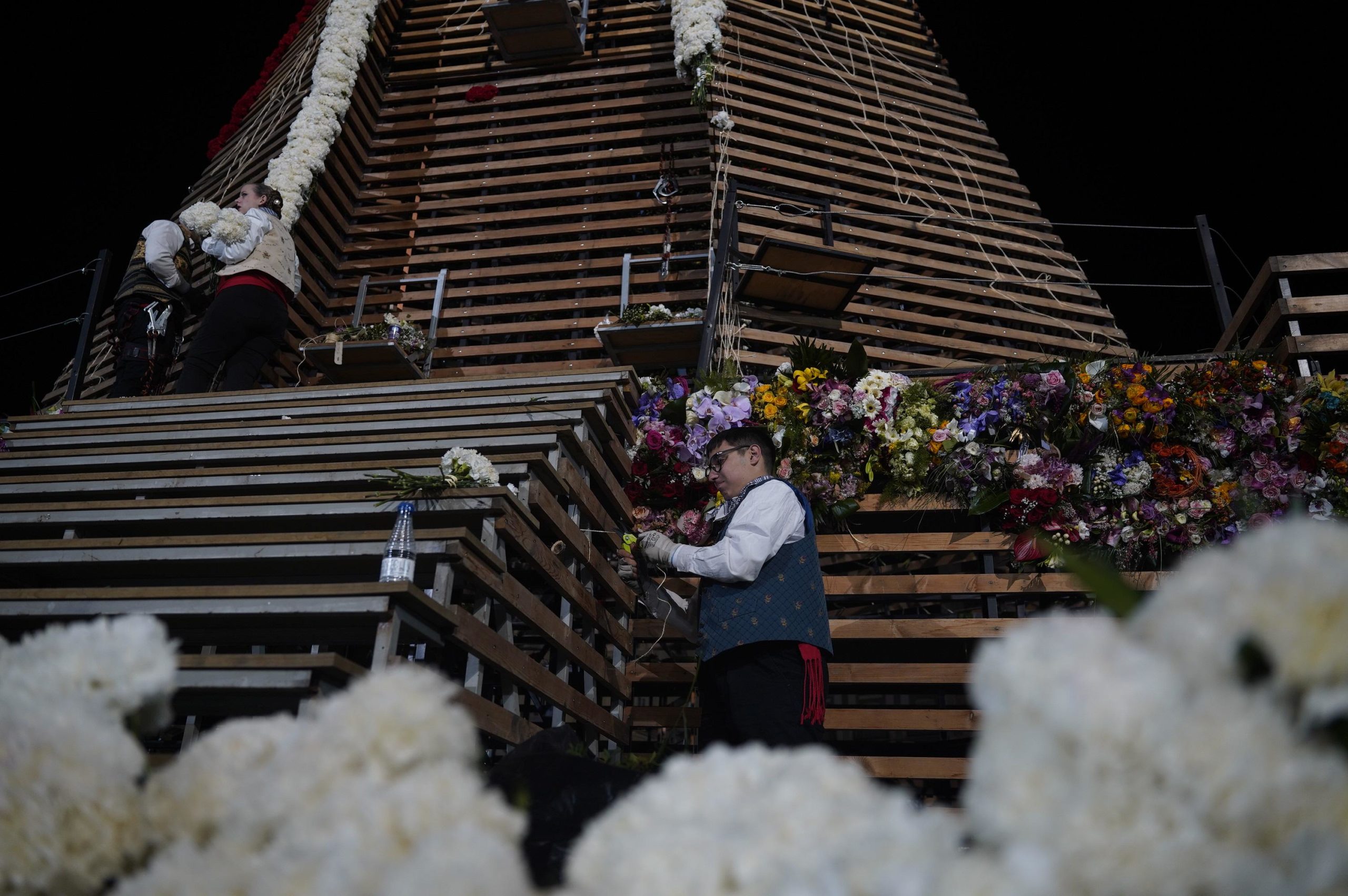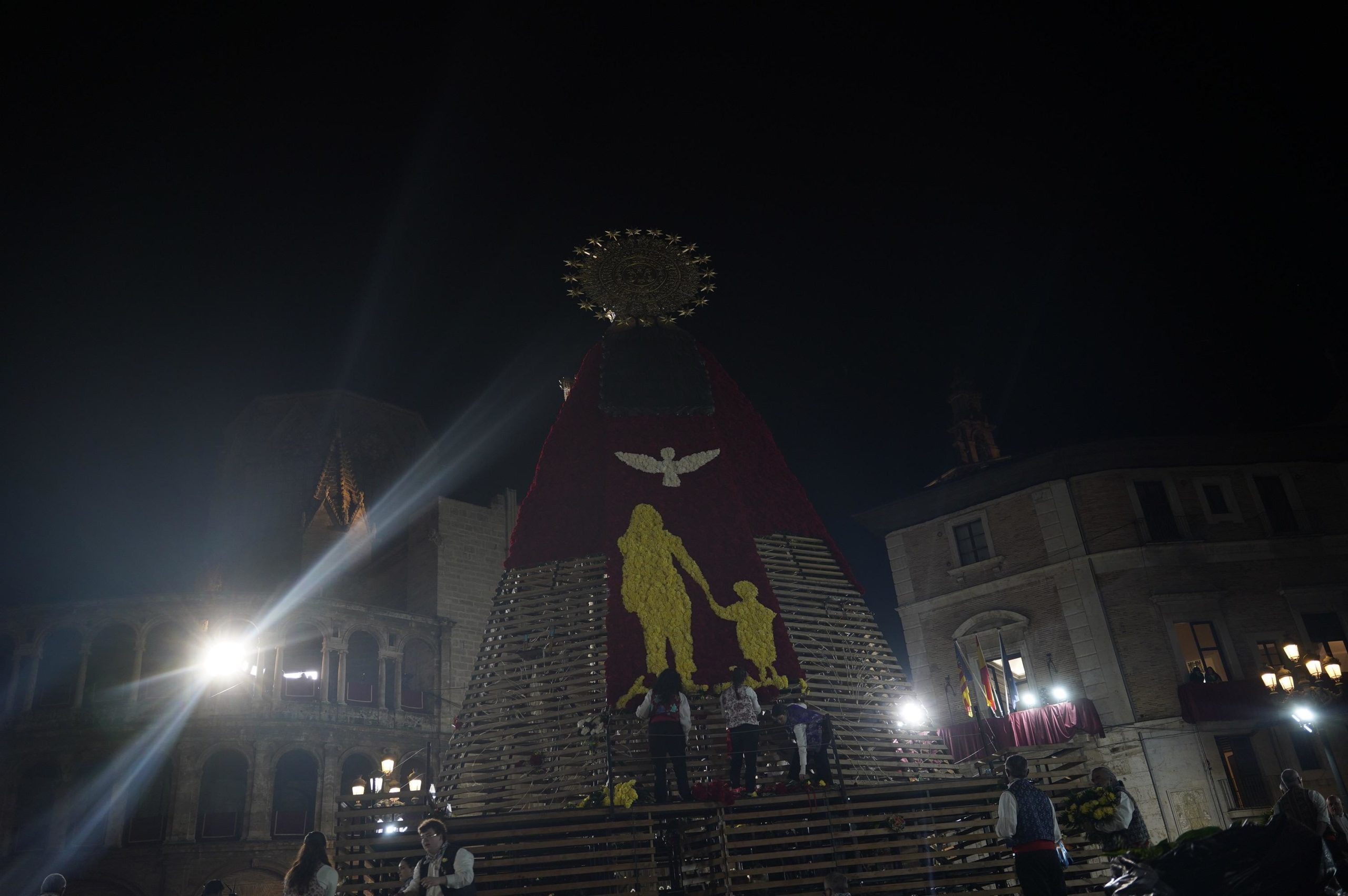 Los ramos de flores depositados han comenzado ya a dar forma al manto de la patrona, una de las imágenes más icónicas de las Fallas.