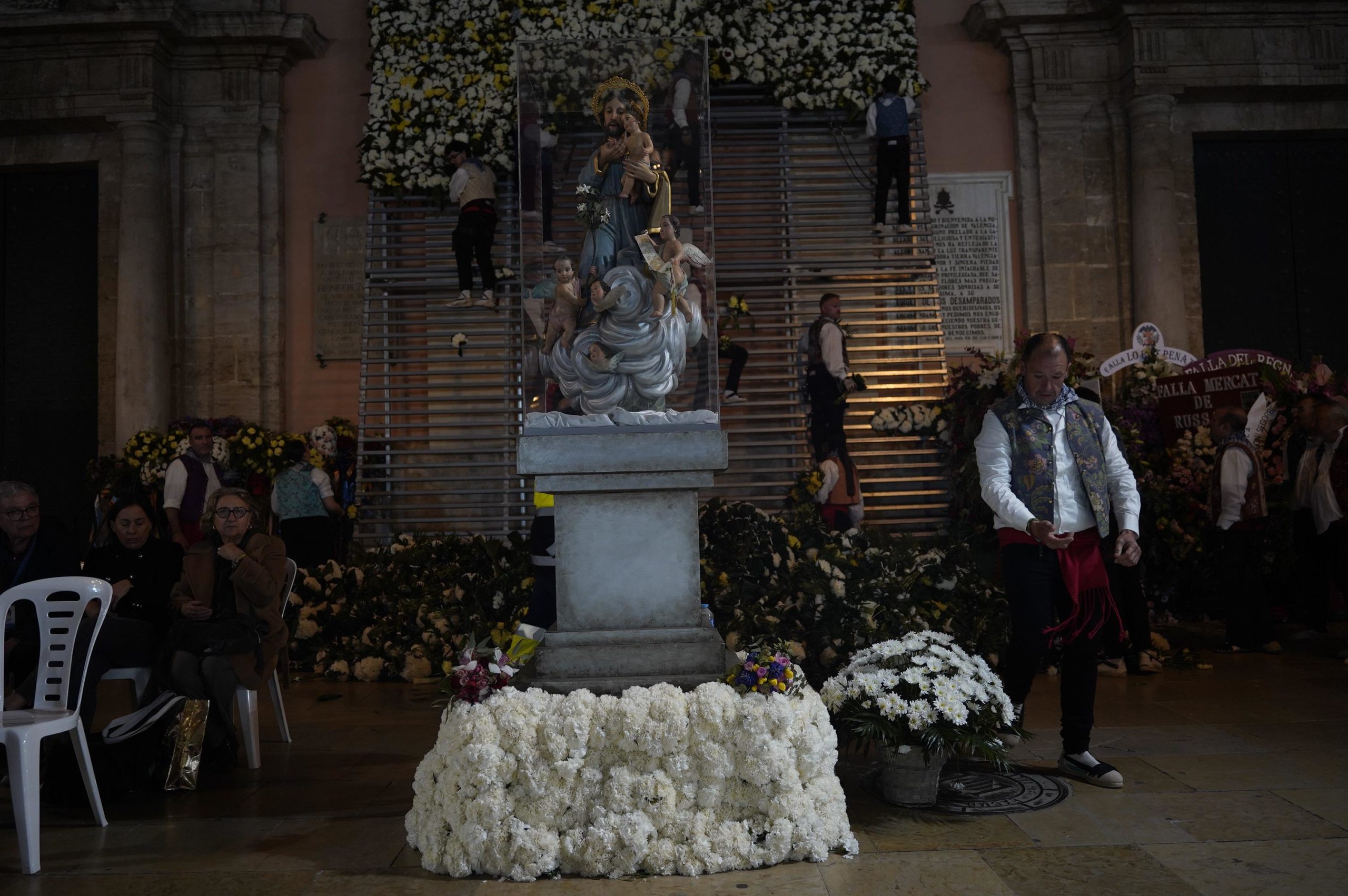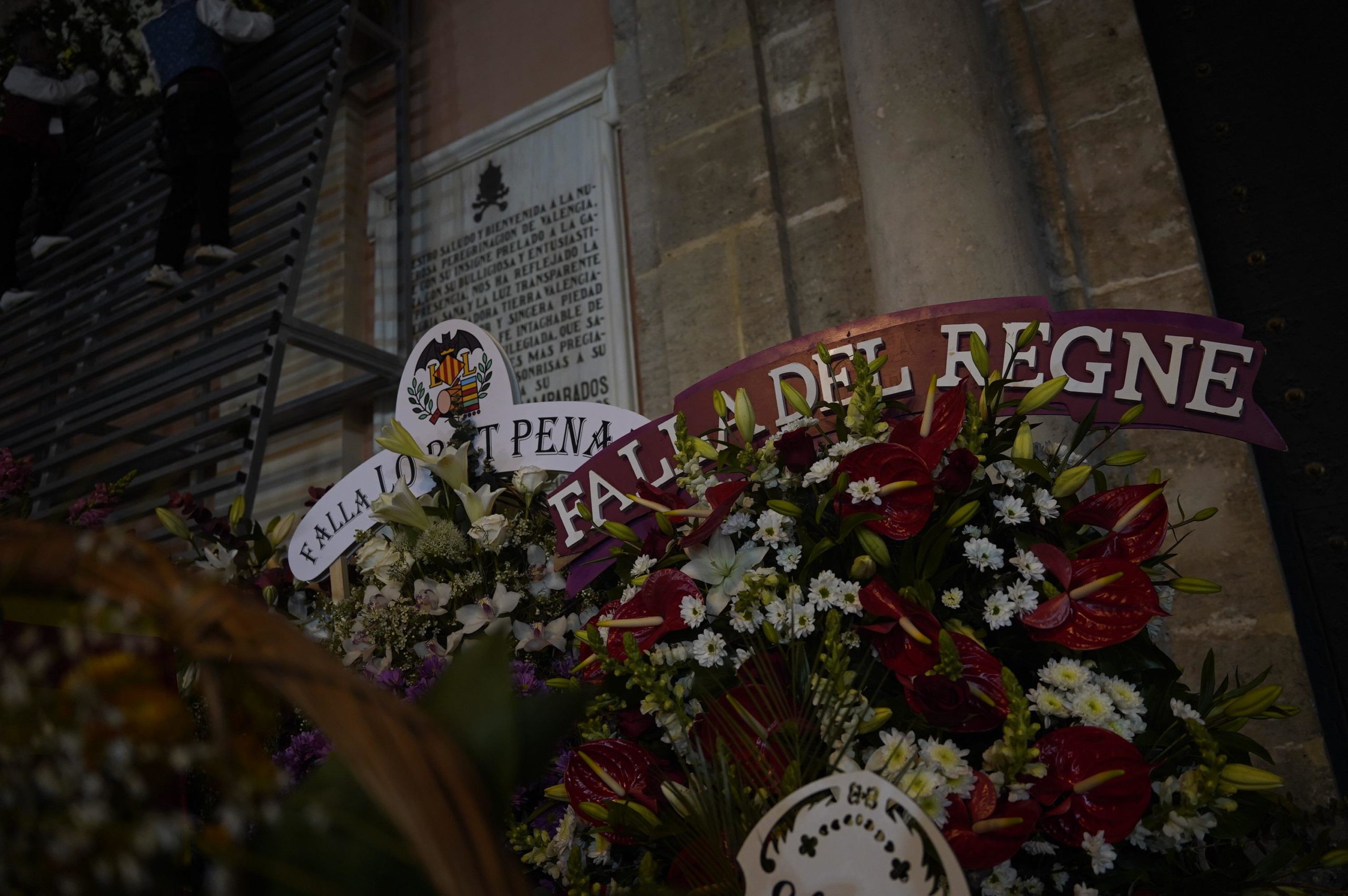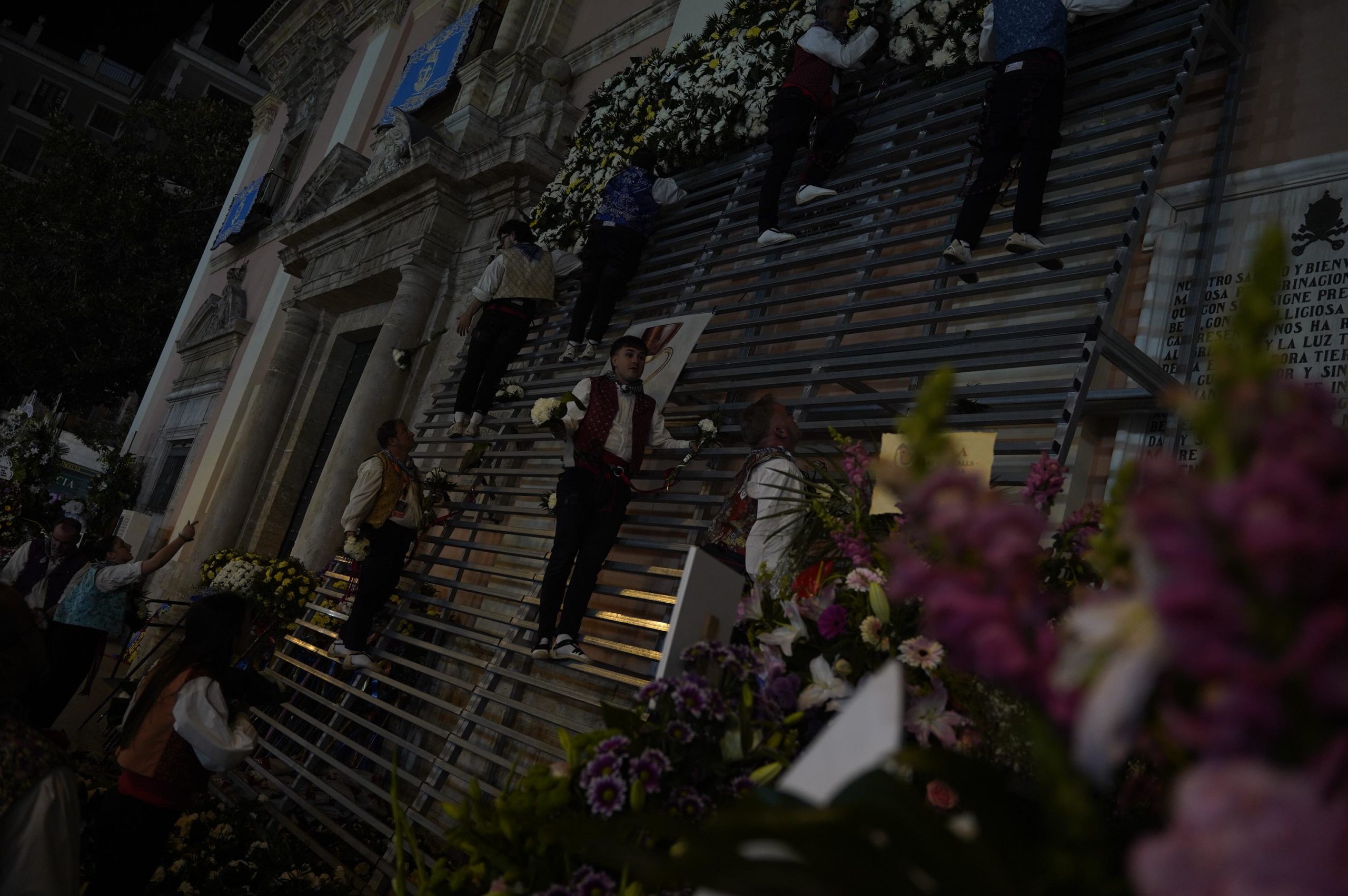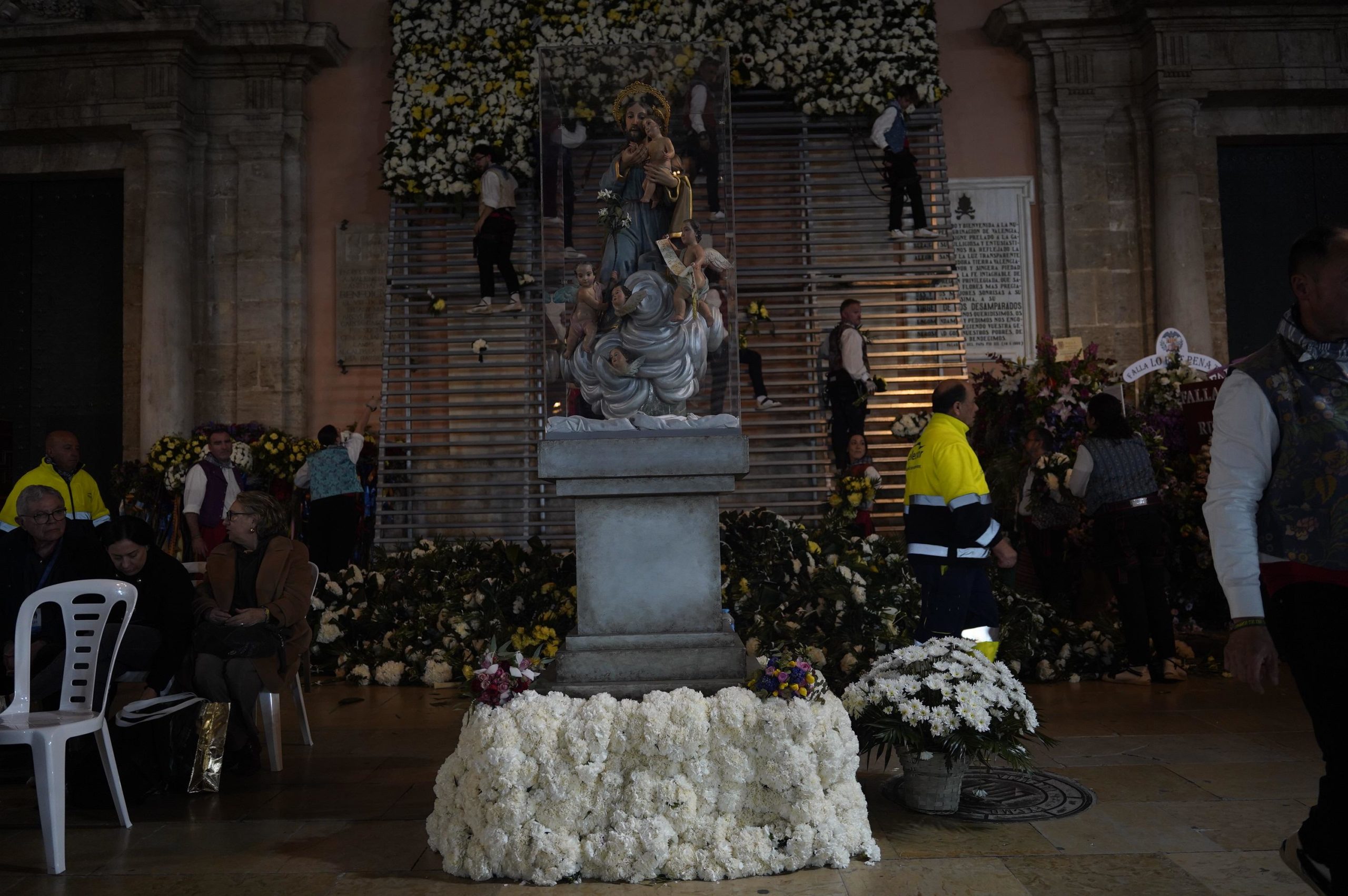 Los ramos de flores depositados han comenzado ya a dar forma al manto de la patrona, una de las imágenes más icónicas de las Fallas.