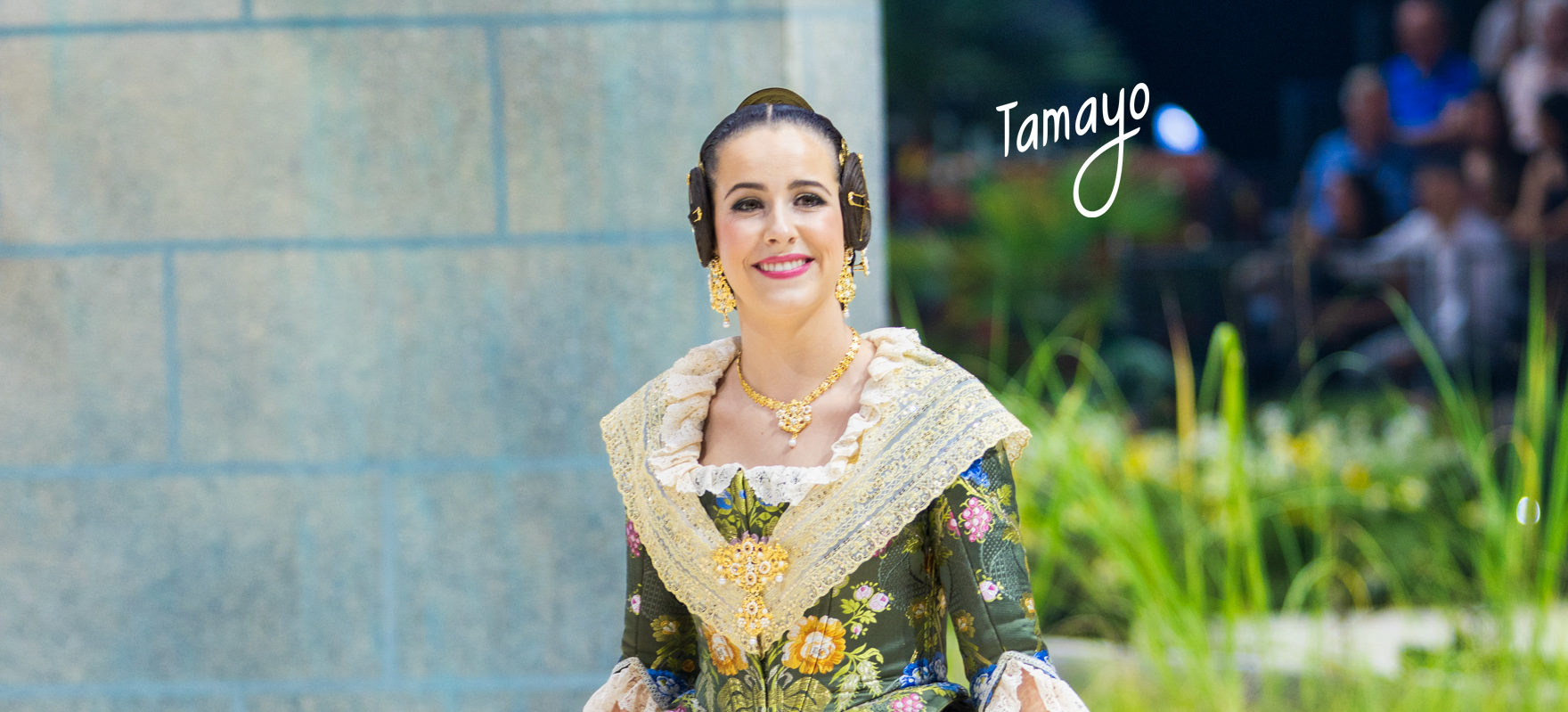 Para su elección como Fallera Mayor, Daniela confió en Amparo Fabra, eligiendo personalmente la tela de seda estrecha San Jaime en fondo piedra de Borghia, que bajo la luz adquiere un tono verde oliva oscuro.