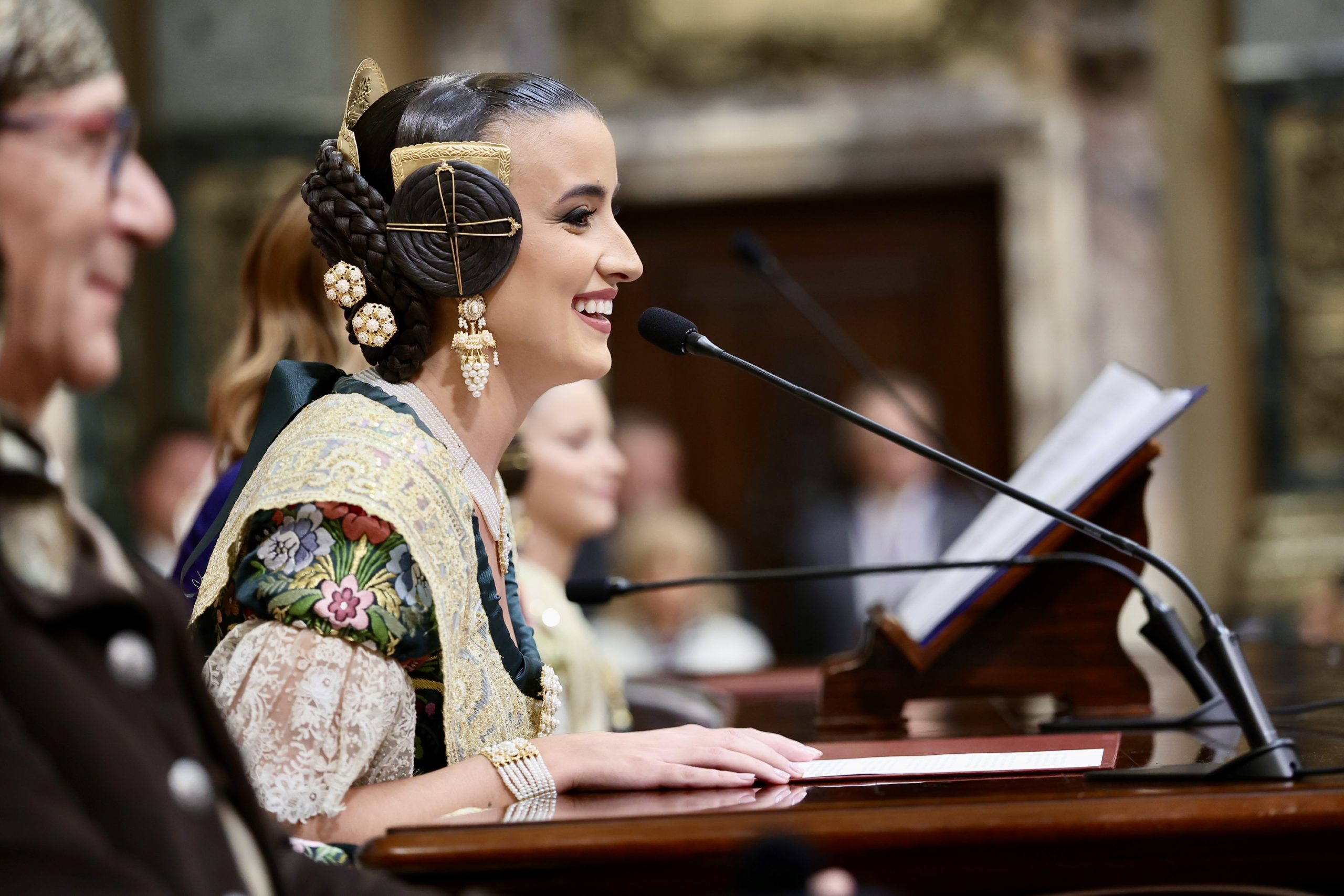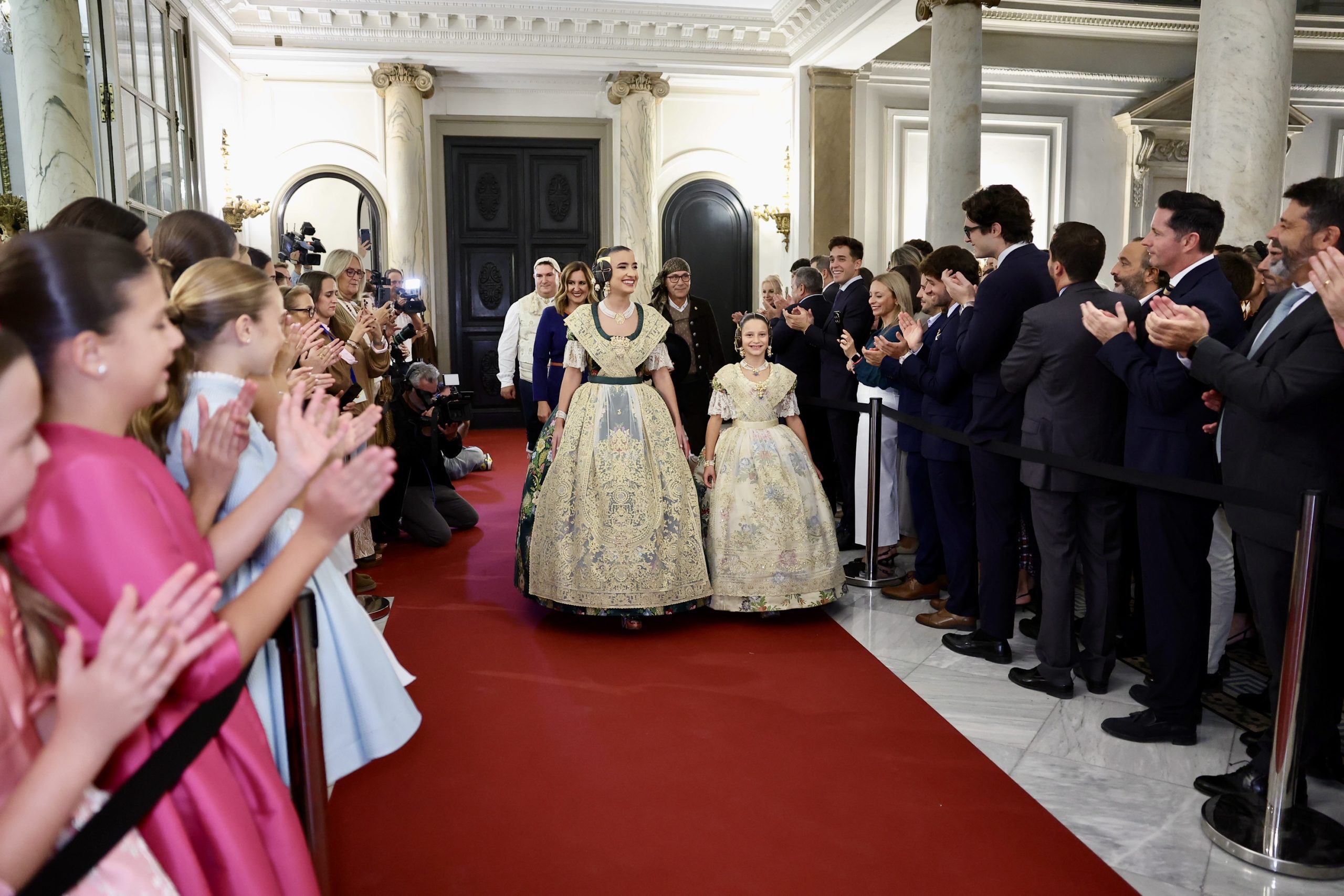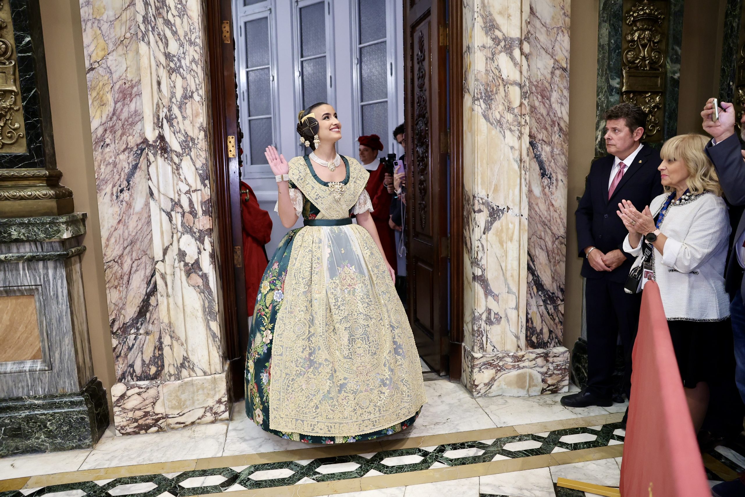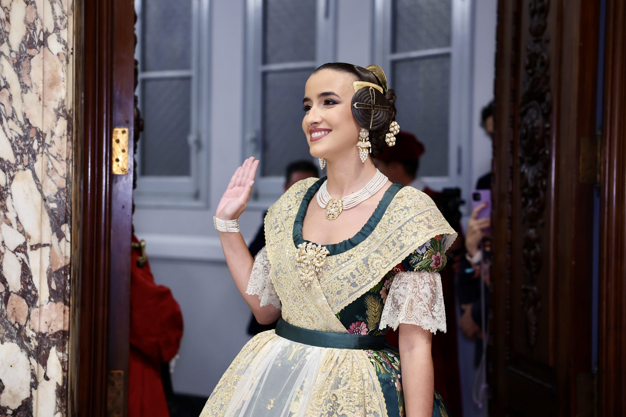 Las Falleras Mayores entraron al Salón de la Chimenea, un espacio emblemático donde se reunieron las autoridades, incluyendo concejales y representantes de las Fallas. Posteriormente, la ceremonia se trasladó al Hemiciclo del Ayuntamiento, donde la alcaldesa de Valencia proclamó a Berta Peiró como Fallera Mayor Infantil de Valencia 2025 y a Lucía García como Fallera Mayor de Valencia 2025. Ambas ofrecieron sus primeros discursos como máximas representantes de las Fallas, destacando su orgullo y compromiso con la fiesta.