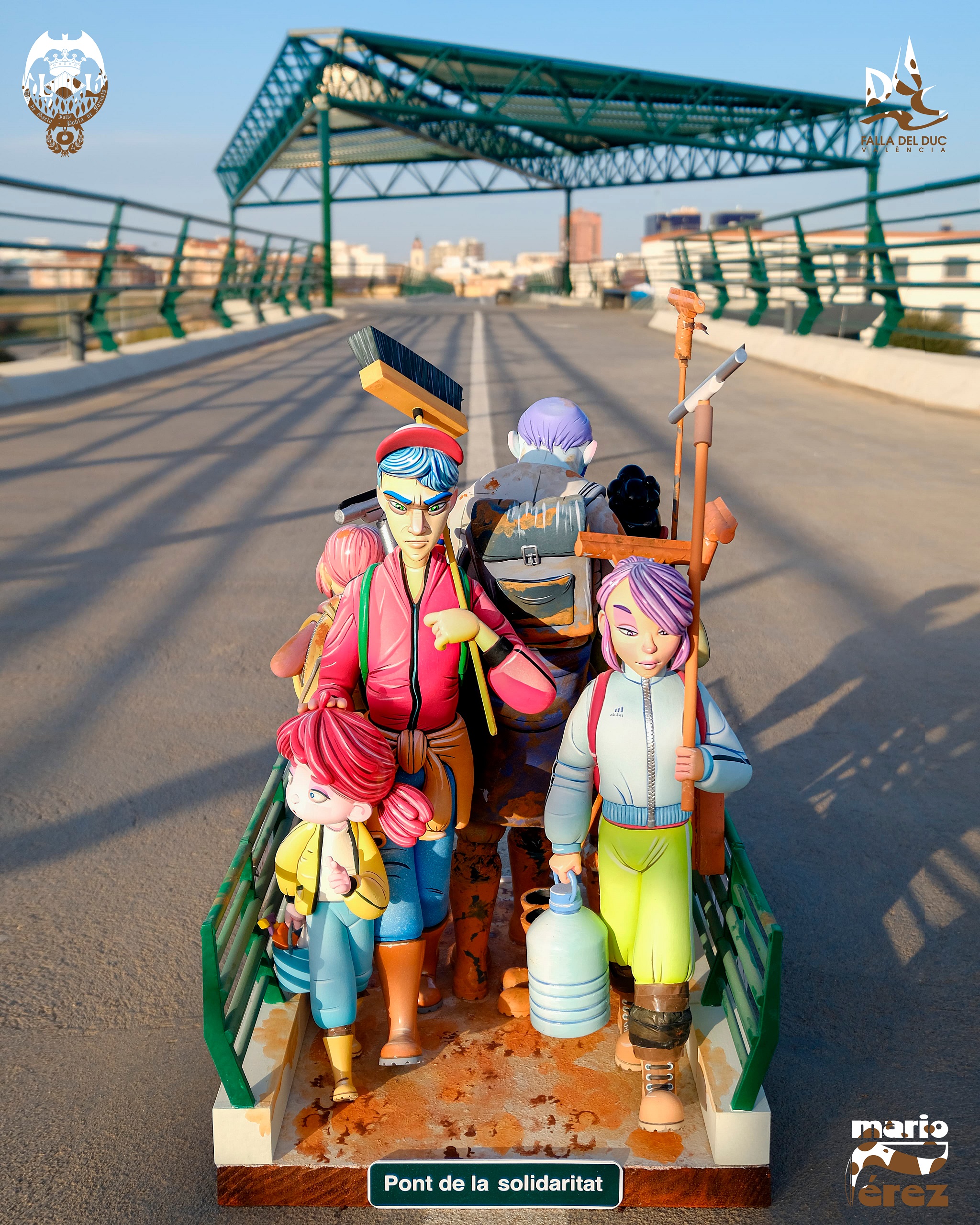 La Falla Duque de Gaeta – Pobla de Farnals vuelve a posicionarse como una de las grandes aspirantes al ninot indultat infantil en la Exposición del Ninot 2025. Después de conquistar este honor el año pasado con un emotivo homenaje al Alzheimer, la comisión sorprende de nuevo con una propuesta cargada de sensibilidad y compromiso social: “El Pont de la Solidaritat”, una obra que rinde tributo a los voluntarios que ayudaron en las devastadoras inundaciones provocadas por la DANA.